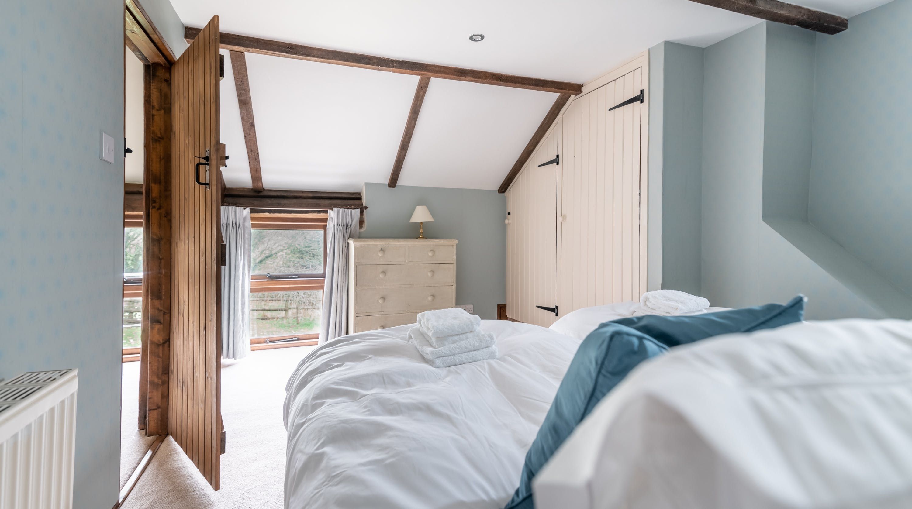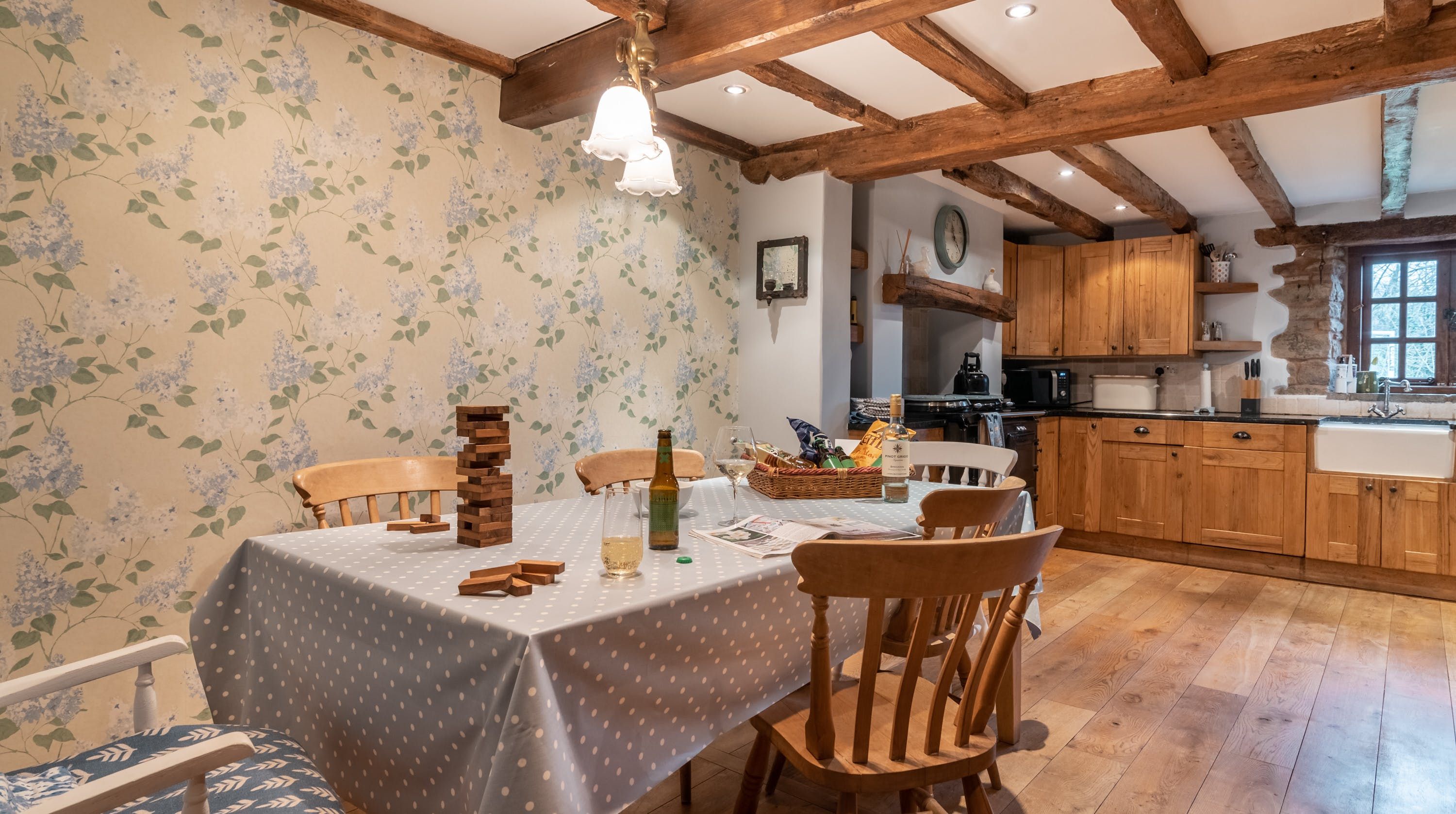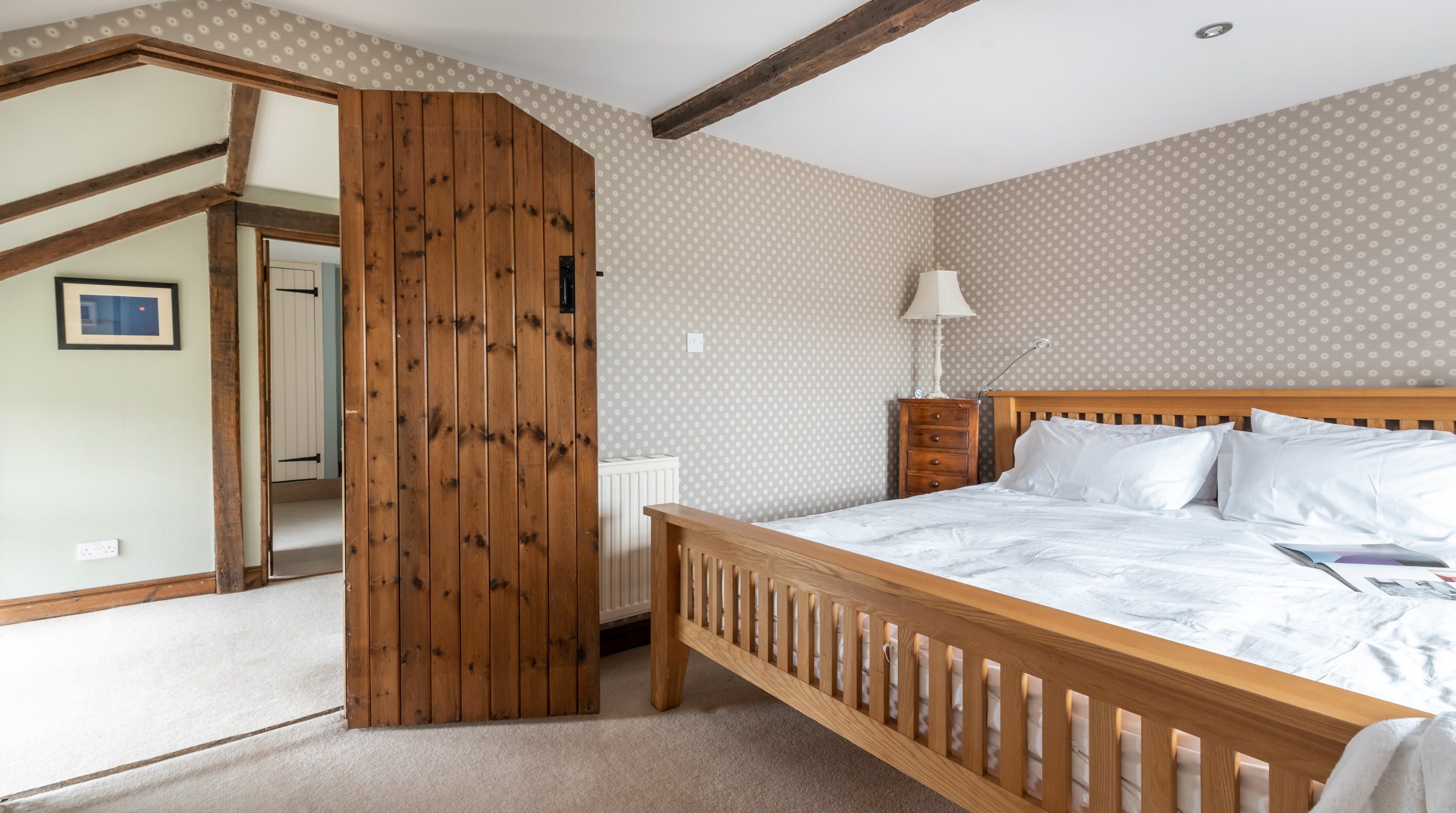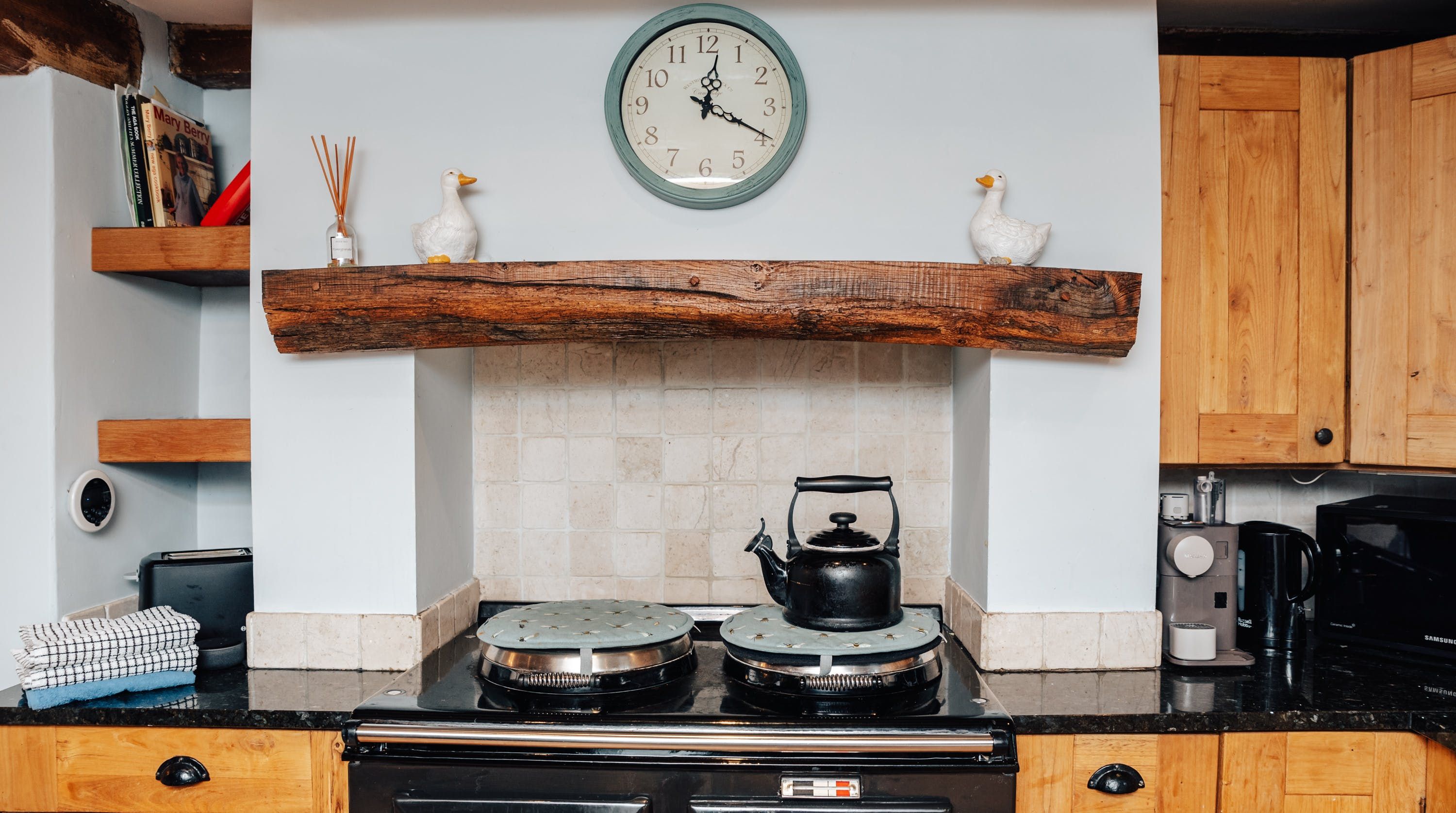Rolling countryside as far as the eye can see and quaint villages tucked into the valleys of Monmouthshire on your doorstep – this converted stone barn is an idyllic getaway. It’s a six-minute drive to the centre of Raglan where you can explore castle ruins, pop in to one of the cosy pubs or stock up at the traditional butcher and the local village shop. Further afield you’ll find the charming market town of Monmouth a fifteen-minute drive away. The home is blissfully quiet, with nothing but the occasional bleat of sheep or whinny of a horse in the surrounding fields. Out here, away from it all, you can see the canopy of stars from the private garden. During the day, this spot is perfect for a family barbecue, with dining on the patio. Inside, it’s open-plan living made cosy with a wood-burning stove set in the old stone wall of the living room. Period features like the old timber frame and arrow-slit windows have been retained, showing off the age of the building. The Aga and Belfast sink in the kitchen keep that farmhouse feel, perfect when paired with farm-fresh produce from the hole-in-the-wall farm shop just down the road.