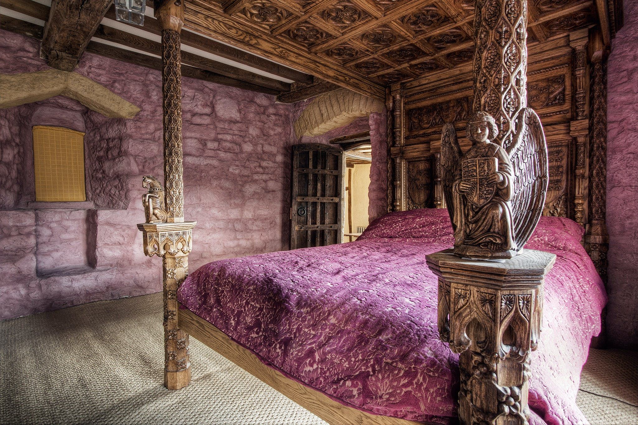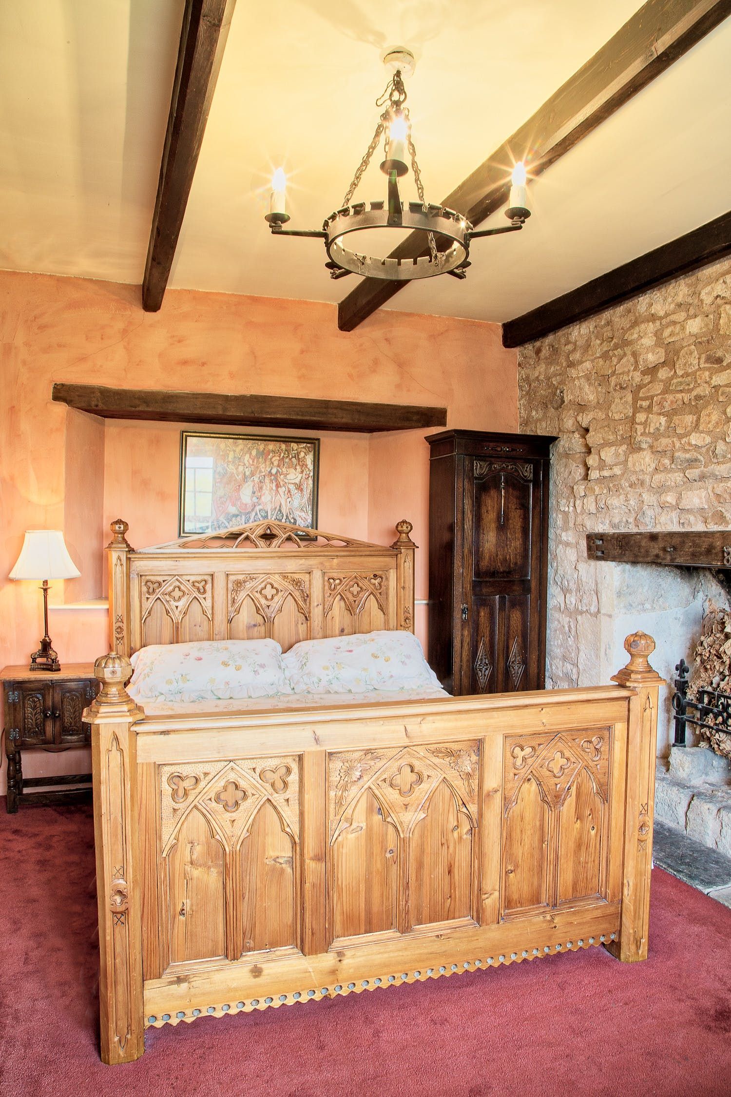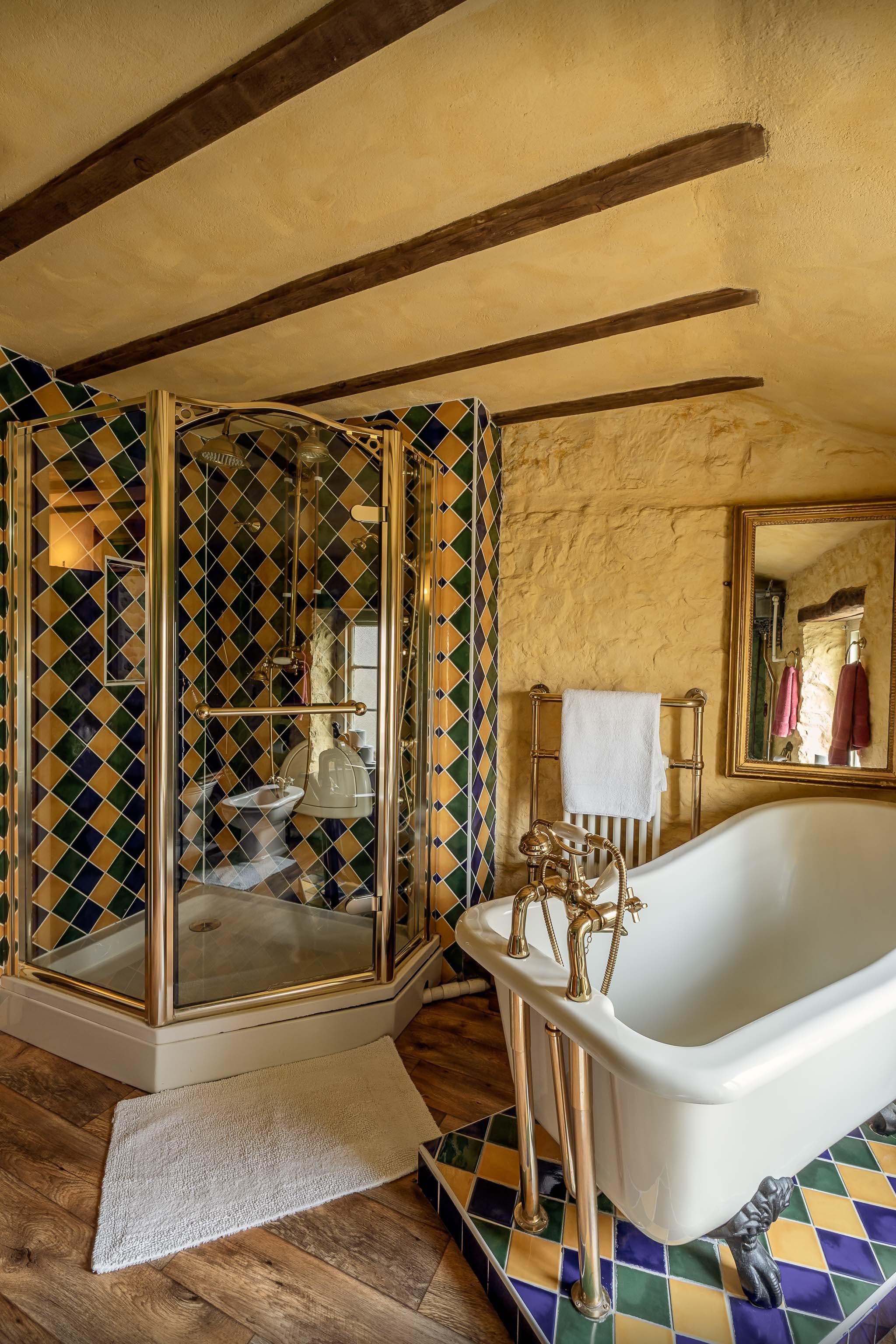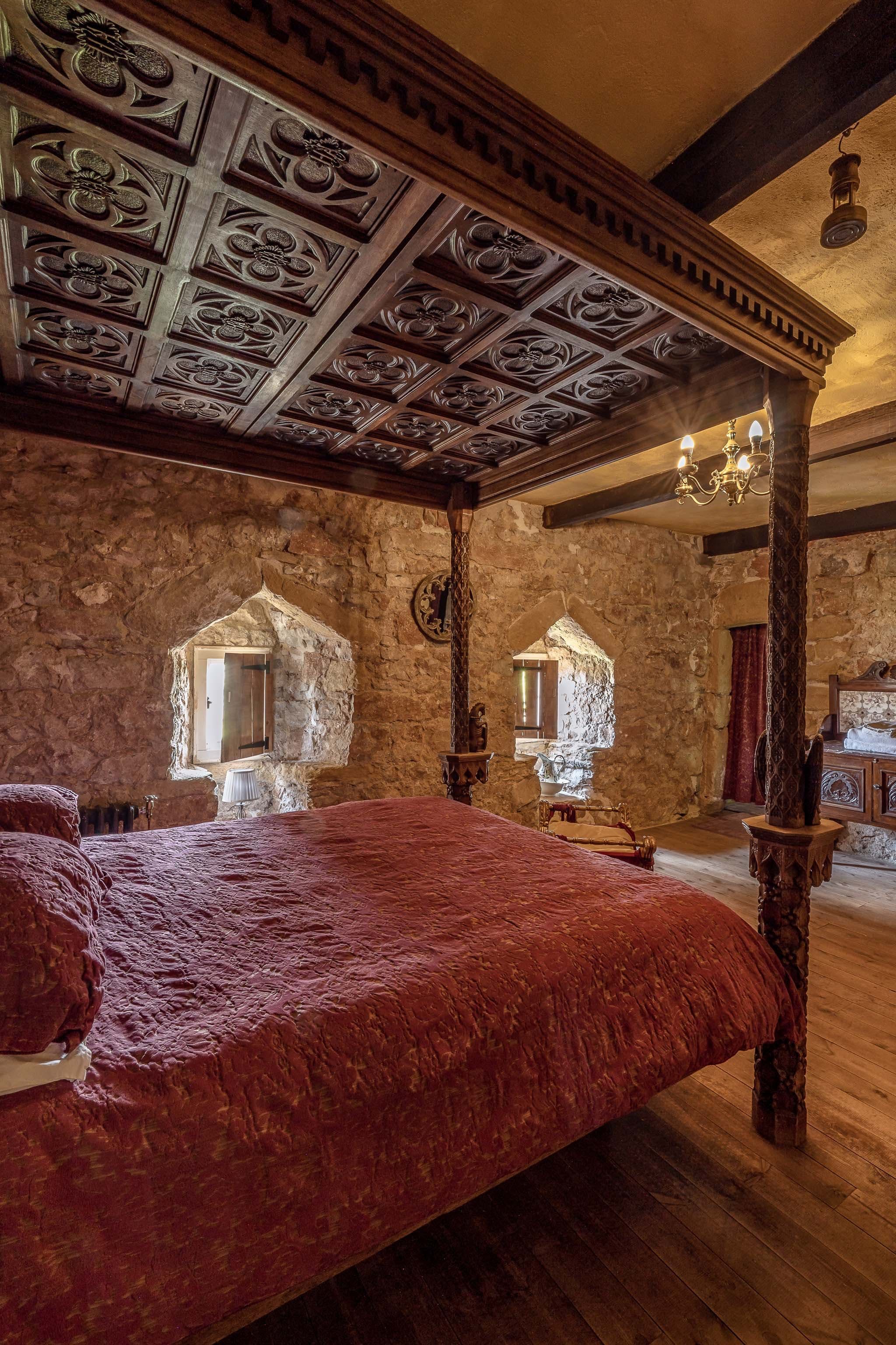 You’ll have access to the first and second floor of the home, which are packed with historic charm and traditional details. We love the spiral staircases and narrow corridors leading to cosy corners and antique furniture. Exposed stone walls and dark timber beams add to the characterful decor of this memorable home. The master bedroom features a wood-carved four-poster bed with intricate artistry, and a roll-top bath in the nearby bathroom.