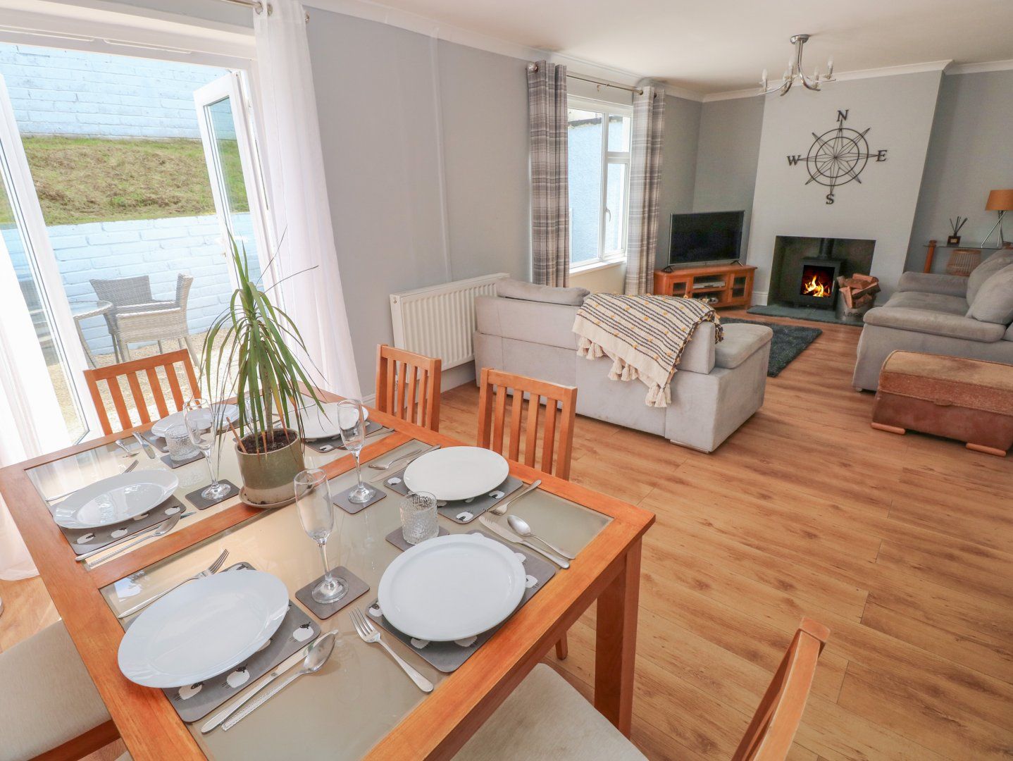 Three bedrooms: 1 x double, 1 x bunk, 1 x triple bunk. Bathroom with bath, shower over, basin and WC. Kitchen. Living/dining room with woodburning stove. Games room