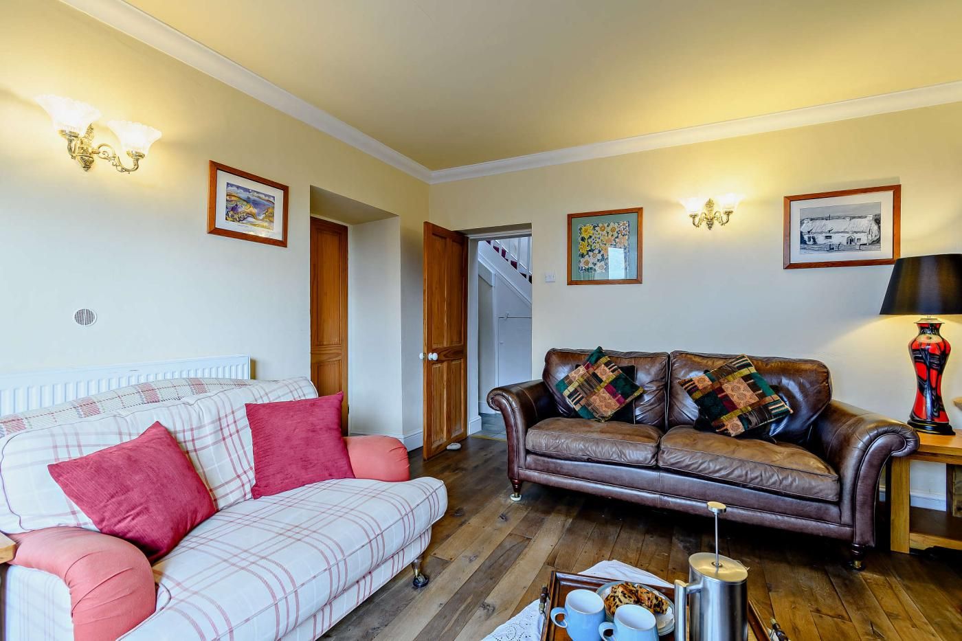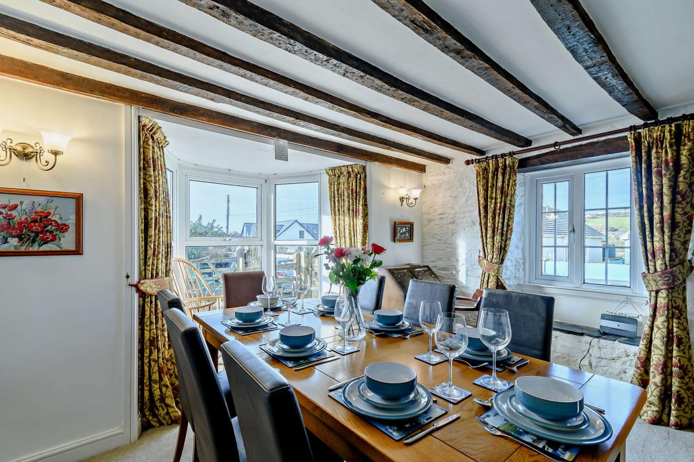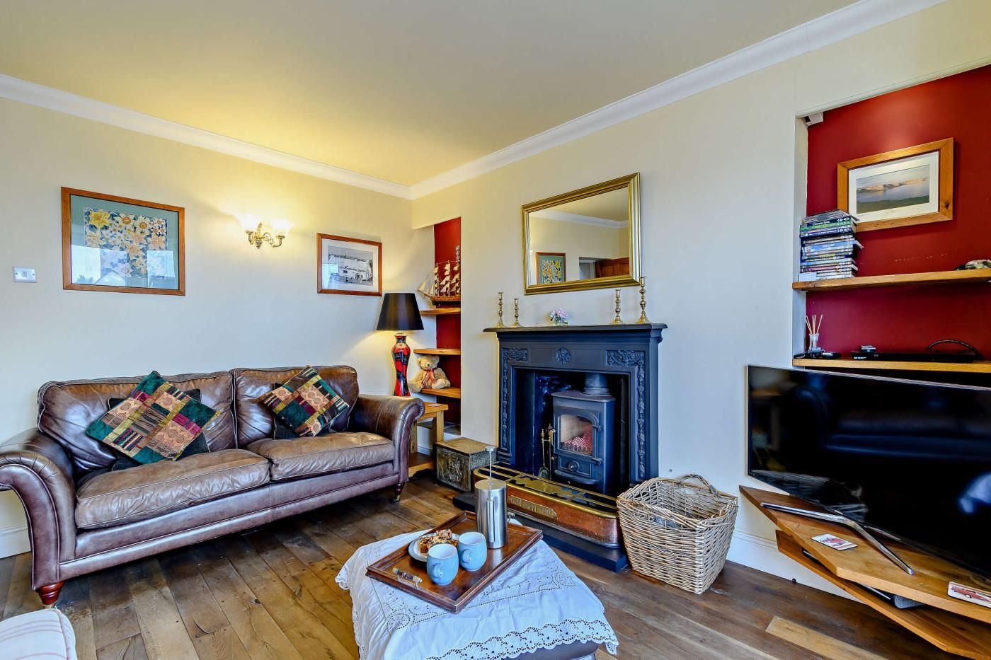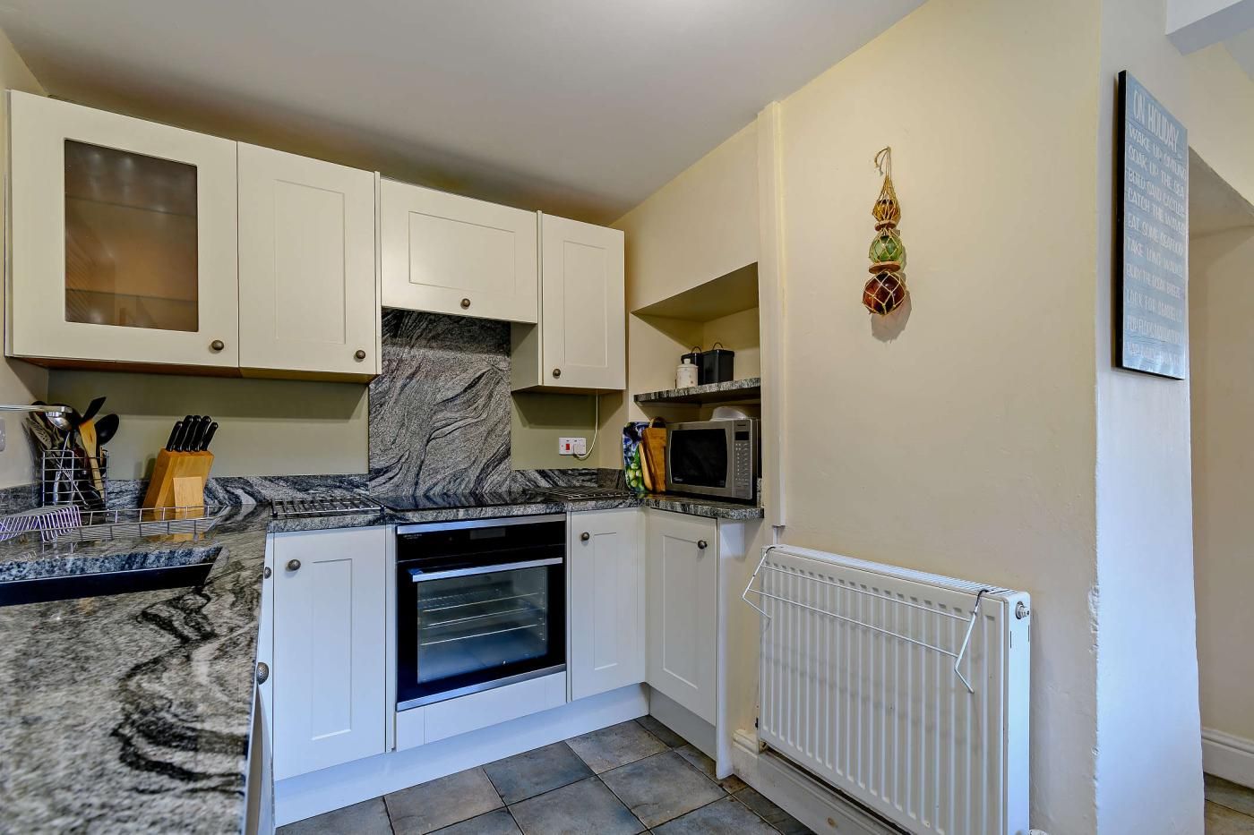 Inside, the cottage features a spacious dining room with sea views and feature stone walls leading into the lounge area, where a cast iron multi-fuel burner adds a cosy touch. The lounge is furnished with two three-seater leather sofas, a two-seater sofa, and a Smart TV for enjoyable evenings in.