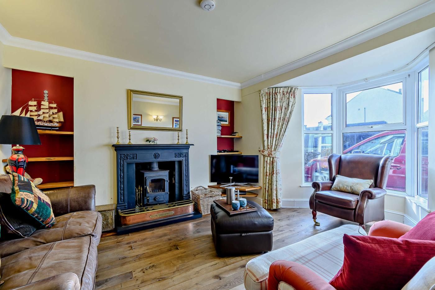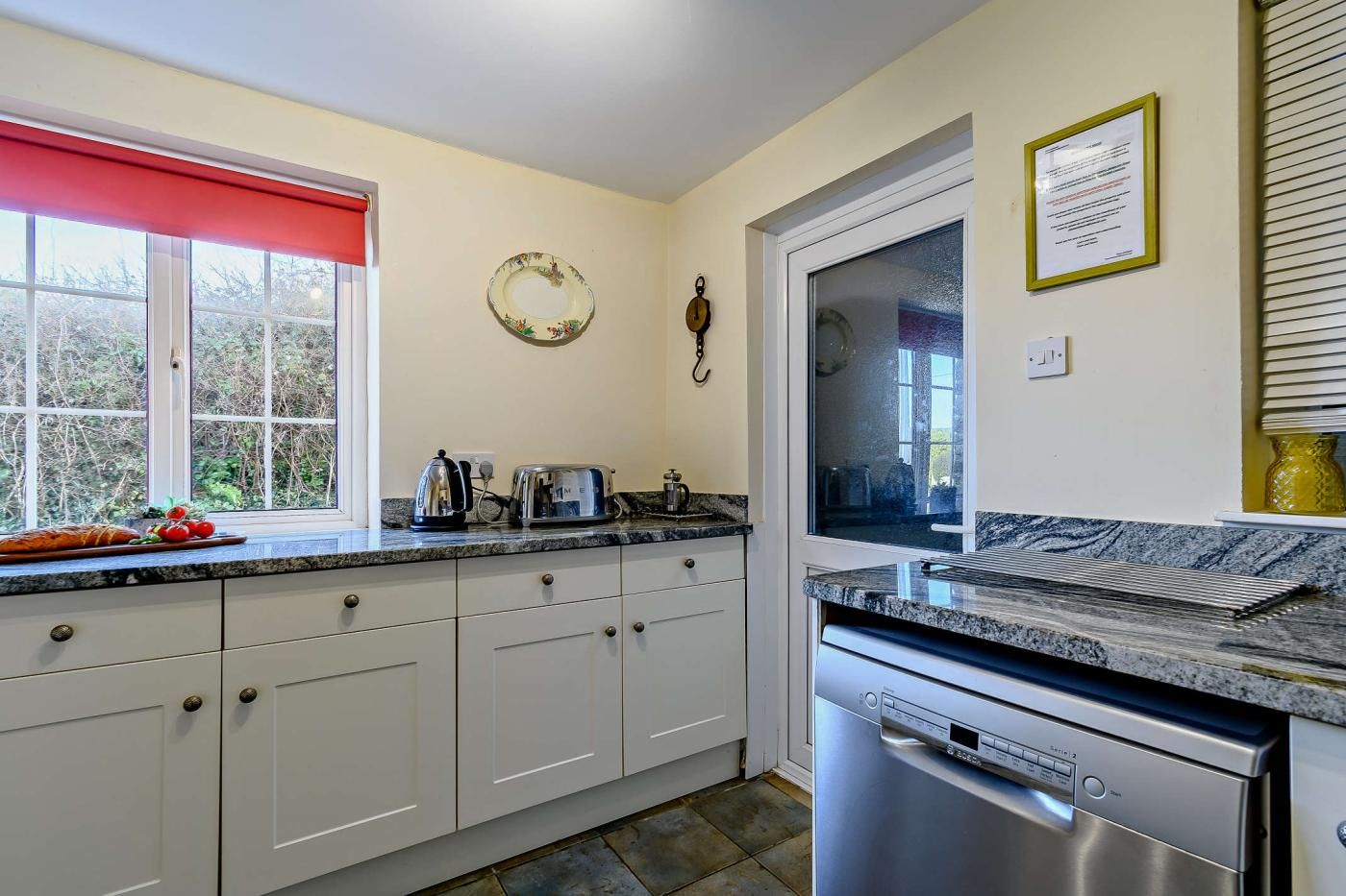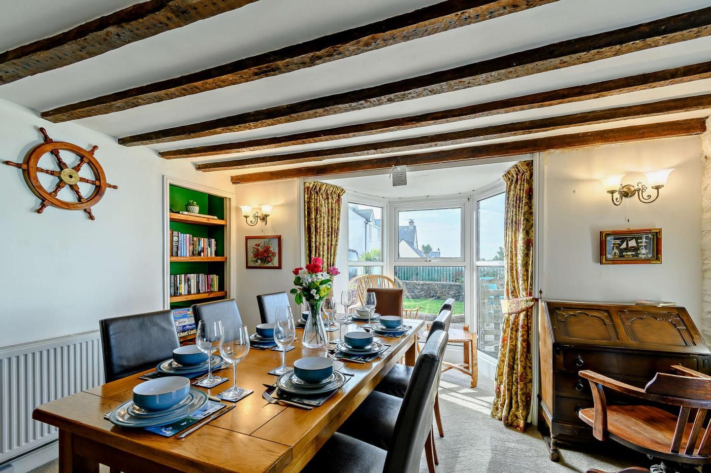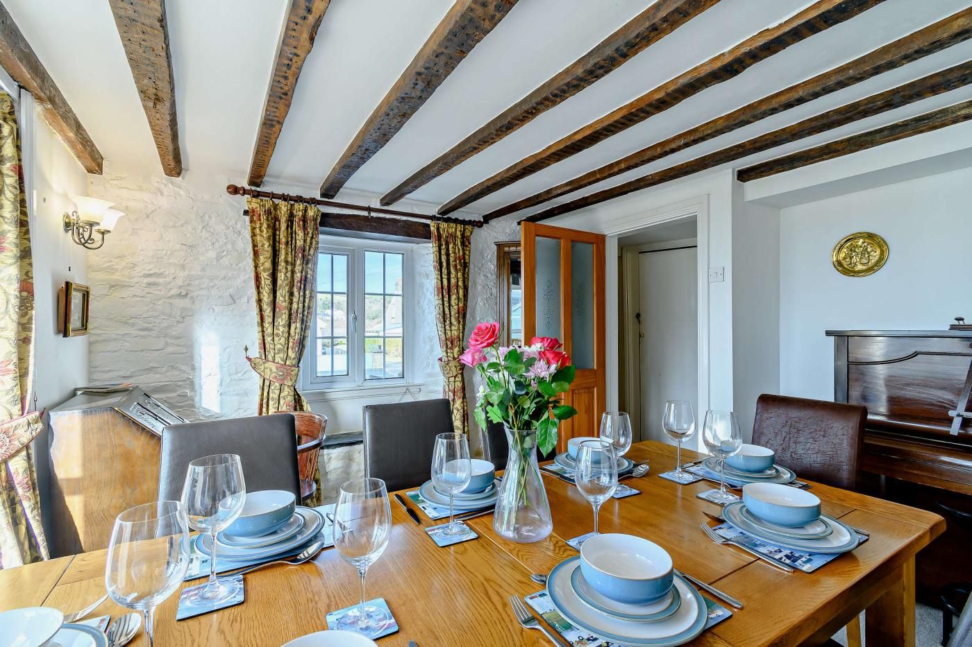 Inside, the cottage features a spacious dining room with sea views and feature stone walls leading into the lounge area, where a cast iron multi-fuel burner adds a cosy touch. The lounge is furnished with two three-seater leather sofas, a two-seater sofa, and a Smart TV for enjoyable evenings in.