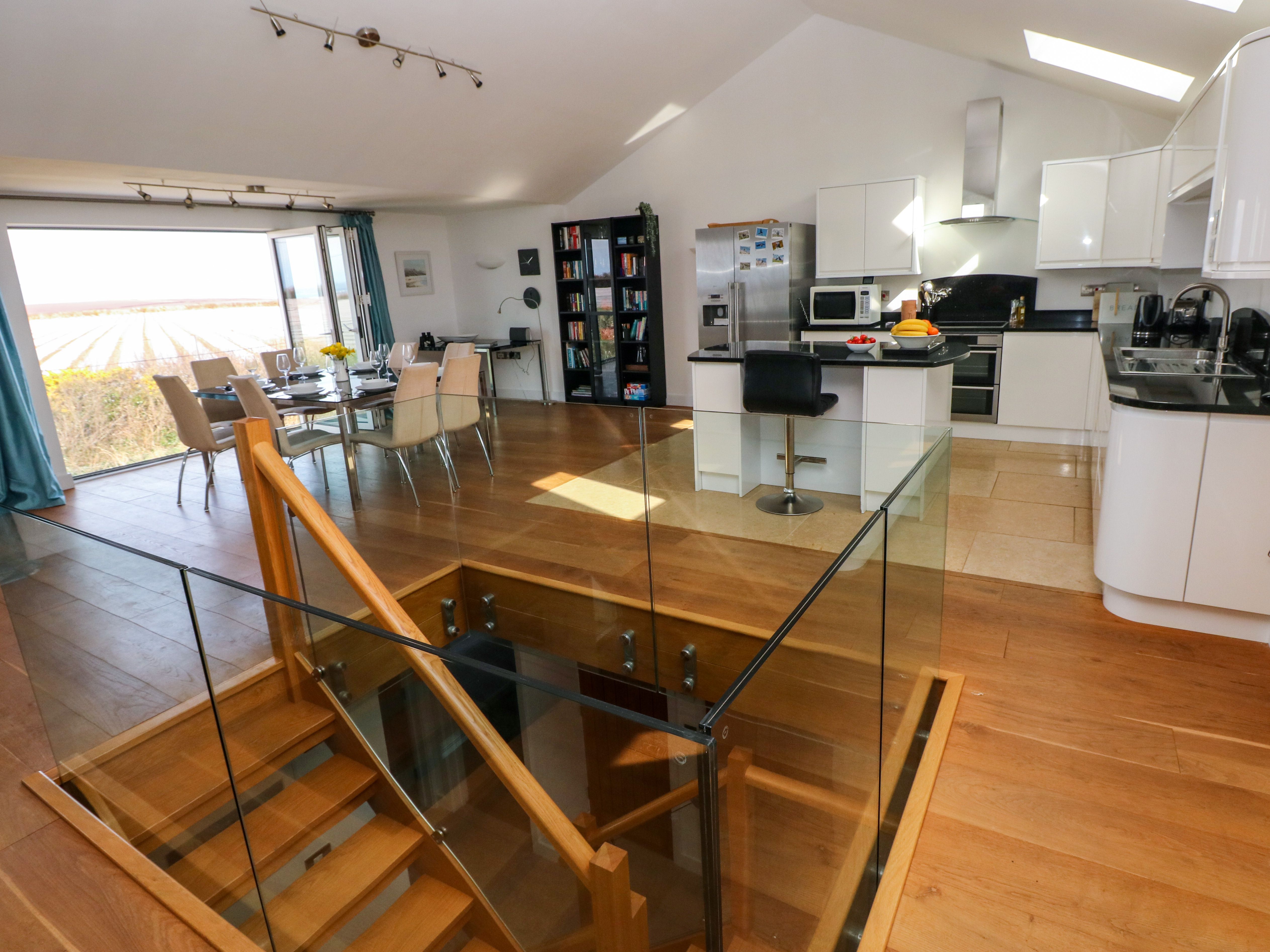 Amenities Ground source underfloor heating with wood burning stove. Double oven, grill and induction hob, microwave, American style fridge/freezer, washer/dryer, dishwasher, TV, DVD, iPod dock, WiFi, telephone use on honesty basis, selection of books, games and DVDs. Fuel and power inc. in rent. Electric Vehicles: This property does not have a charge point for electric vehicles and charging from within the property is prohibited. Bed linen and towels inc. in rent (please bring your own beach towels). Off road parking for three cars. Storage for bikes and surfboards in garage, drying space for washing. Patio with decking, large table and chairs. One well-behaved pet welcome (additional charges apply). Sorry, no smoking. Property not suitable for children under 6 or the infirm, due to the oak and glass staircase. Shop and pub 10 mins walk, coast 1.5 miles. Please Note: Not suitable for more than 4 adults as twin rooms are small.