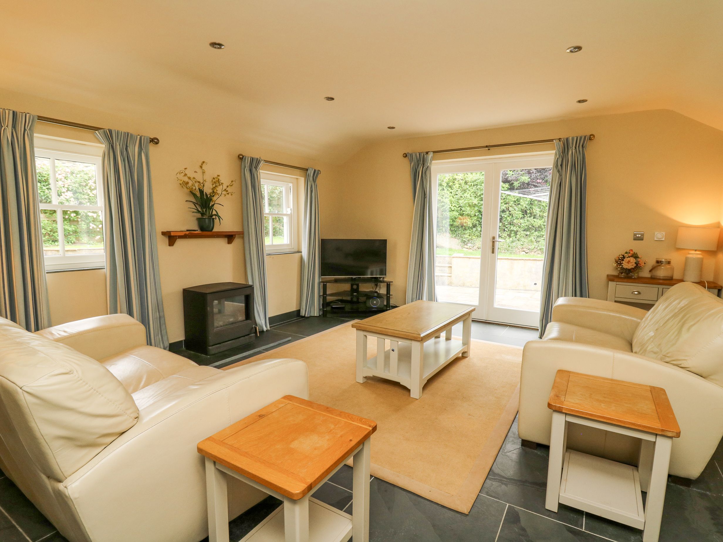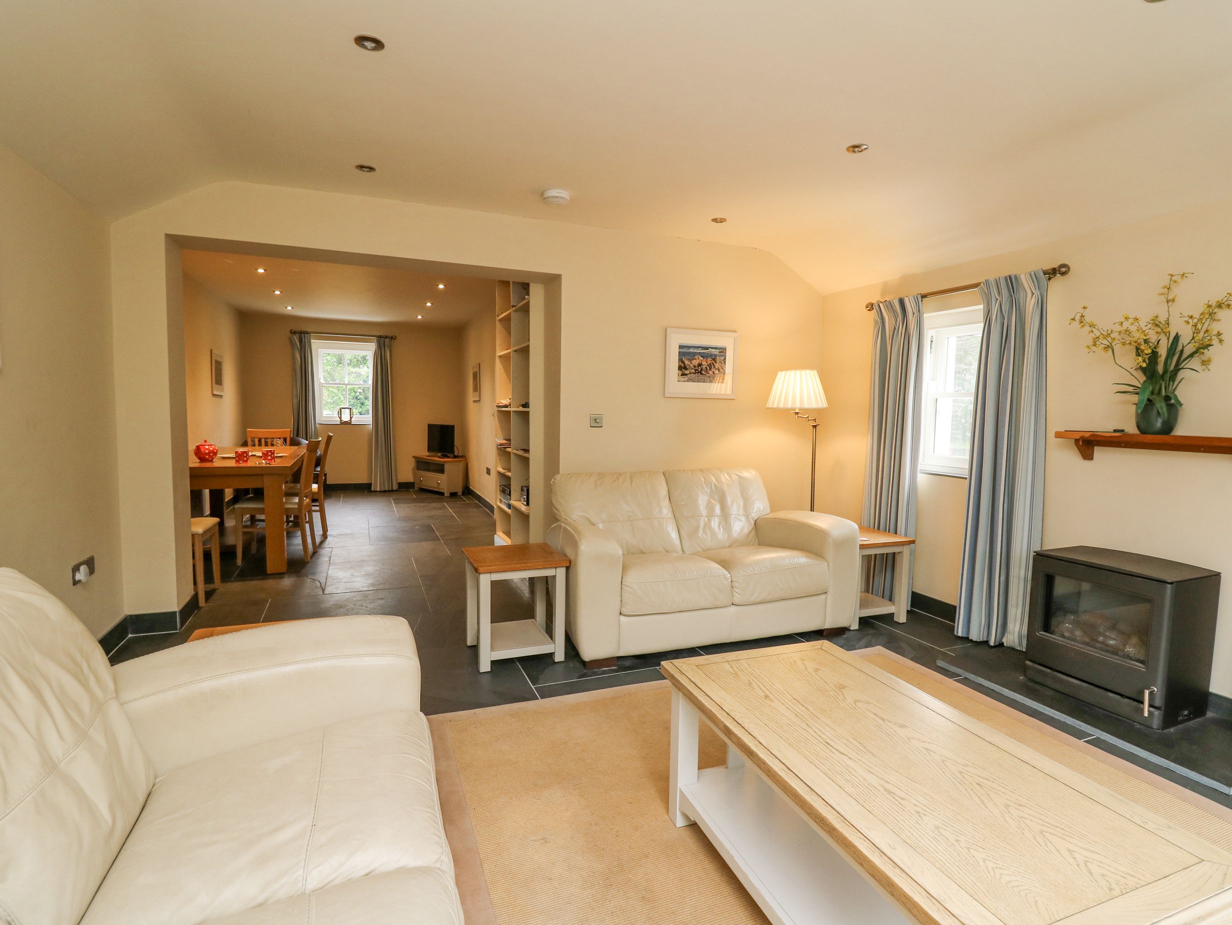 Accomodation Details Three bedrooms: 1 x king-size with TV and en-suite walk-in shower, basin, and WC, 2 x twin with TV. Bathroom with bath, walk-in shower, handheld shower, basin, and WC. Cloakroom with basin and WC. Kitchen. Living/dining room. Sitting room with electric fire