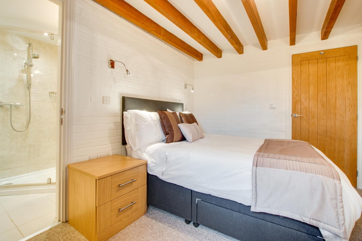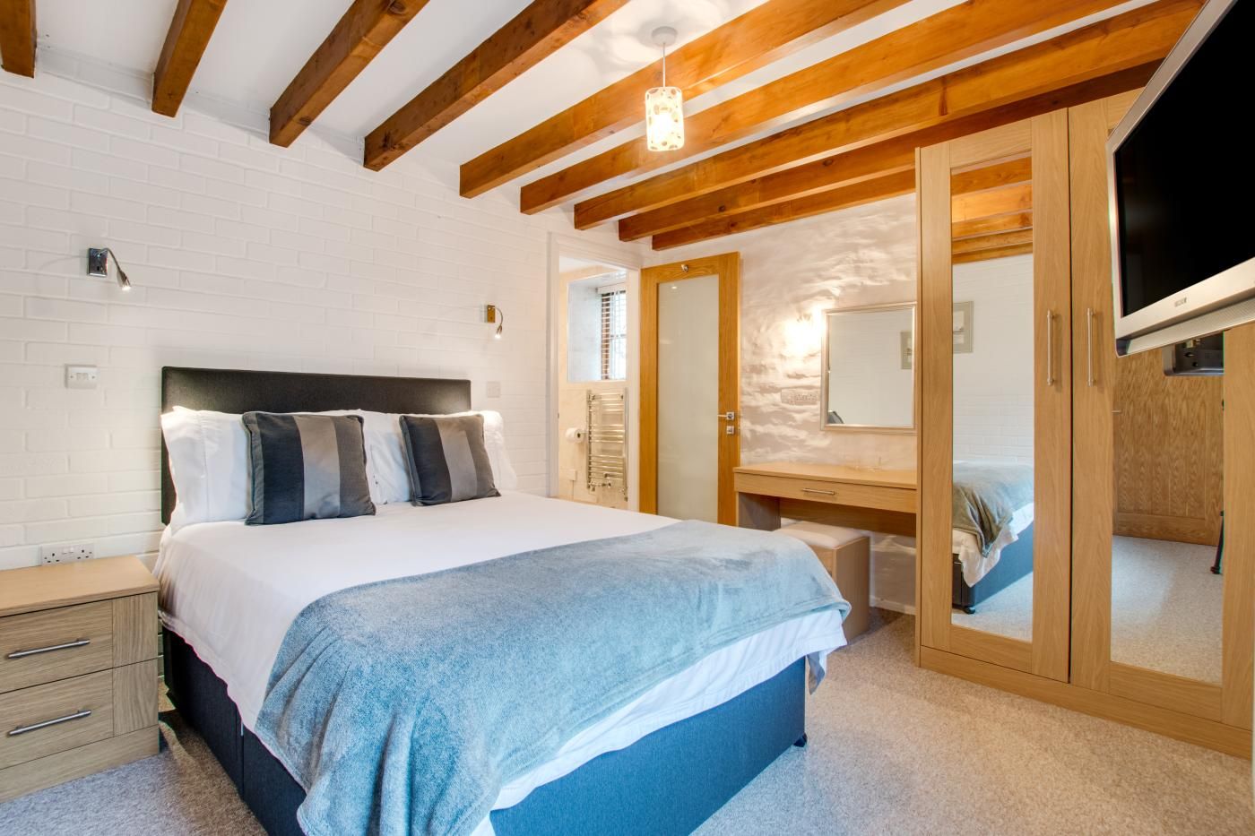 Exposed beams, whitewashed stone walls, wood flooring and a creamy colour palette set the scene for a relaxing stay at this two-bedroom holiday abode.