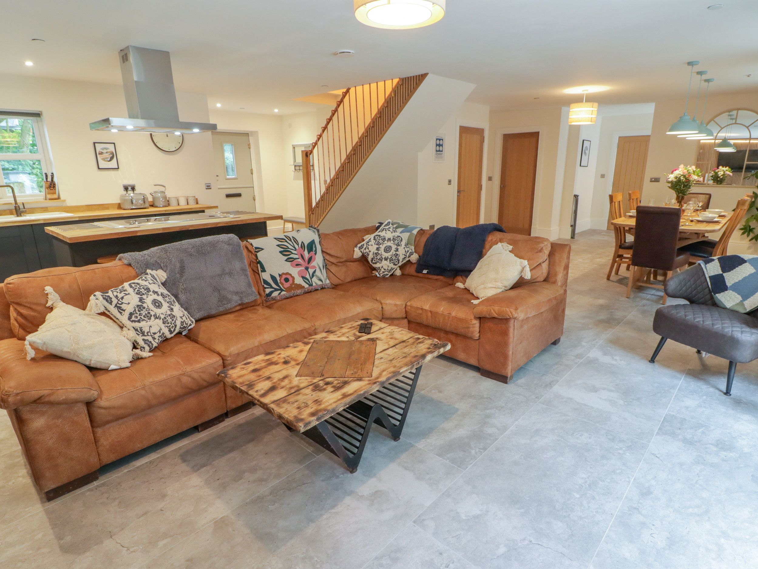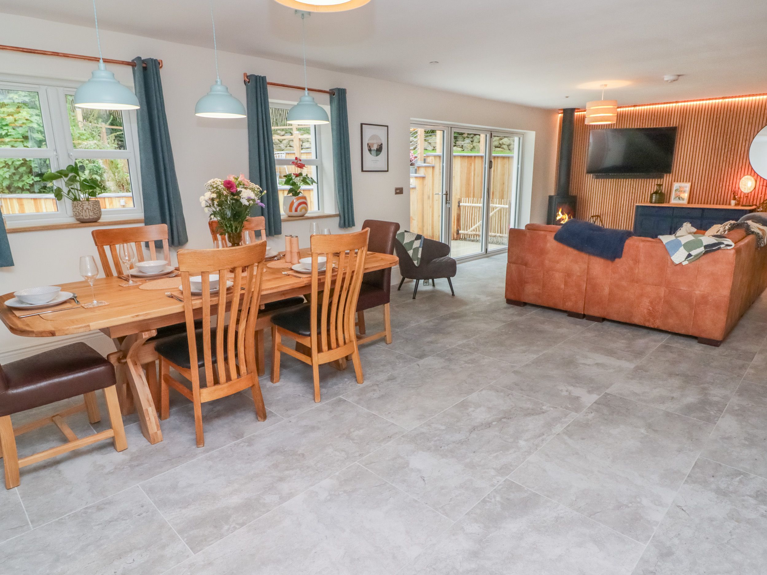 Three bedrooms: 1 x ground-floor king-size, 1 x king-size with en-suite walk-in shower, basin, heated towel rail, and WC, 1 x king-size with en-suite walk-in shower, basin, and WC. Ground-floor bathroom with bath, shower over, basin, heated towel rail, and WC. Open-plan living space with kitchen, dining area, and sitting area with woodburning stove. Utility