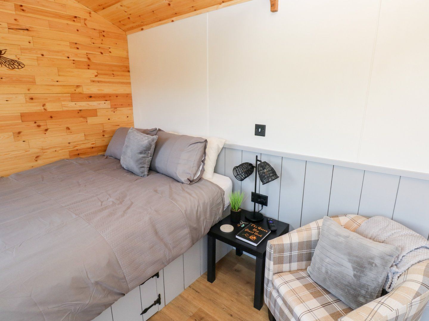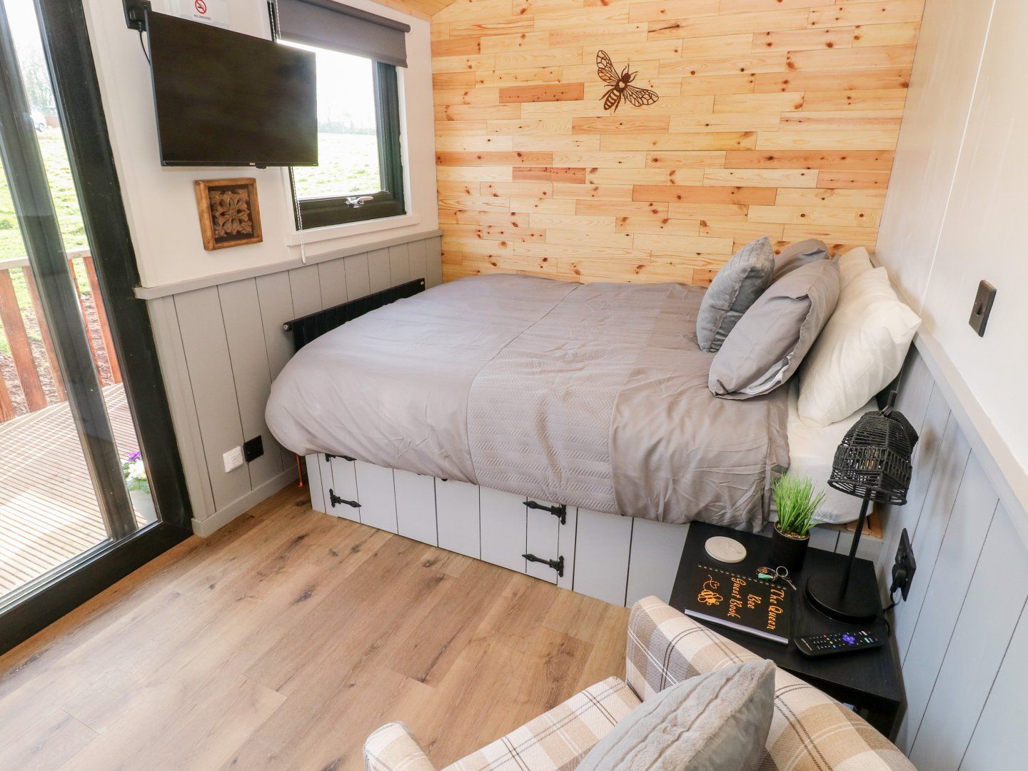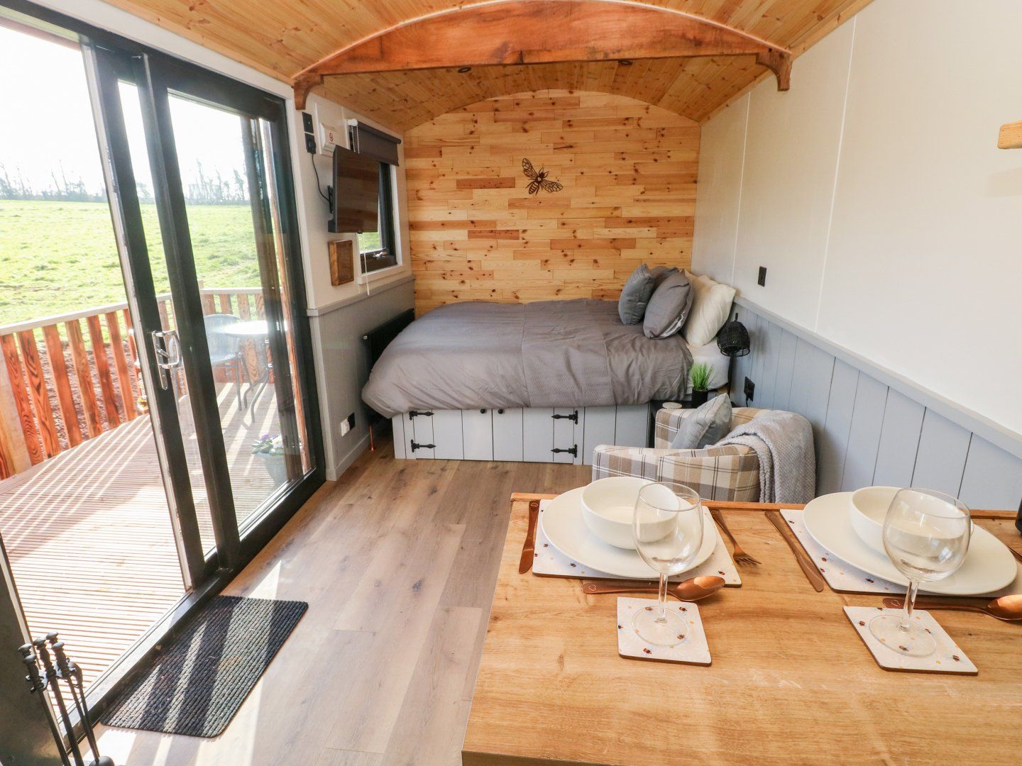 The living areas in this single-storey shepherd's hut consists of a studio-style layout with kitchenette, dining area, and sitting area with a combi microwave/oven, two-ring halogen hob, fridge, Smart TV, woodburning stove, and a king-size bed. There's also a shower room. Outside there is a private decked area with furniture, a shared lawned area, and off-road parking for one car. Park up to the front of the plot and travel down through the shared lawn, enjoying your rural position. Within 1.2 miles you will find a shop and a pub and please note, this is a smoke-free property. One well behaved dog welcome but must be kept on the lead and under control as there are animals in the vicinity. WiFi, fuel, power, bed linen and towels are all included in the price. The Queen Bee is a wonderful escape for a romantic break to Pembrokeshire. Note: There are steps to the exterior of the property.