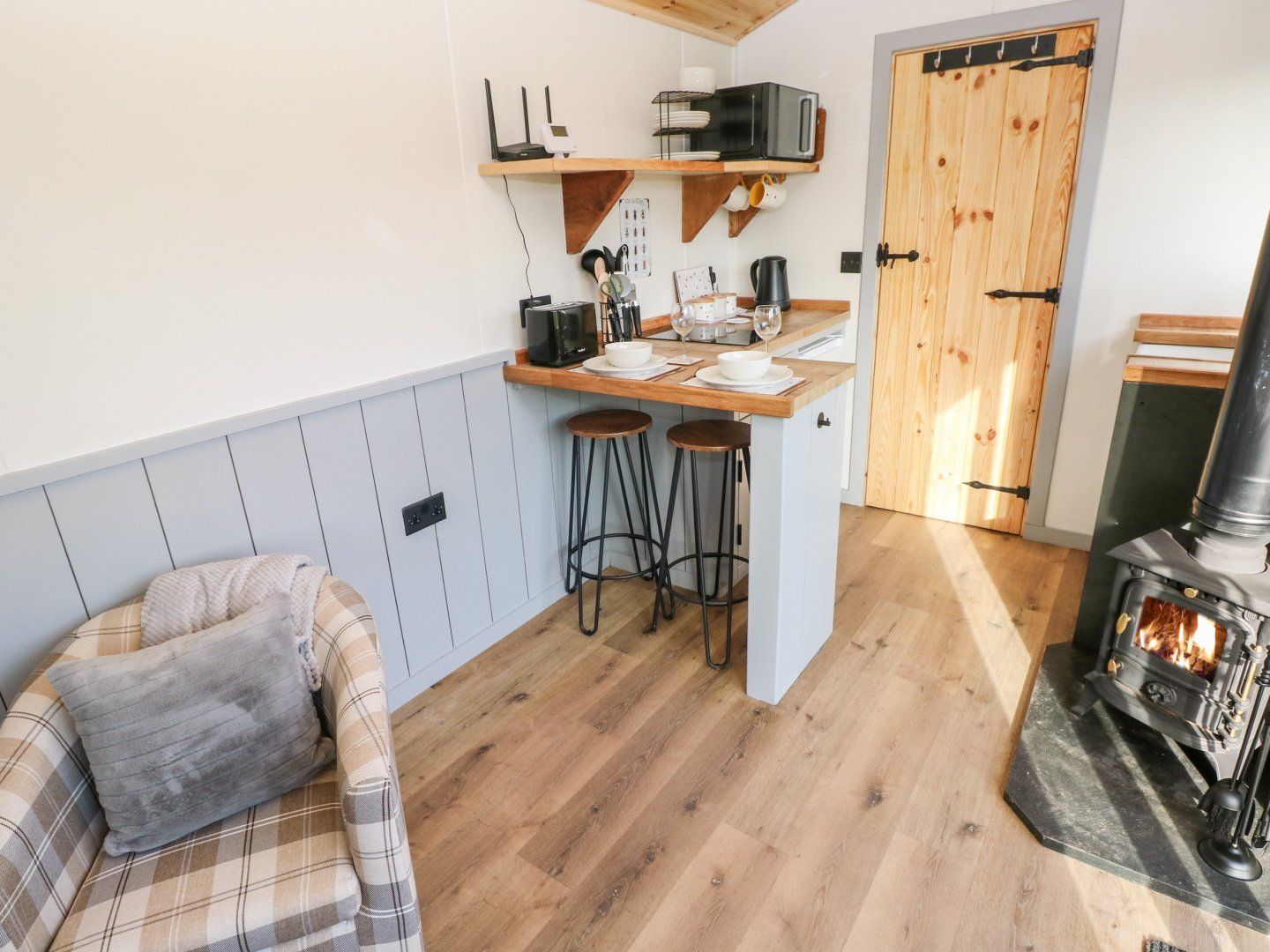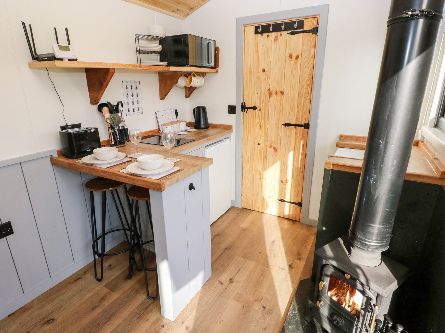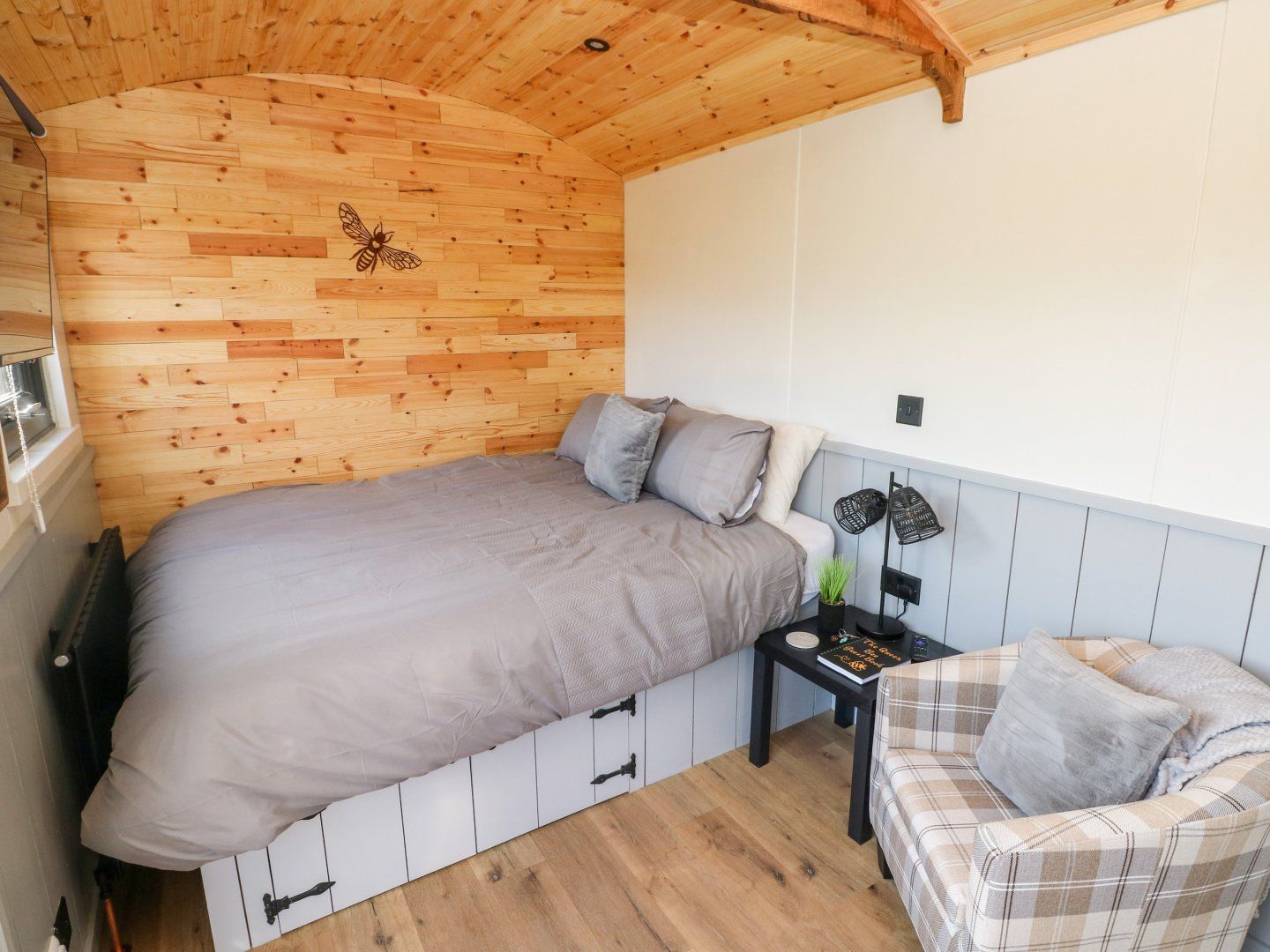 The living areas in this single-storey shepherd's hut consists of a studio-style layout with kitchenette, dining area, and sitting area with a combi microwave/oven, two-ring halogen hob, fridge, Smart TV, woodburning stove, and a king-size bed. There's also a shower room. Outside there is a private decked area with furniture, a shared lawned area, and off-road parking for one car. Park up to the front of the plot and travel down through the shared lawn, enjoying your rural position. Within 1.2 miles you will find a shop and a pub and please note, this is a smoke-free property. One well behaved dog welcome but must be kept on the lead and under control as there are animals in the vicinity. WiFi, fuel, power, bed linen and towels are all included in the price. The Queen Bee is a wonderful escape for a romantic break to Pembrokeshire. Note: There are steps to the exterior of the property.