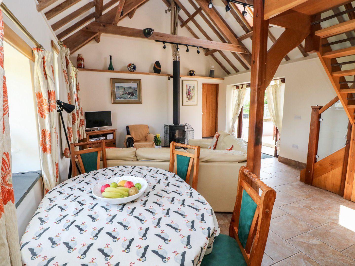 Amenities Eco-friendly underfloor heating with woodburner. Electric oven and hob, microwave, fridge, washing machine and tumble dryer in utility, dishwasher, TV with Freeview, DVD, CD/radio, WiFi, selection of books, games and DVDs. Fuel, power and starter pack for woodburner inc. in rent. Bed linen and towels inc. in rent, please bring own beach towels. Cot, highchair and stairgate. Off road parking for 3 cars. Front enclosed lawned garden with patio and furniture. One well-behaved dog welcome. Sorry, no smoking. Shop, pub and beach 2.5 miles. Note: Small / medium Dogs only, Dogs must to be kept on a lead when not in garden due to farm animals. Note: Part of the stairs are open tread and very low beams in first floor bedroom and bathroom, care to be taken. Note: Steps into the property and one step into ground floor double bedroom. Note: Sitting area and twin bedroom on the first floor are separated by a curtain. Note: An annexe sleeping two people is attached to The Long Barn. Note: Property is not suitable for wheelchair users due to limited space