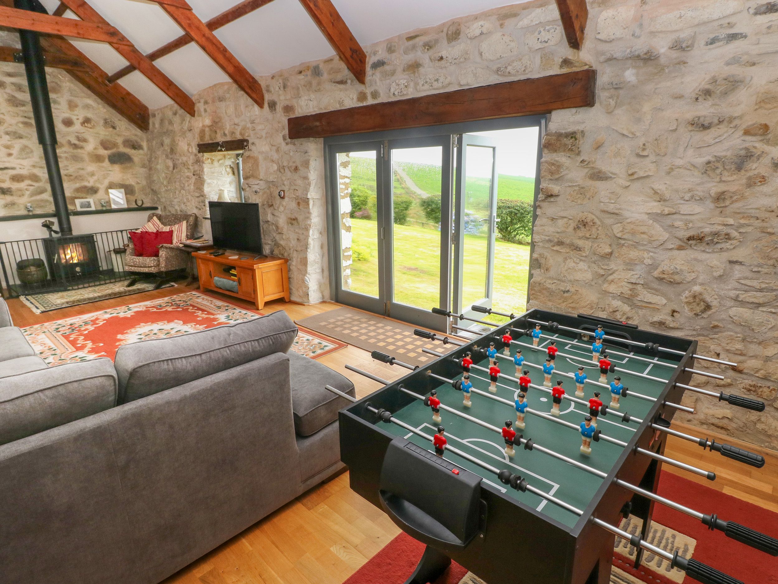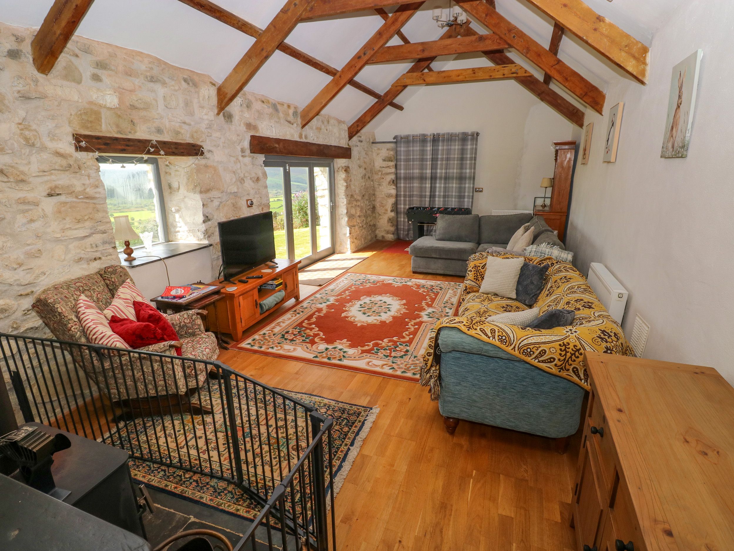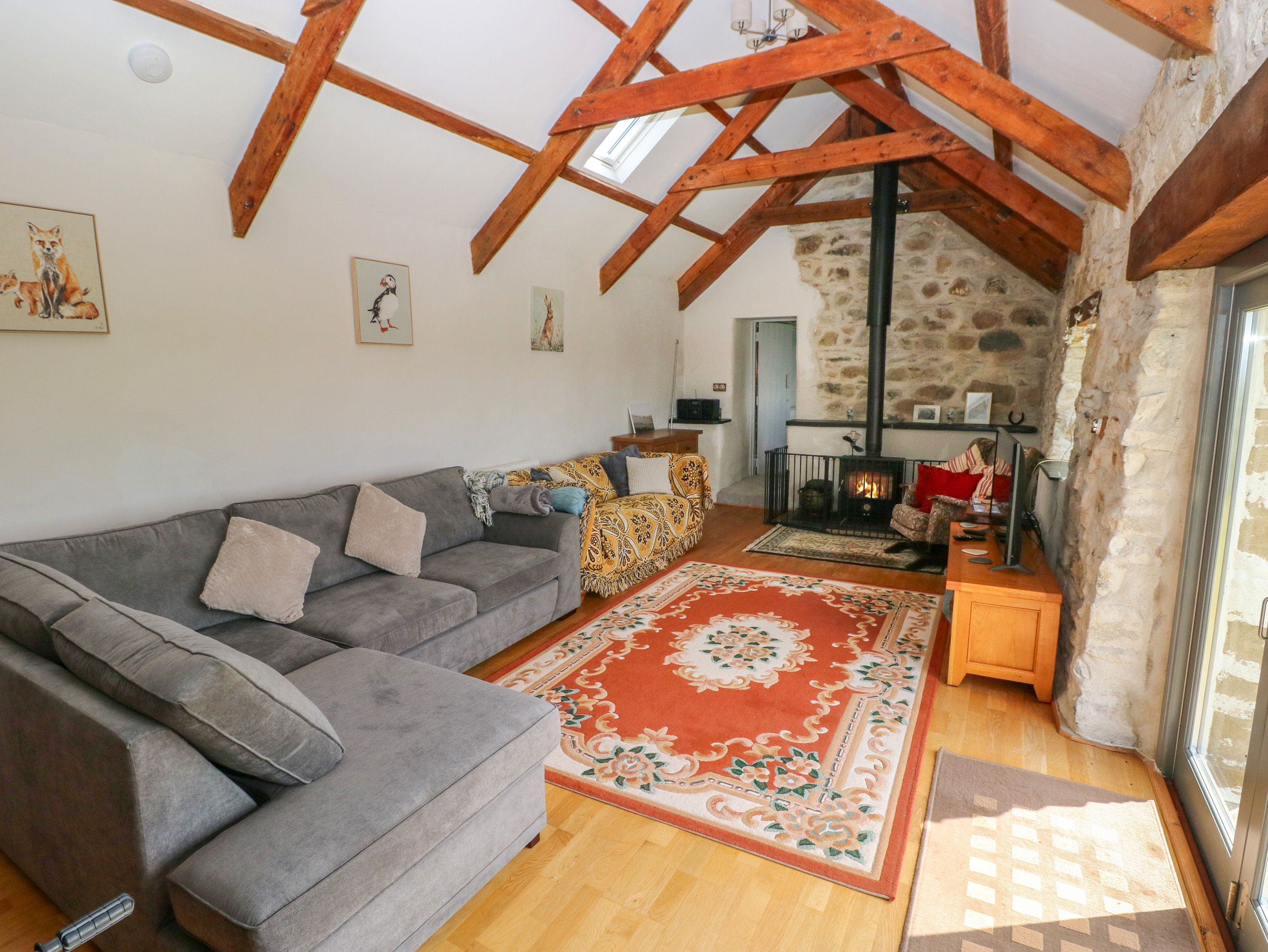 Accomodation Details Three bedrooms: 1 x king-size, 1 x double, 1 x bunk. Ground floor bathroom room with walk-in shower, standalone bath, basin, heated towel rail, WC. Living/kitchen room with TV. Utility. Dining room. Sitting room with woodburning stove