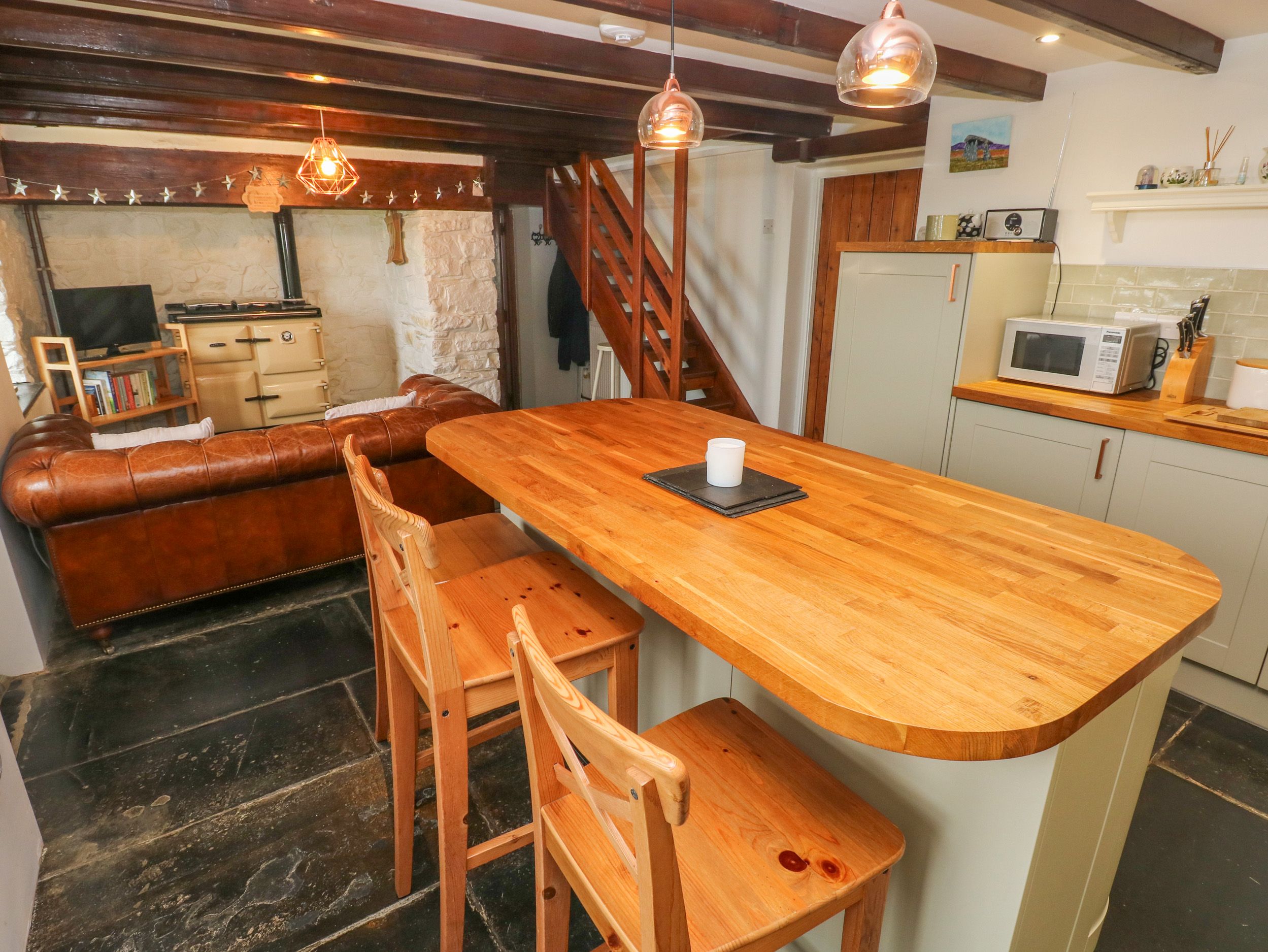 Holiday home Bryn Nante, a cottage consists of a living/kitchen room with fridge/freezer, electric oven and induction hob, microwave, kettle, toaster, AGA/Rayburn cooker, and TV, a utility with washing machine, a dining room with dining seating, and a sitting room with TV and woodburning stove. The bedrooms consist of a king-size, double, and bunk. There is a shower room with walk-in shower, basin, and heated towel rail and WC. WiFi, fuel, power, bed linen , towels, and starter pack for the wood burner included in the rent. Outside, there is a front lawn and off-road parking for four cars. Two well-behaved dogs welcome. Sorry, no smoking at this property. Guests can find a shop within 0.3 miles and a pub within 2.1 miles. Minimum stay of 3 nights. good house keeping bond of 350 pounds Sterlling. Make memories with a stay at Bryn Nante.