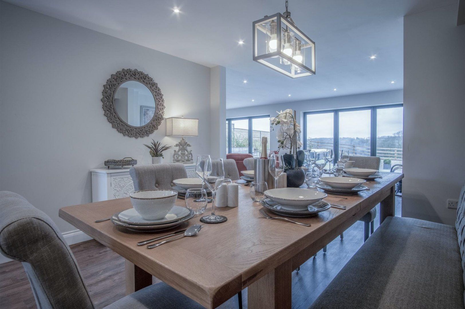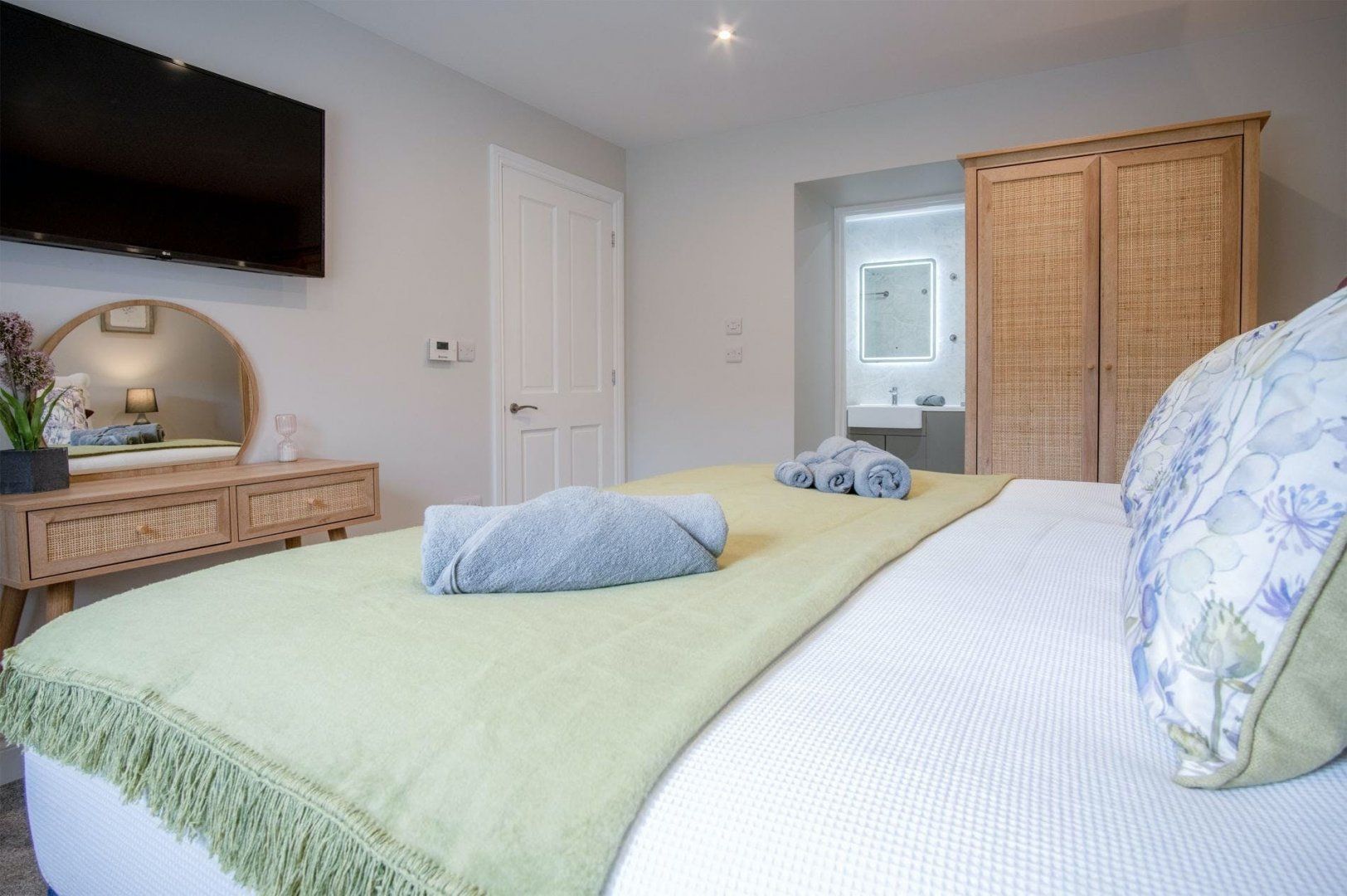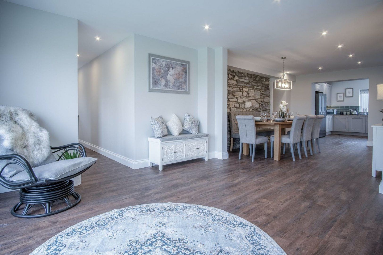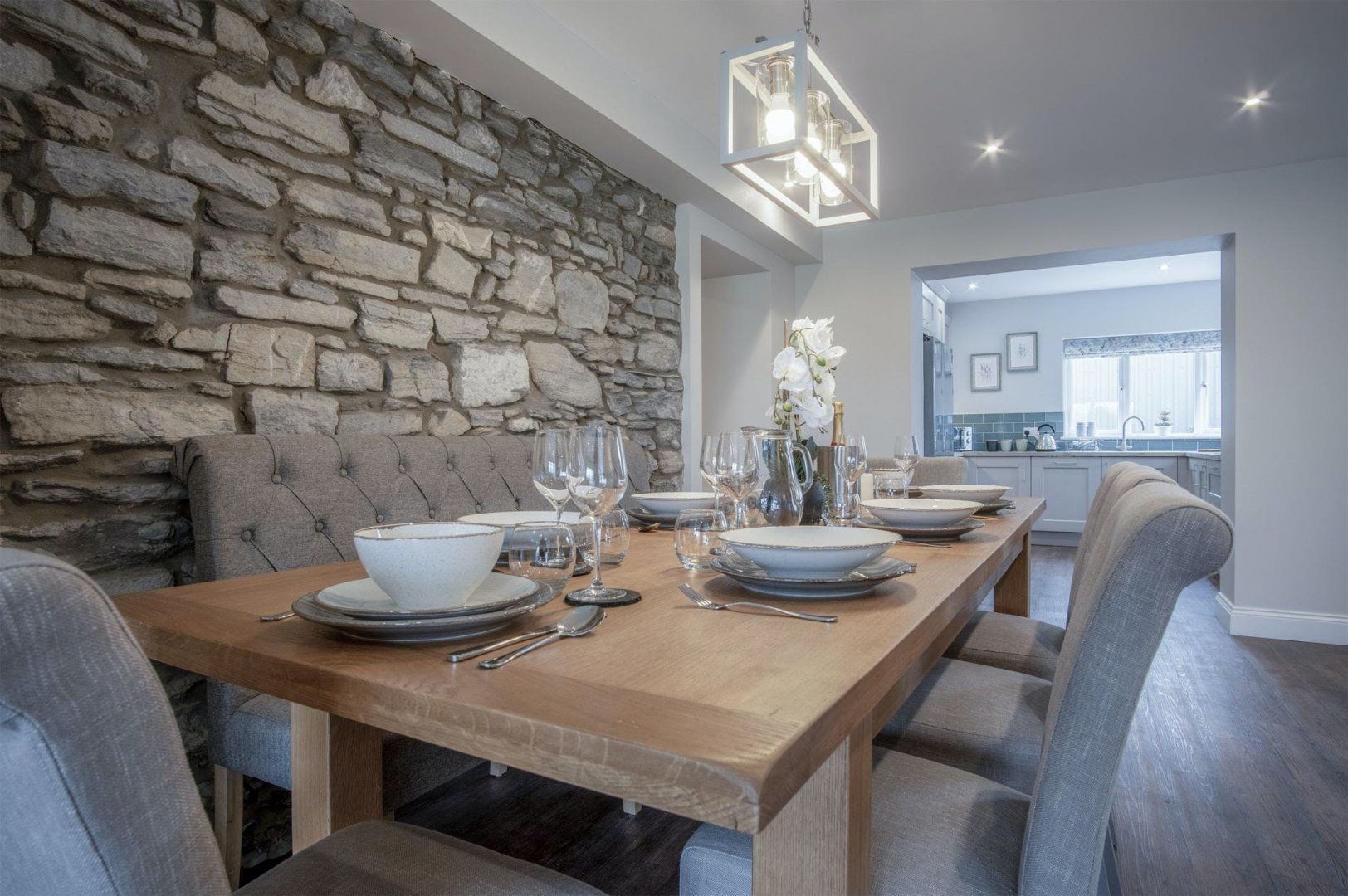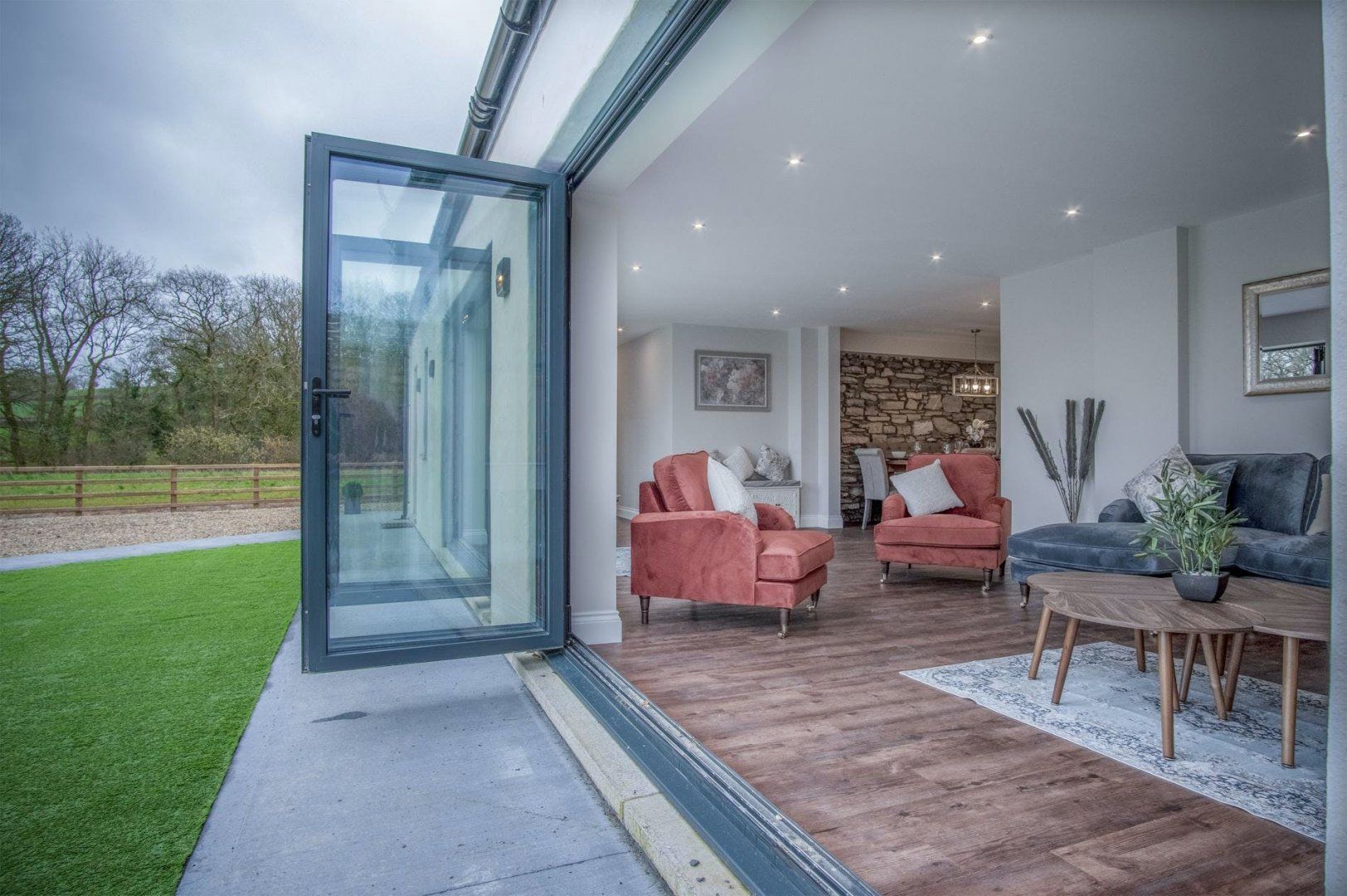 Located just outside the quaint Pembrokeshire town of Narberth – this modern farmhouse offers a secluded stay in the Welsh countryside that still remains close by to the local amenities. With a private hot tub to retreat to after a day of exploring the local cafes, shops and pubs within walking distance – the house is an inviting spot to socialise come day or night. Framing green views over the surrounding landscape, bi-fold doors open up the living area to the garden and the fresh country air here. Meanwhile, modern home furnishings present a highly functional space dedicated to comfort.
