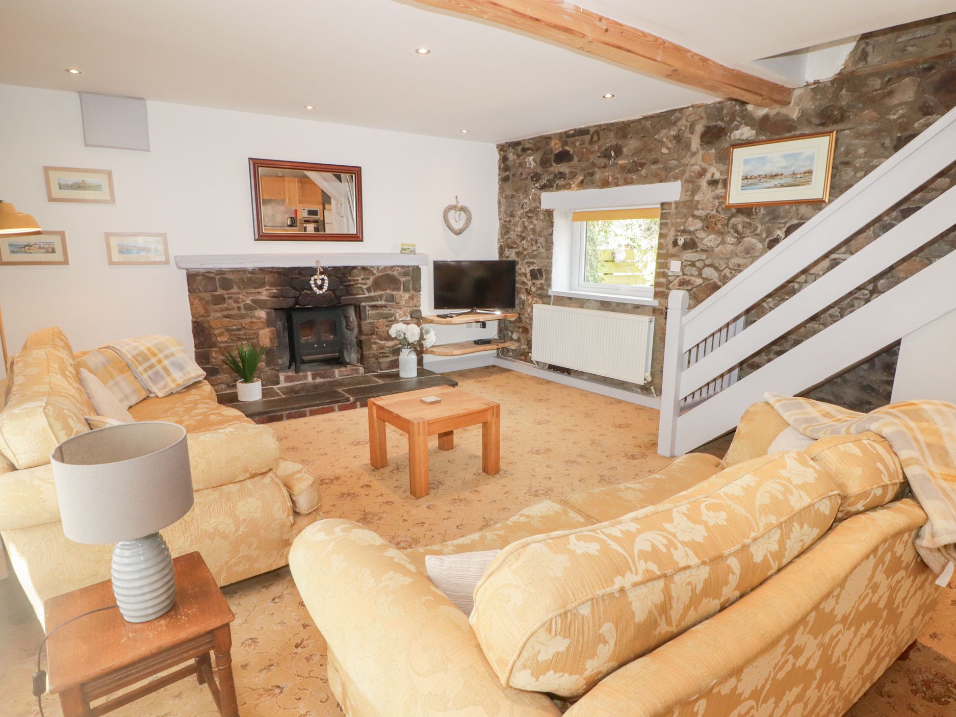 Gas central heating. Electric oven and hob, microwave, fridge/freezer, washing machine, dishwasher, Freeview TV, DVD and WiFi. Fuel, power and starter pack for fire inc. in rent. Bed linen and towels inc. in rent. Travel cot, highchair and stairgate available on request. Off-road parking for two cars. Electric Vehicles: This property does not have a charge point for electric vehicles and charging from within the property is prohibited. Gravelled courtyard with furniture and barbecue. Two well behaved dogs are welcome (additional charge applies). Sorry, no smoking. Shop 2.7 miles, pub 0.4 miles. Please Note: Friday - Friday Bookings preferred