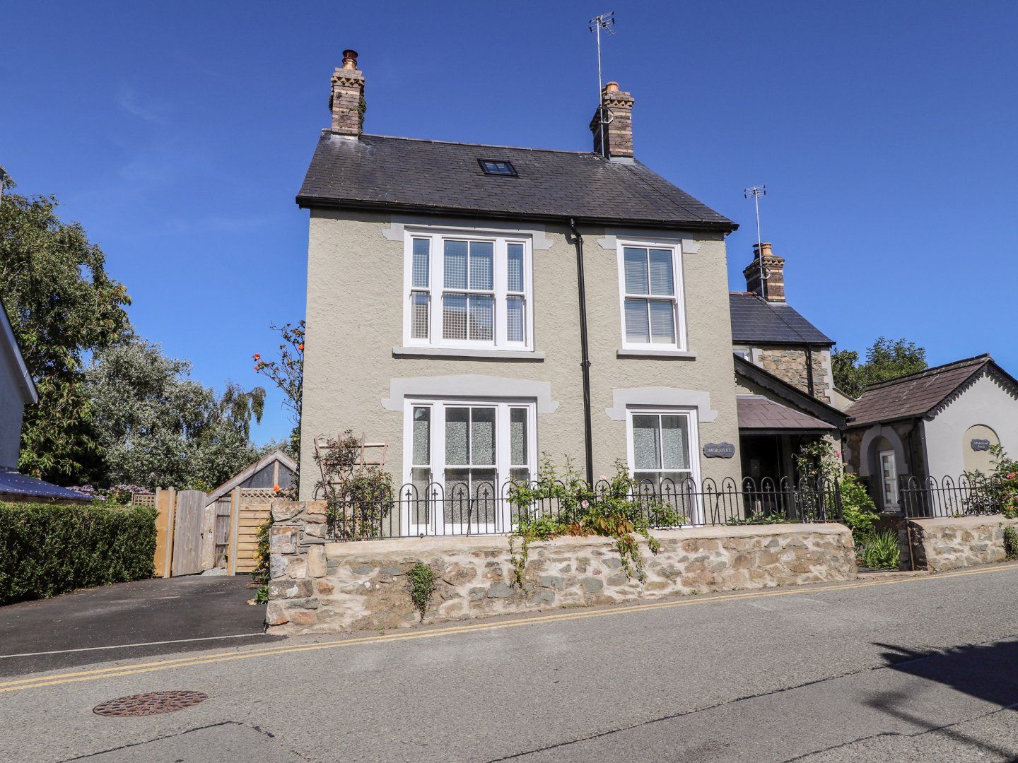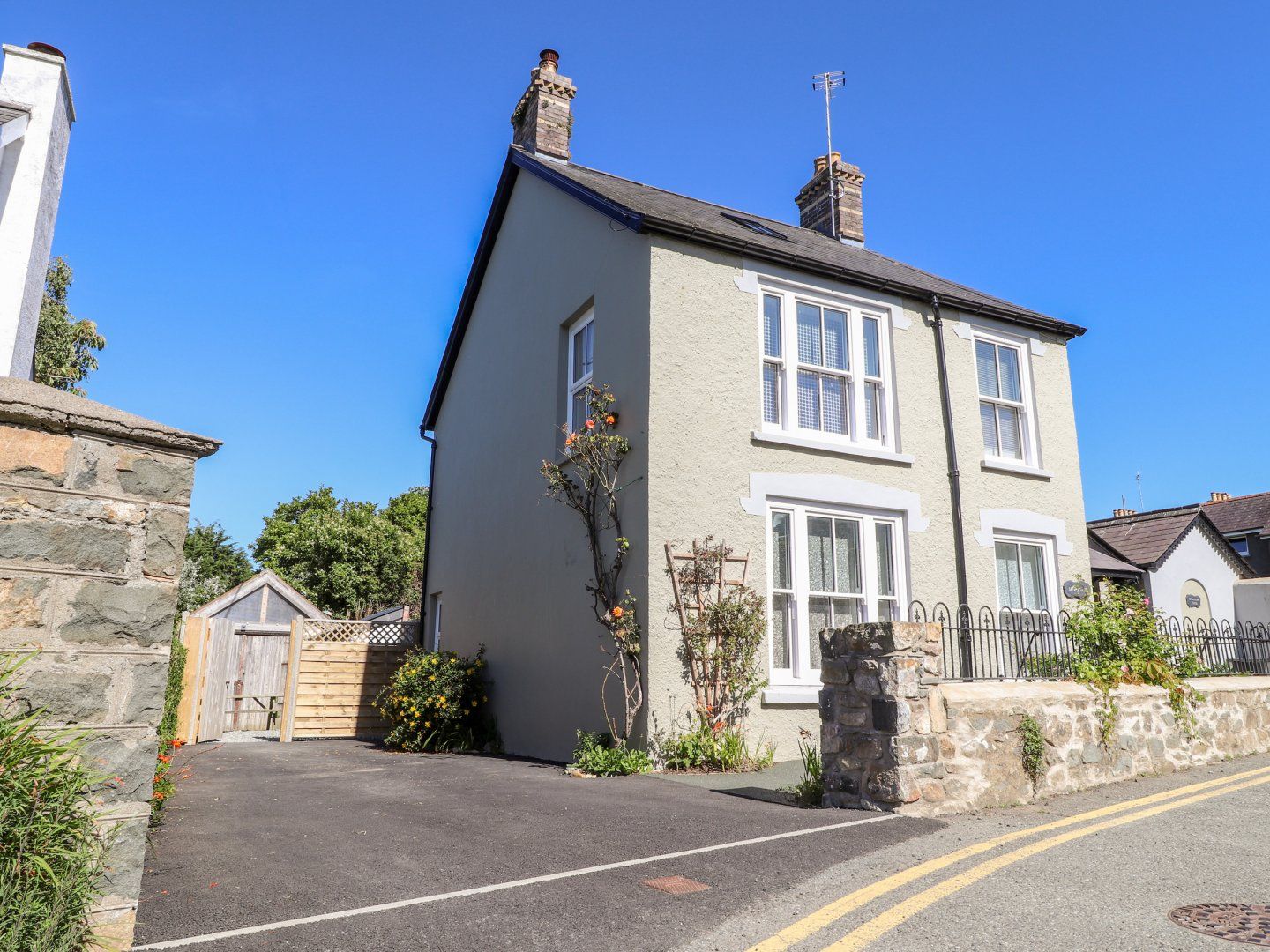 Gas central heating. Electric oven and hob, fridge and separate freezer, dishwasher, microwave, combined washing machine/dryer. TV, WiFi, a selection of books and games. Fuel and power inc. in rent. Bed linen and towels inc. in rent. Travel cot, high chair, and stair gate available. Electric Vehicles: This property does not have a charge point for electric vehicles and charging from within the property is prohibited. Parking for two cars. Spacious garden over two levels with mature trees and shrubs, built-in BBQ area but no BBQ supplied, table and chairs. Sorry, no pets and no smoking. Shop 0.2 miles, pub 0.1 miles, coast 0.4 miles. Note: Steps up to furniture in garden, please take care. Nodyn: Eisteddfod y Carreg Las 2026 - ffoniwch am fanylion pellach - phone for further details