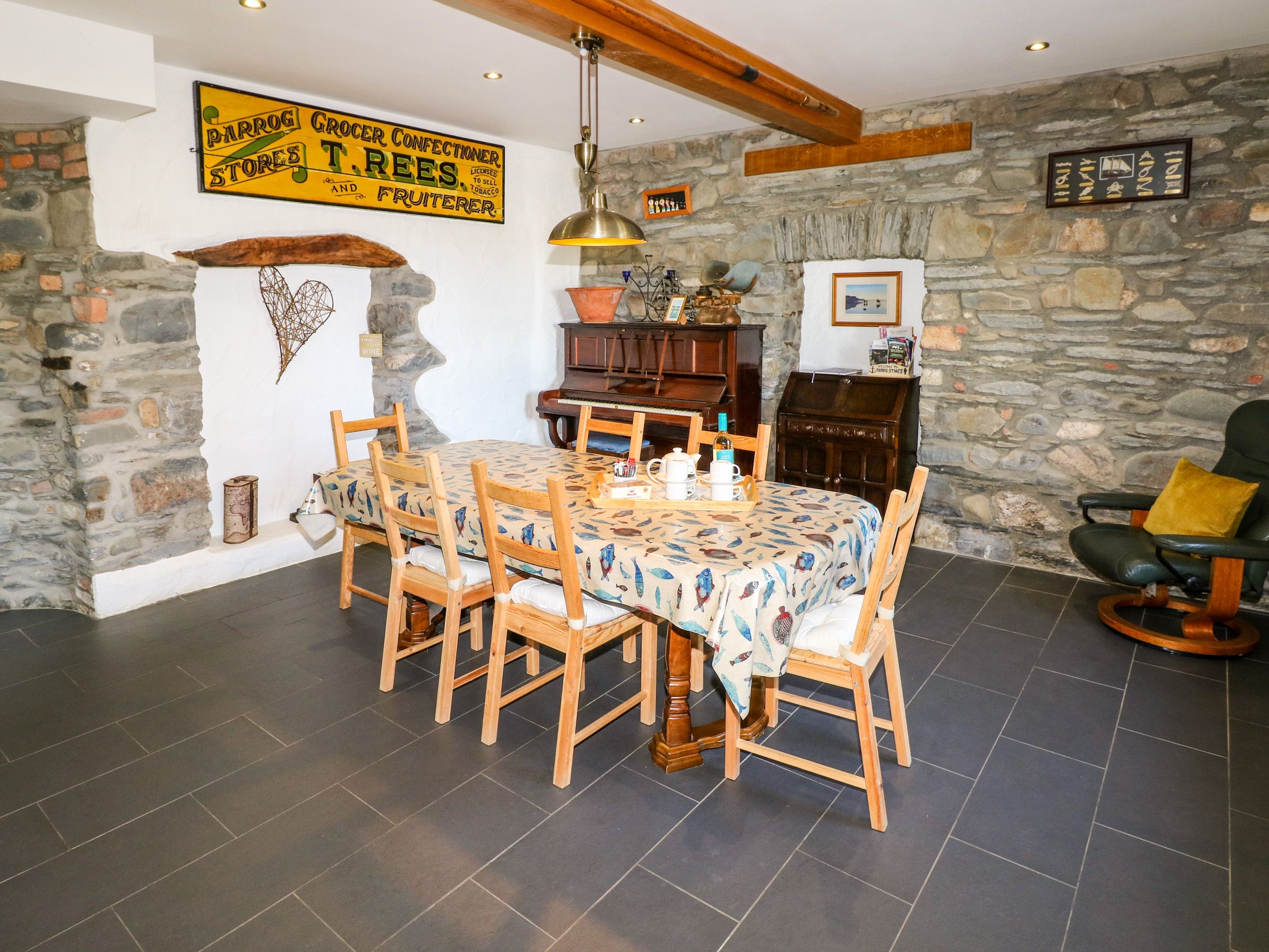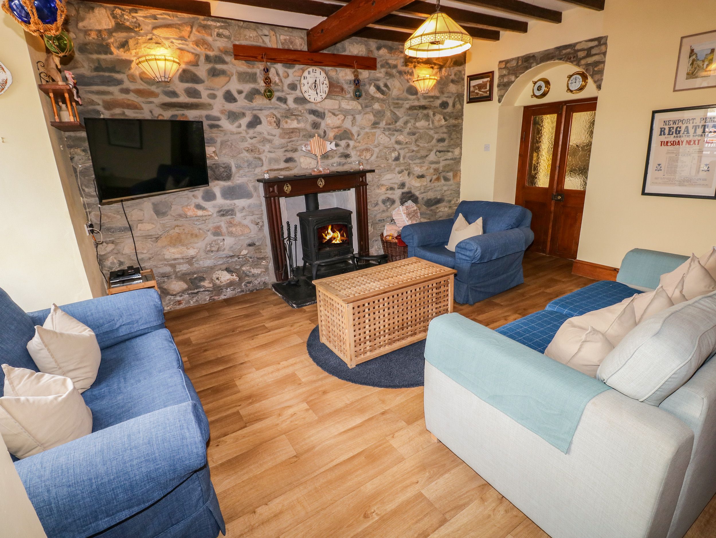Holiday home Parrog Stores consists of a kitchen with gas oven and hob, microwave, fridge/freezer, dishwasher, a utility with washing machine, a dining room with piano, and a sitting room with Smart TV and woodburning stove. The bedrooms consist of a super-king-size with en-suite shower room, a king-size with en-suite shower room, and a double with en-suite bathroom. Outside there is an enclosed rear garden with furniture, plus off-road parking for one car. Within 0.5 miles or less you will find a shop, a pub and a beach. Two well-behaved pets welcome, but sorry, no smoking. Highchair, travel cot, and stairgate available. Fuel, power, bed linen, and towels included in the rent. Explore the coast of Sir Benfro with a stay at the characterful Parrog Stores.