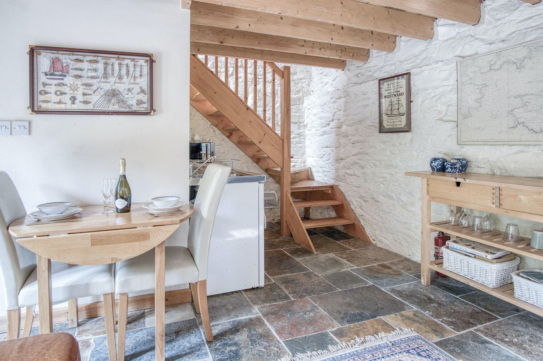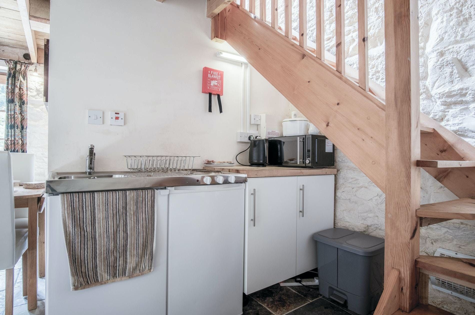 This well-sized property has all the charm you'd expect from a traditional cottage. The perfect cosy place to stay, sleeping two people, The Apple Store has everything you should need. On entering the property, you're met with the rustic stone walls of the open plan living room/kitchen area. The comfortable sofas are set in front of the gorgeous log burner, perfect for cosy evenings in. Enjoy the widescreen TV as you relax in front of the fire, or do a spot of cooking in the kitchenette, complete with an electric hob, microwave, kettle, toaster, sink and a fridge. There's even a pull-out dining table for two. On the ground floor you'll also find the modern bathroom with shower for your use.