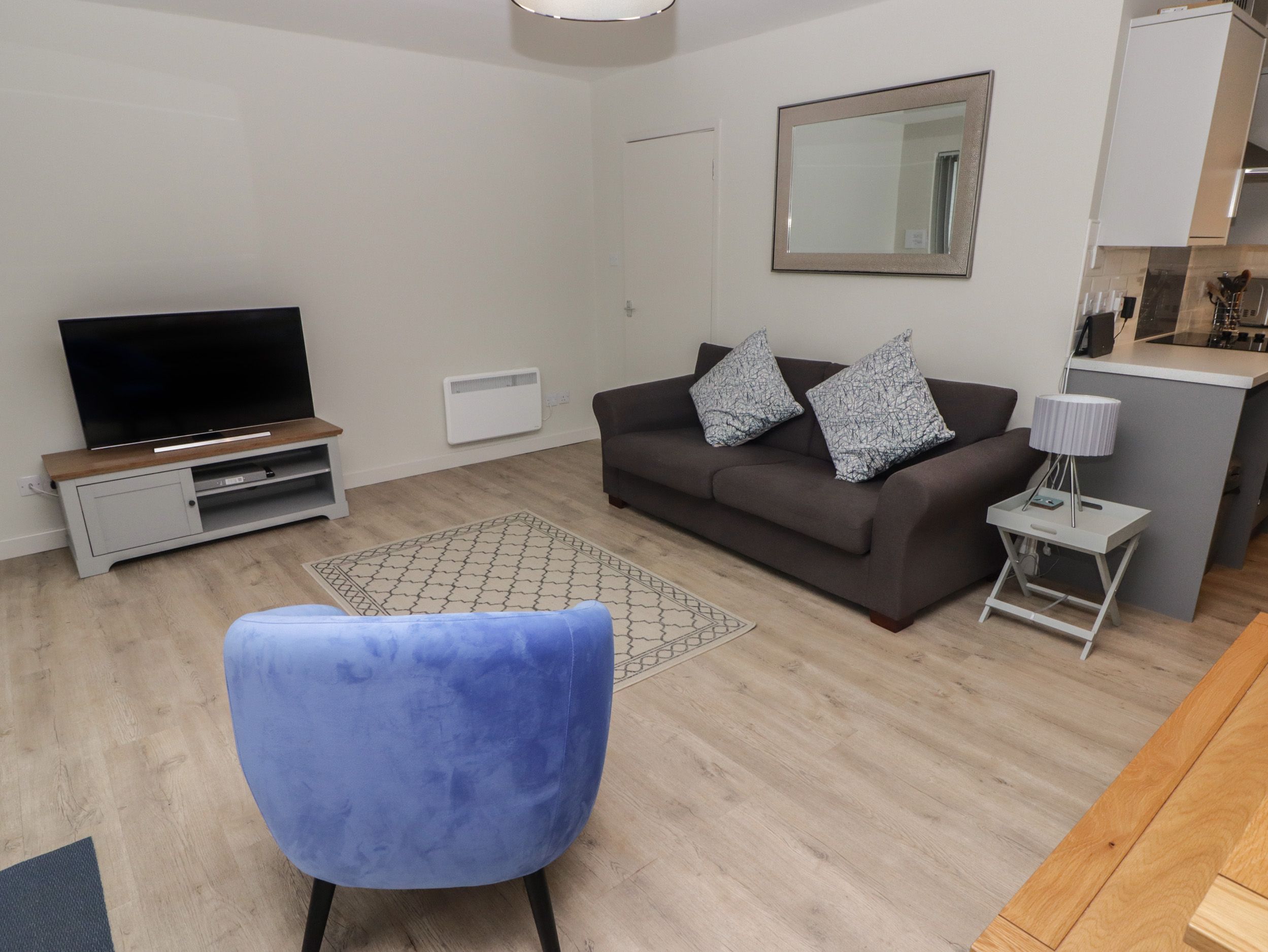 Amenities Electric heating. Electric oven and hob, microwave, fridge, freezer, dishwasher, kettle, toaster. TV, WiFi. Fuel and power inc.in rent. Bed linen and towels inc. in rent. Highchair and travel cot available. Designated parking for 1 car. Private patio, screened with shrubs with furniture. Direct access to communal gardens with lawn. One well-behaved pet welcome (additional charge applies). Sorry, no smoking. Shop, pub and beach 0.3 miles. Note: The patio is not enclosed, please supervise pets and children when outside. Access to the lawns/gardens is through the apartment front door to either end of the block of apartments. Note: Electric car charging is prohibited; car charging points are available in the nearby Regency Hall/Public Library car park