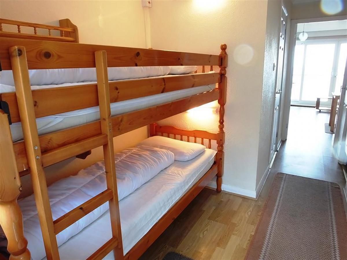 The bright open-plan lounge/kitchen/diner is decorated with tones of green and wooden furnishings with two comfortable sofas making the most of the views from the wall-to-wall sliding glass doors.