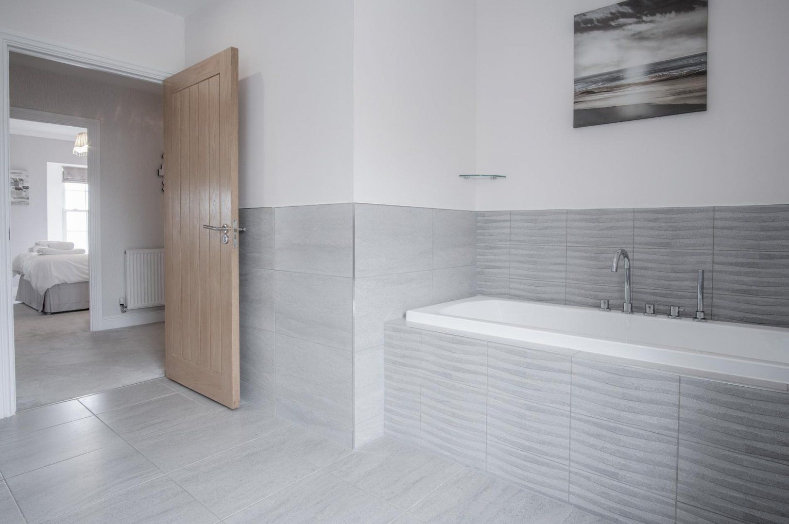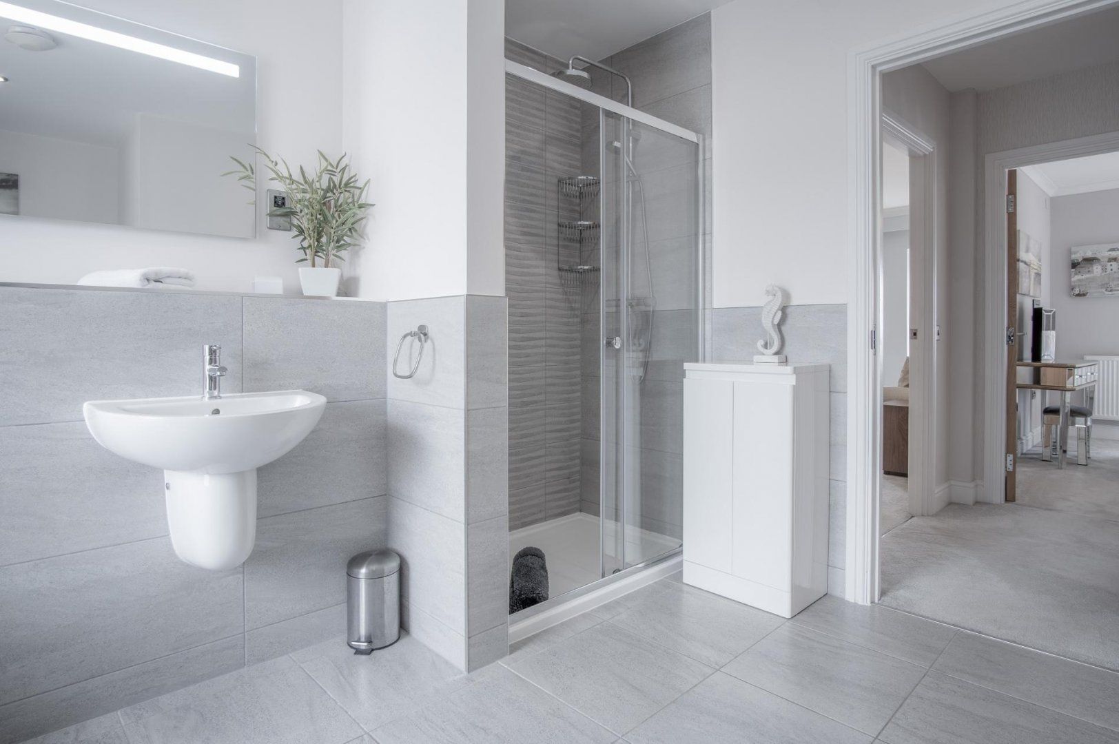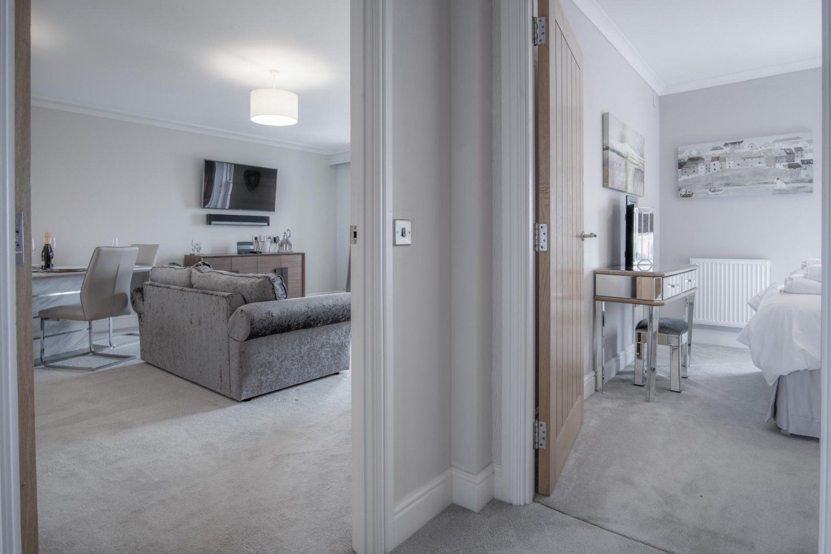 Arrive to find a generous open-plan living room and kitchen area, with plenty of space to enjoy leisurely evenings of movies and delicious feasts with your loved ones. The sleek and well-equipped kitchen will make rustling up those scrumptious meals a breeze and you can share them at the elegant dining table – and should you have some laptop duties to attend to, this is also a great spot for it. All the while, you’ll be able to glance at the stunning sea vistas outside your windows.