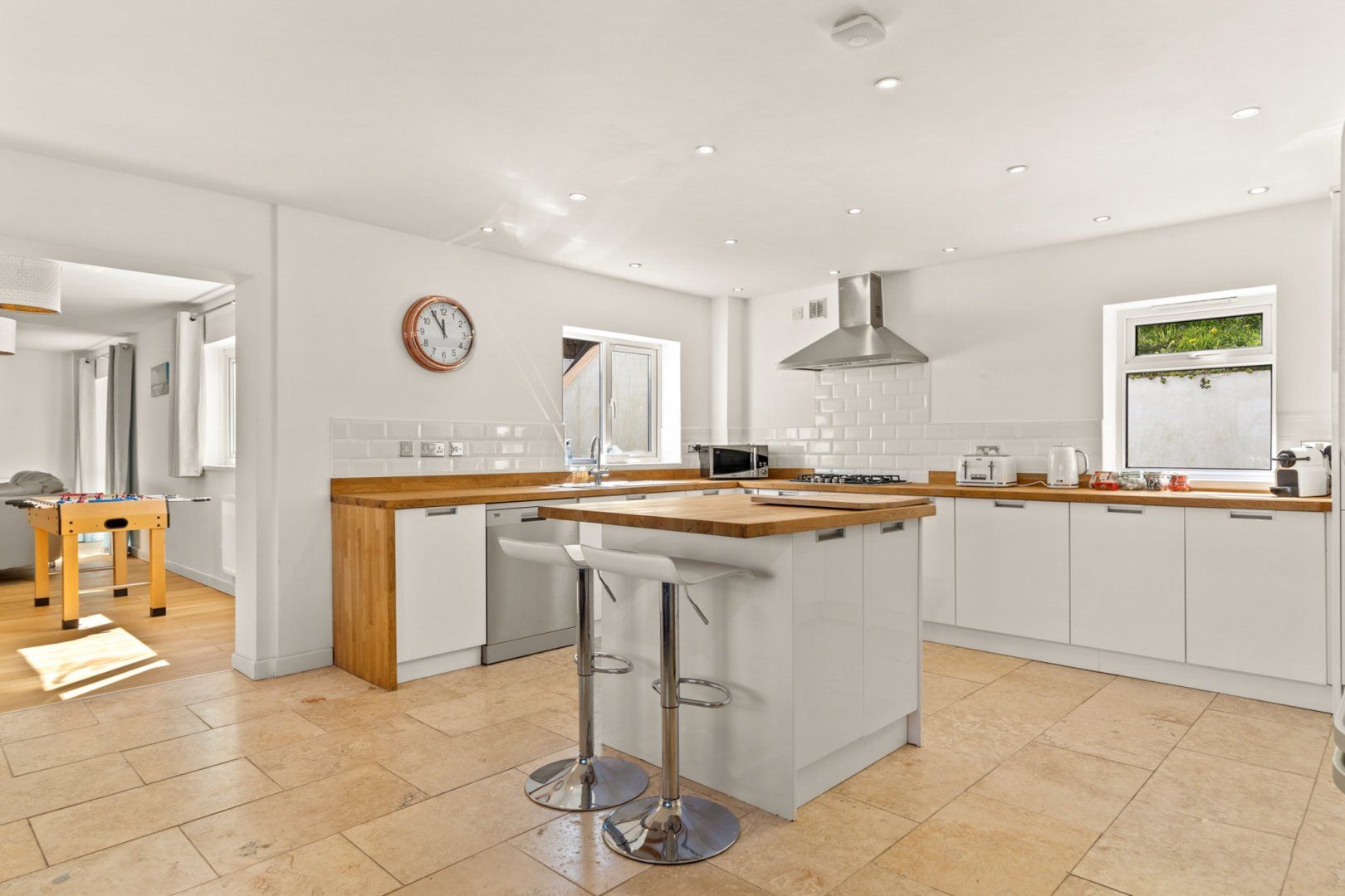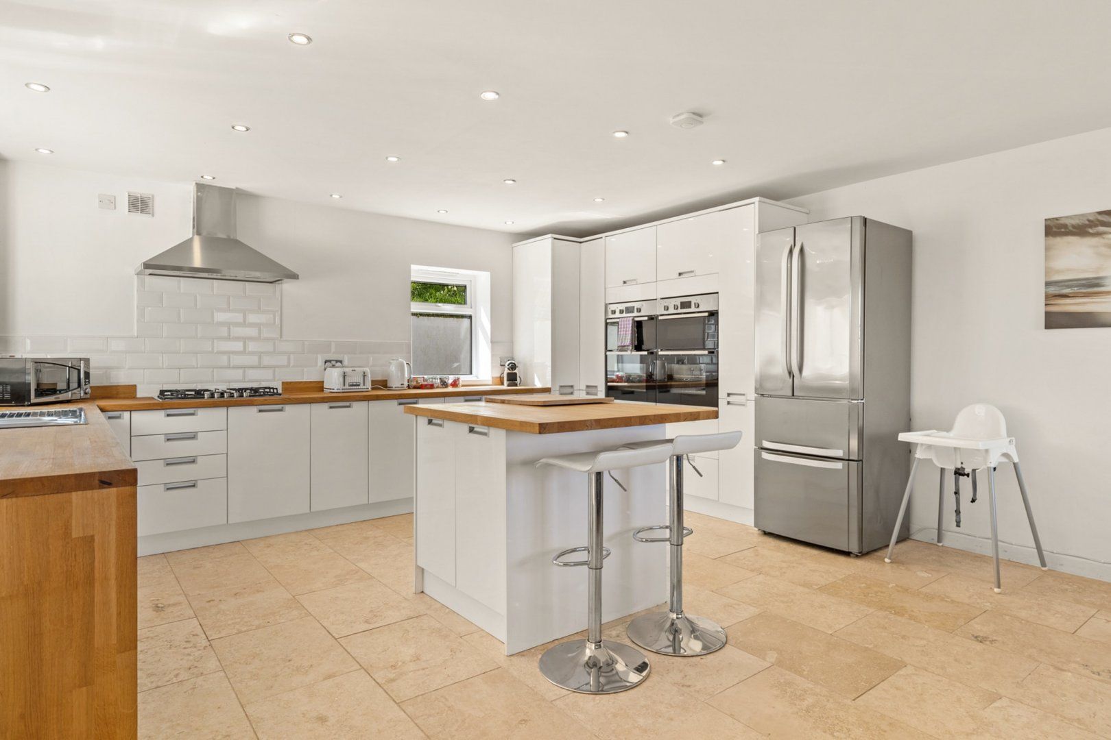 The home's interior is bright and contemporary, with stark white walls, smart wooden floors and large glass doors that bathe the space in natural light. If you're culinarily gifted, you're sure to love the huge and well-equipped kitchen, as well as the equally generously sized dining room in which everybody can enjoy the fruits of your labour.