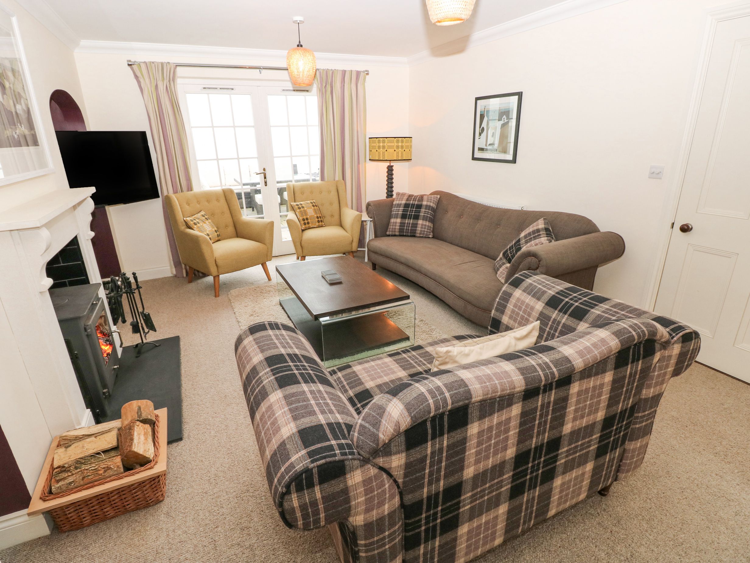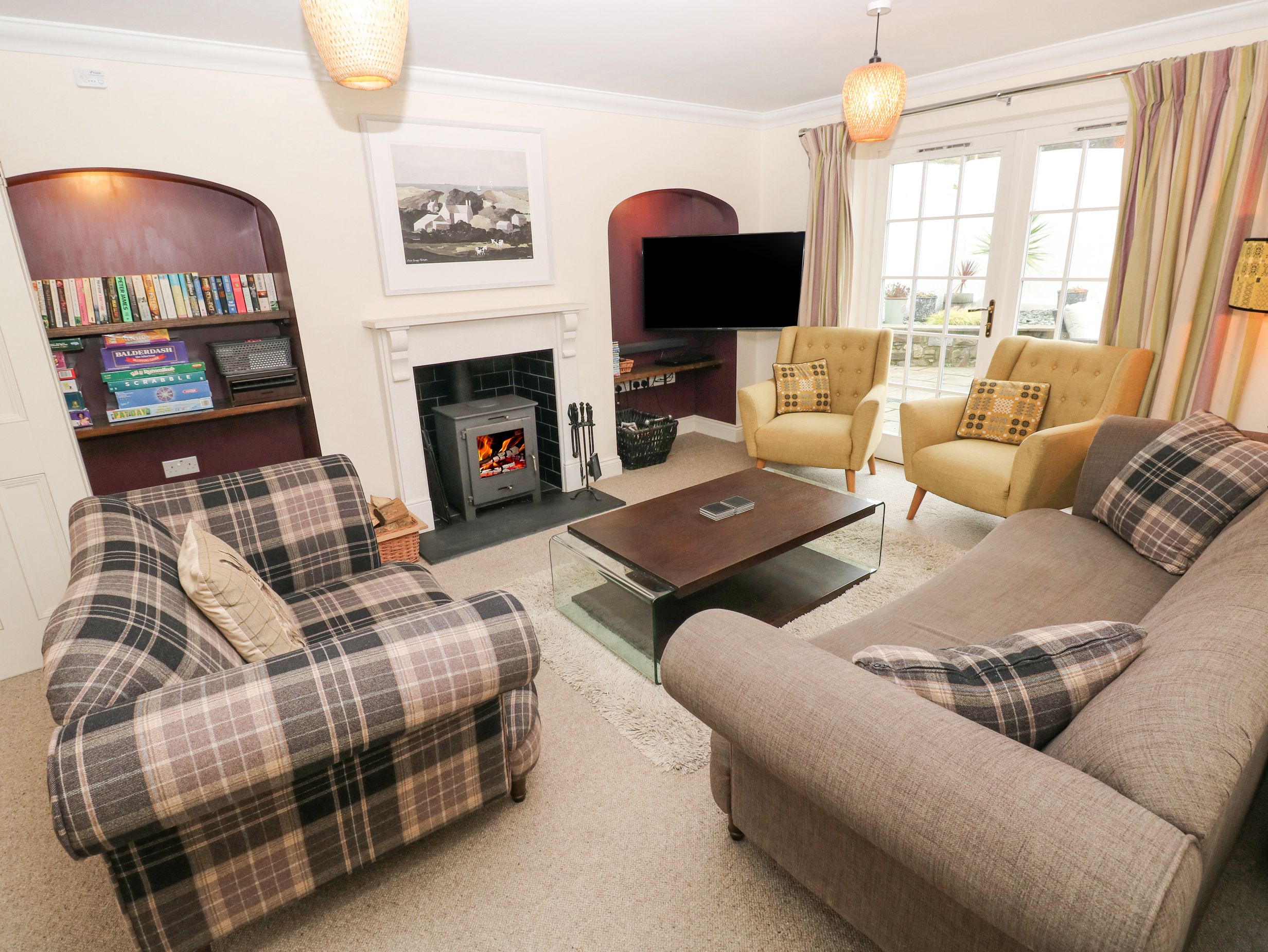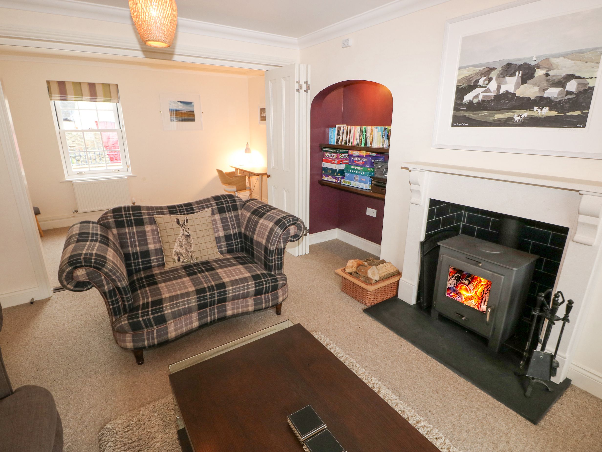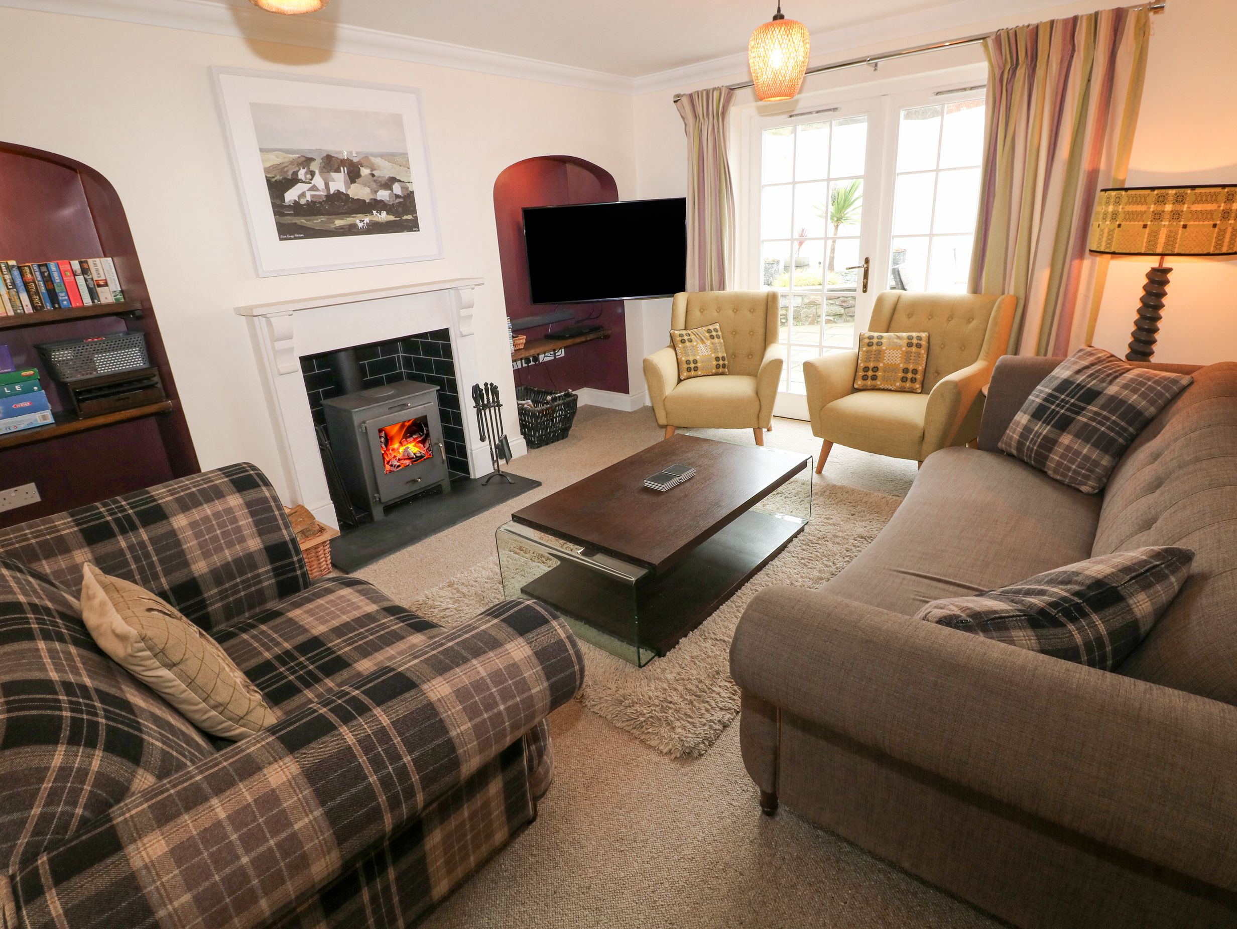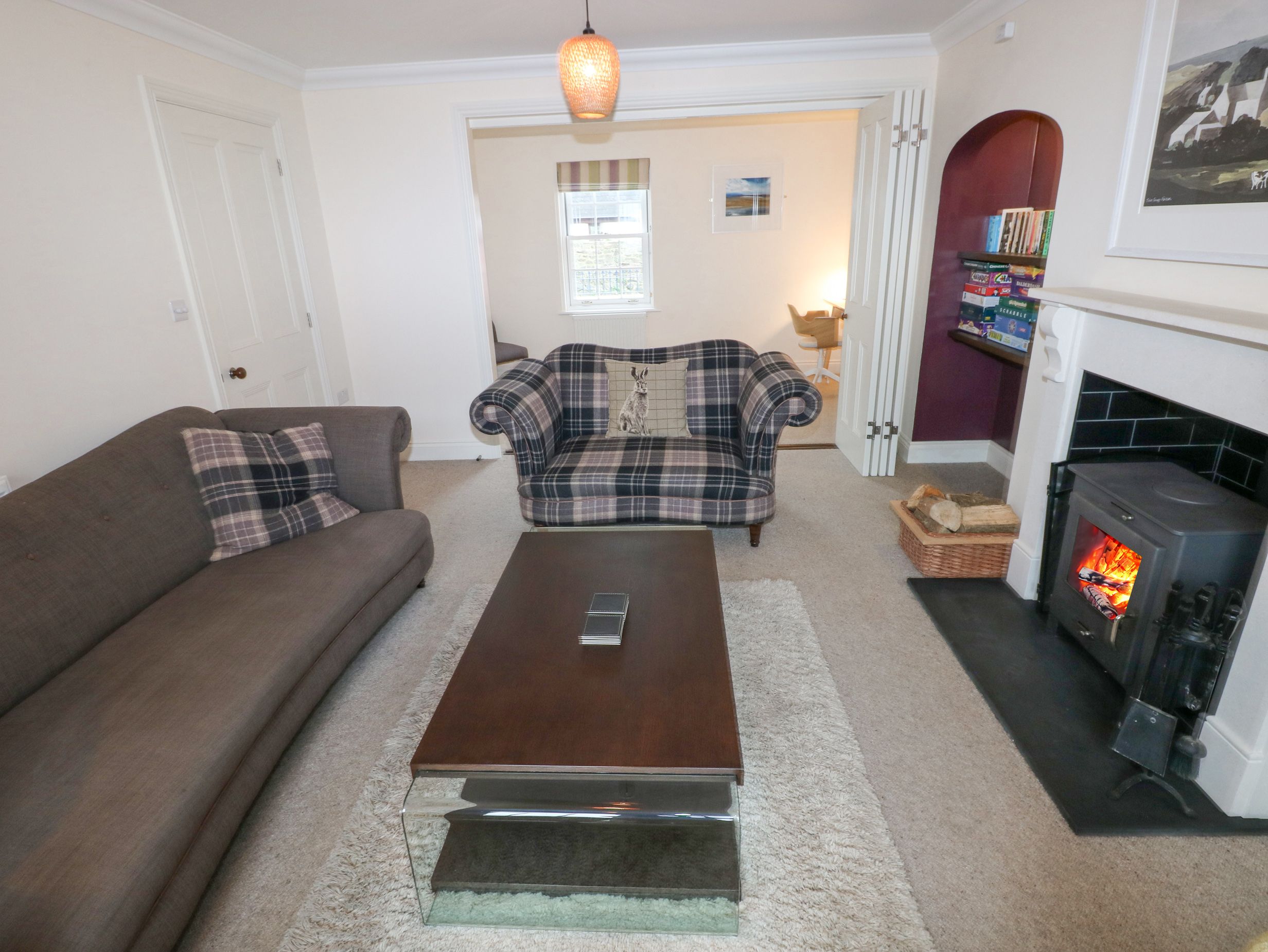 Amenities Oil central heating. Electric oven, induction hob, microwave, fridge/freezer, washing machine, dishwasher, tumble dryer. Smart TV, WiFi, table tennis, table football and dart board, and a selection of books and games. Fuel, power, and starter pack for woodburning stove inc. in rent. Bed linen and towels inc. in rent. Travel cot available and highchair available on request. Driveway parking for 2 cars with additional roadside parking on a first-come, first-served basis. Rear garden with lawn, patio and furniture. Two well-behaved pets welcome; more pets welcome by prior arrangement and additional fee. Sorry, no smoking. Shop 1.4 miles, pub 0.2 miles