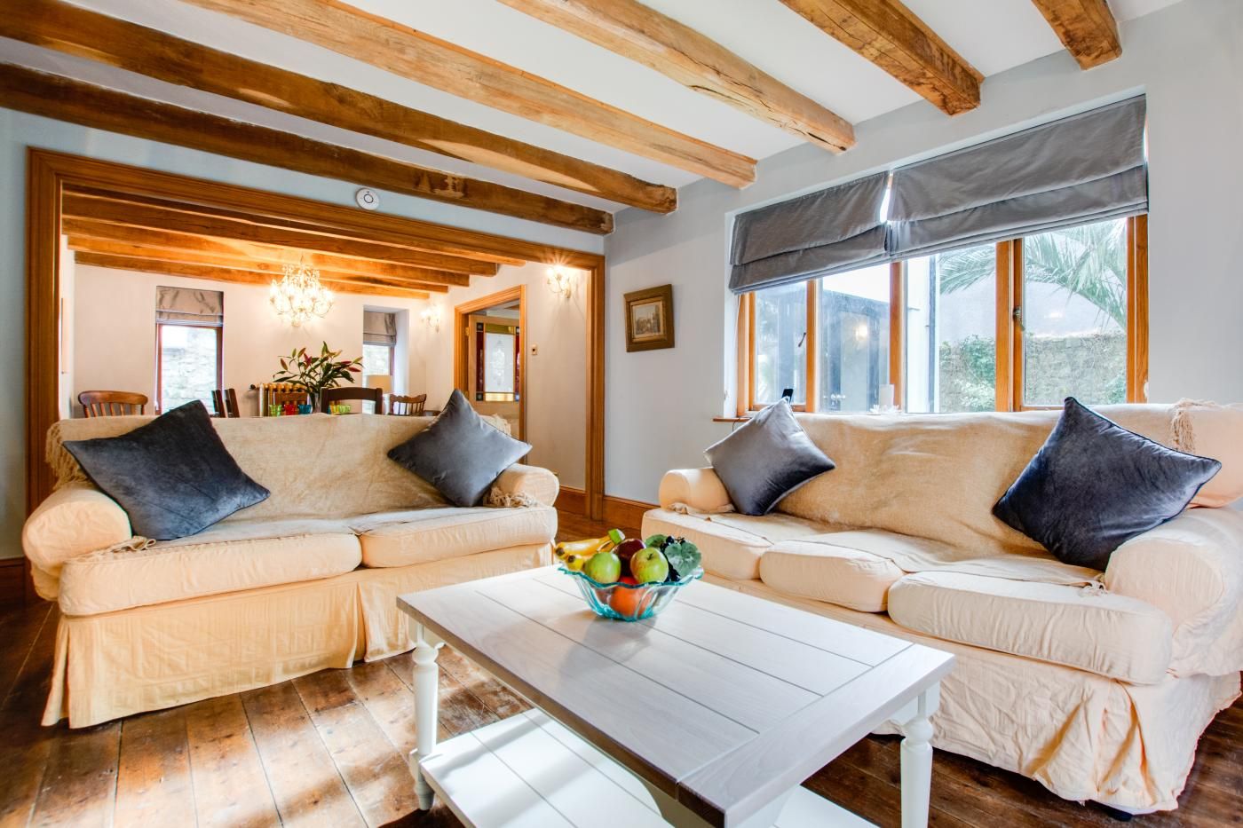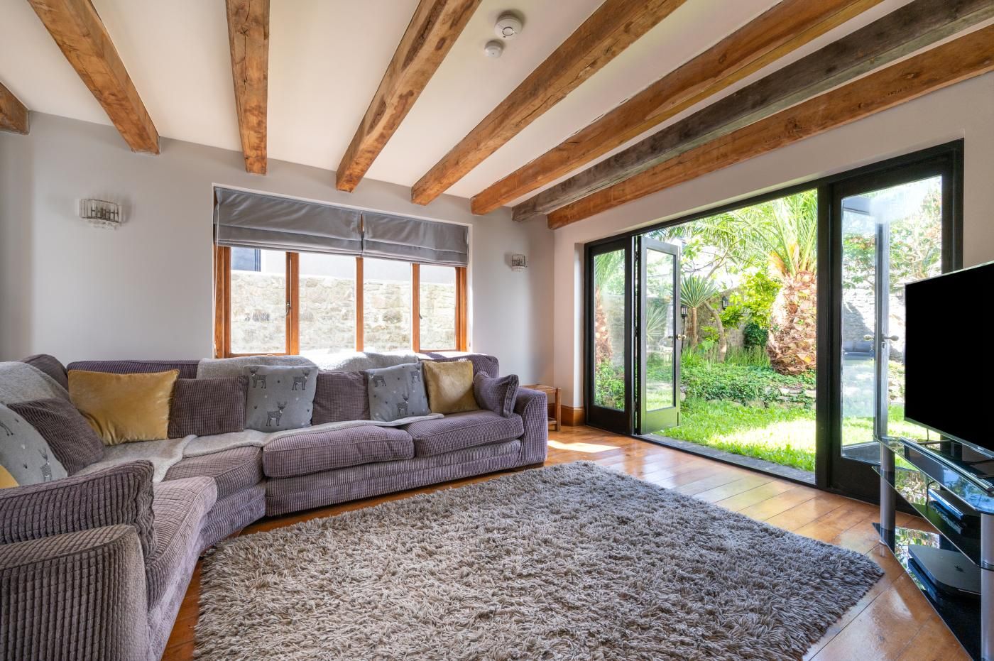 Benefitting from two well-equipped kitchens and multiple living areas spread out across three floors, this centrally-located property provides plenty of space to relax and enjoy a coastal getaway with family and friends. The exposed beams and the decorative fireplace add charming character to the house, while the bright pops of colour and tropical palm trees in the private garden instantly transport you to a sunny paradise.