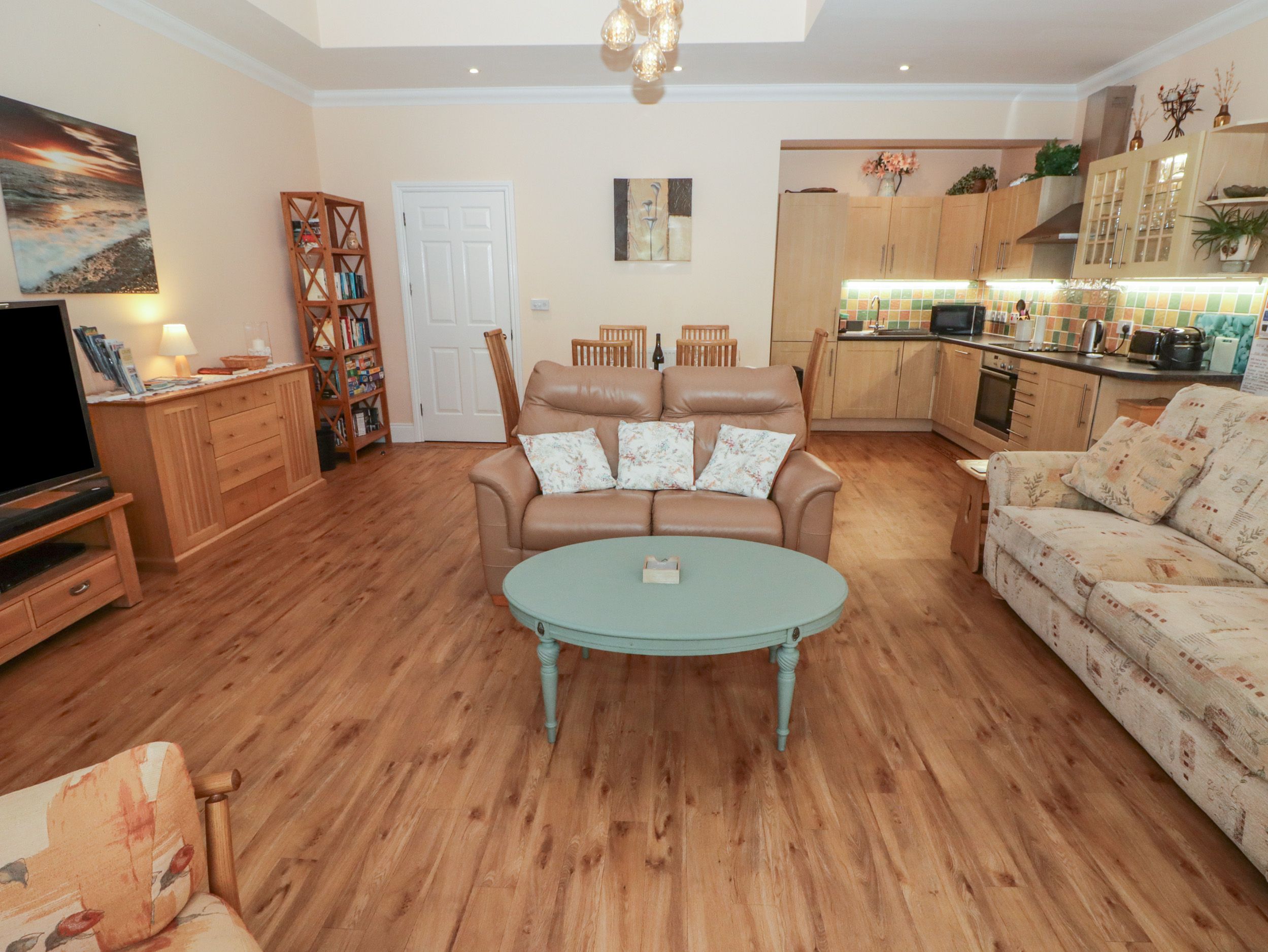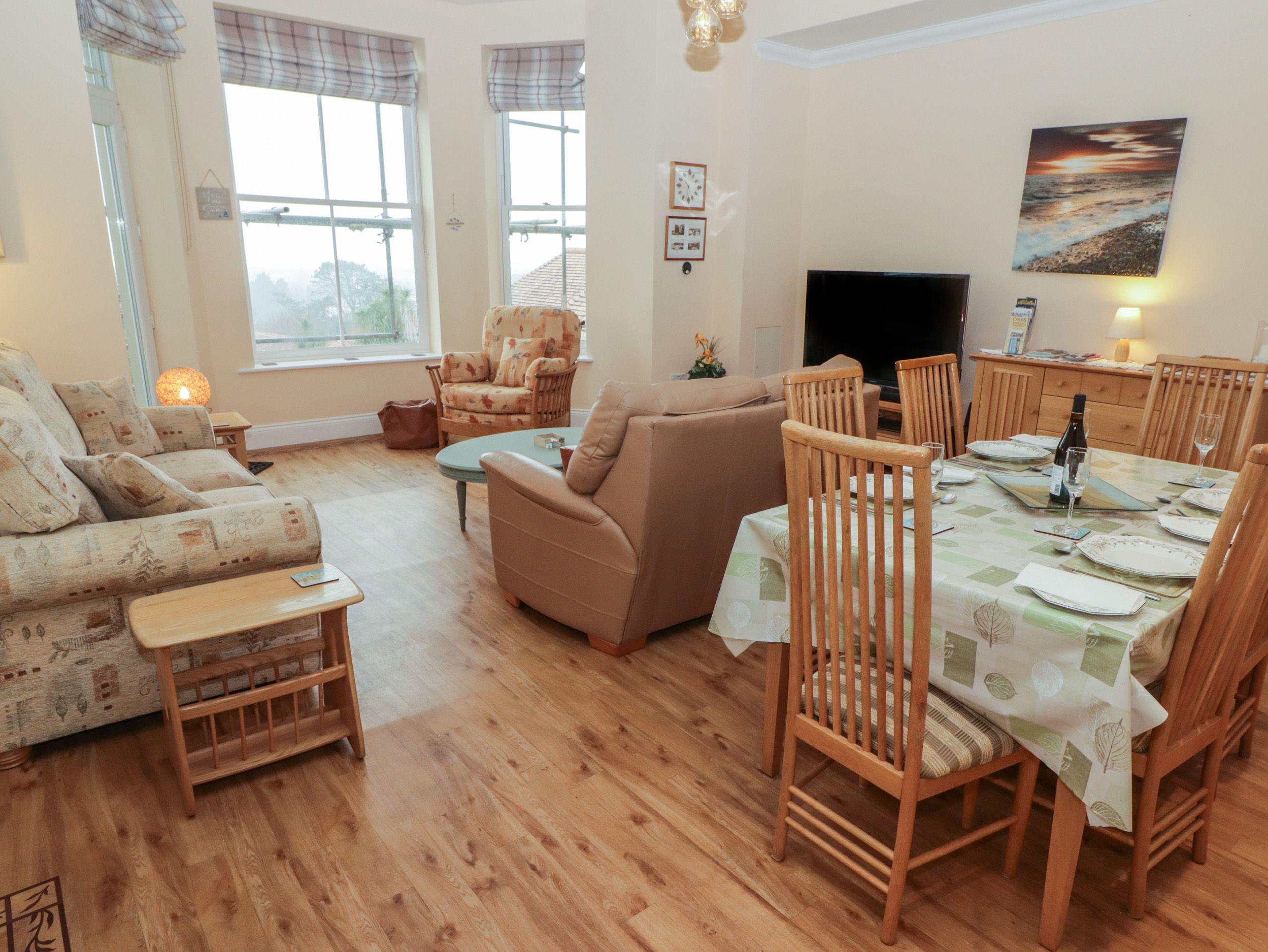 Flat 7 Mansion House, a first-floor apartment, consists of a kitchen with electric oven and hob, fridge/freezer, microwave, washer/dryer, and dishwasher, a dining room with seating for four guests, a sitting room with TV and a balcony. The bedrooms consist of a king-size with an en-suite shower and a twin serviced by a bathroom. Outside, there is a shared swimming pool, gym, and sauna, and a designated parking space for 1 car. Within 0.6 miles you will find a shop, 0.4 miles a pub and 0.7 miles a beach. WiFi, fuel, power, bed linen, and towels are included in the rent. Sorry, no pets and no smoking. Sink in the stunning views of the coast at Flat 7 Mansion House. Note: Swimming pool open between 9am-5pm, and needs to be pre-booked for private use once you arrive at the property along with the gym.