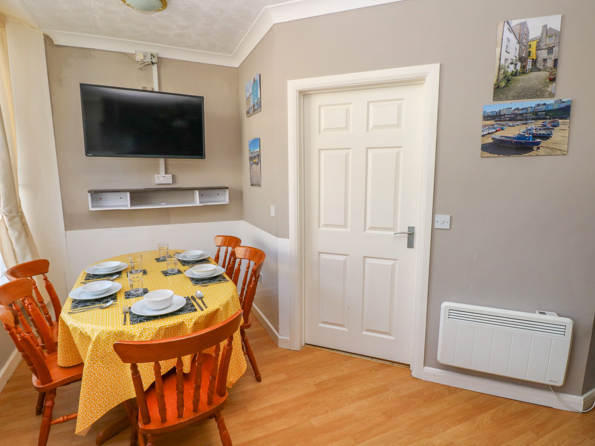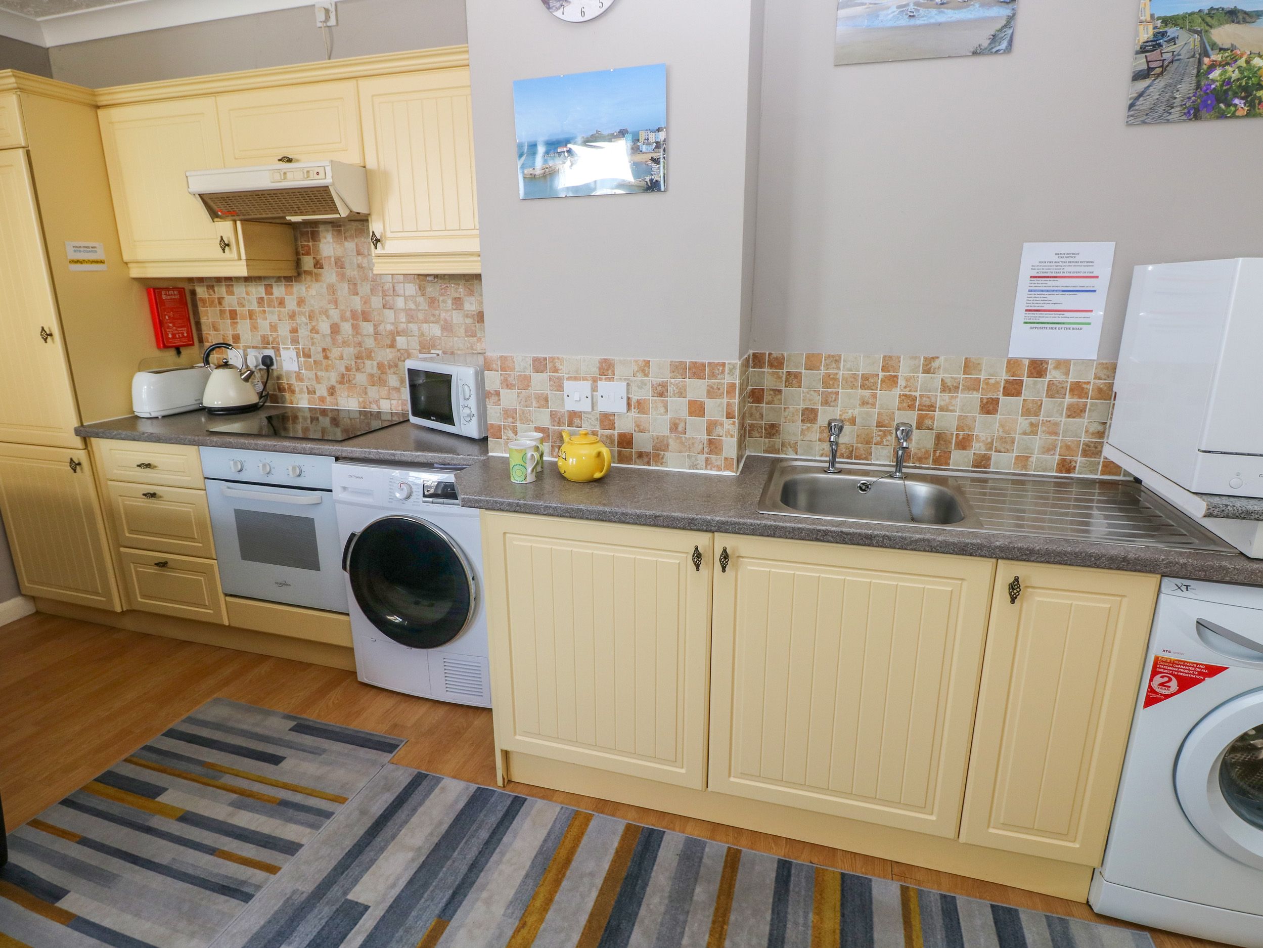 Holiday home The Hilton Retreat, a ground-floor apartment, consists of an open-plan living space including a kitchen with electric oven and induction hob, microwave, fridge, washing machine, tumble dryer, and dishwasher, a dining room with dining table for five, and a sitting room with TV. The bedrooms consist of a double and family room with bunk and single, along with a shower room with walk-in shower. WiFi, fuel, power, bed linen, and towels are included in the rent. Highchair and travel cot available. Outside, there is parking available in a nearby car park. Two well-behaved pets welcome. Sorry, no smoking. Shop 0.2 miles, pub 0.3 miles, beach 0.4 miles. Book your next family escape to Tenby with a stay at The Hilton Retreat. Note: There is a neighbouring restaurant located partially underneath property. Note: This property can be booked with Ref. 1162522, sleeping together up to 10 guests