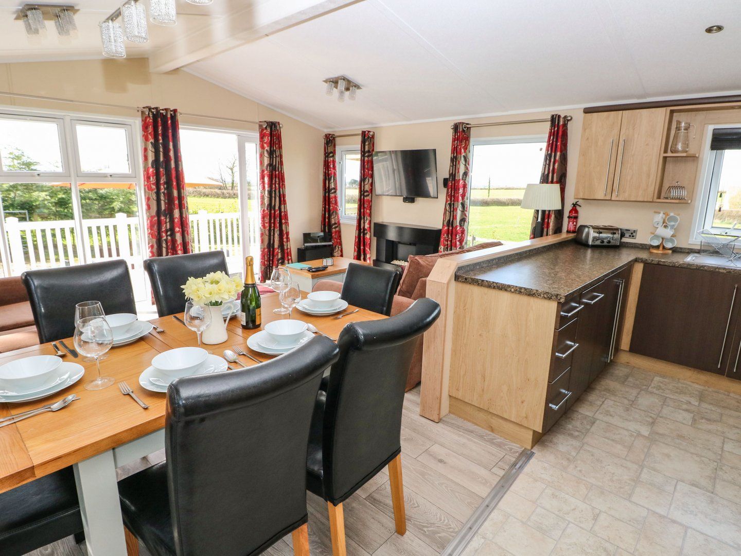 Holiday home The living areas in this single-storey property is an open-plan living with kitchen with electric double oven, gas hob, microwave, fridge/freezer and dishwasher, a dining area with seating for six guests and a sitting area with Smart TV. The bedrooms consist of a double with TV and en-suite cloakroom and two twins, and a shower room. Outside is an enclosed rear garden with lawn, front decking with furniture and hot tub, shared grounds and dog walking field and off-road parking for two cars, as well as EV charging at a fee. Within 2.3 miles you will find a shop and within 0.6 miles, a pub. One small well-behaved dog is welcome, sorry, no smoking. WiFi, fuel, power, bed linen and towels are included in the price. Travel cot and highchair available. washing machine and tumble dryer available in the shared utility for guests to use at an additional fee. Note during the winter months Nov to March, there is a supplement of £50.00 to use the hot tub, please call Sykes to arrange payment