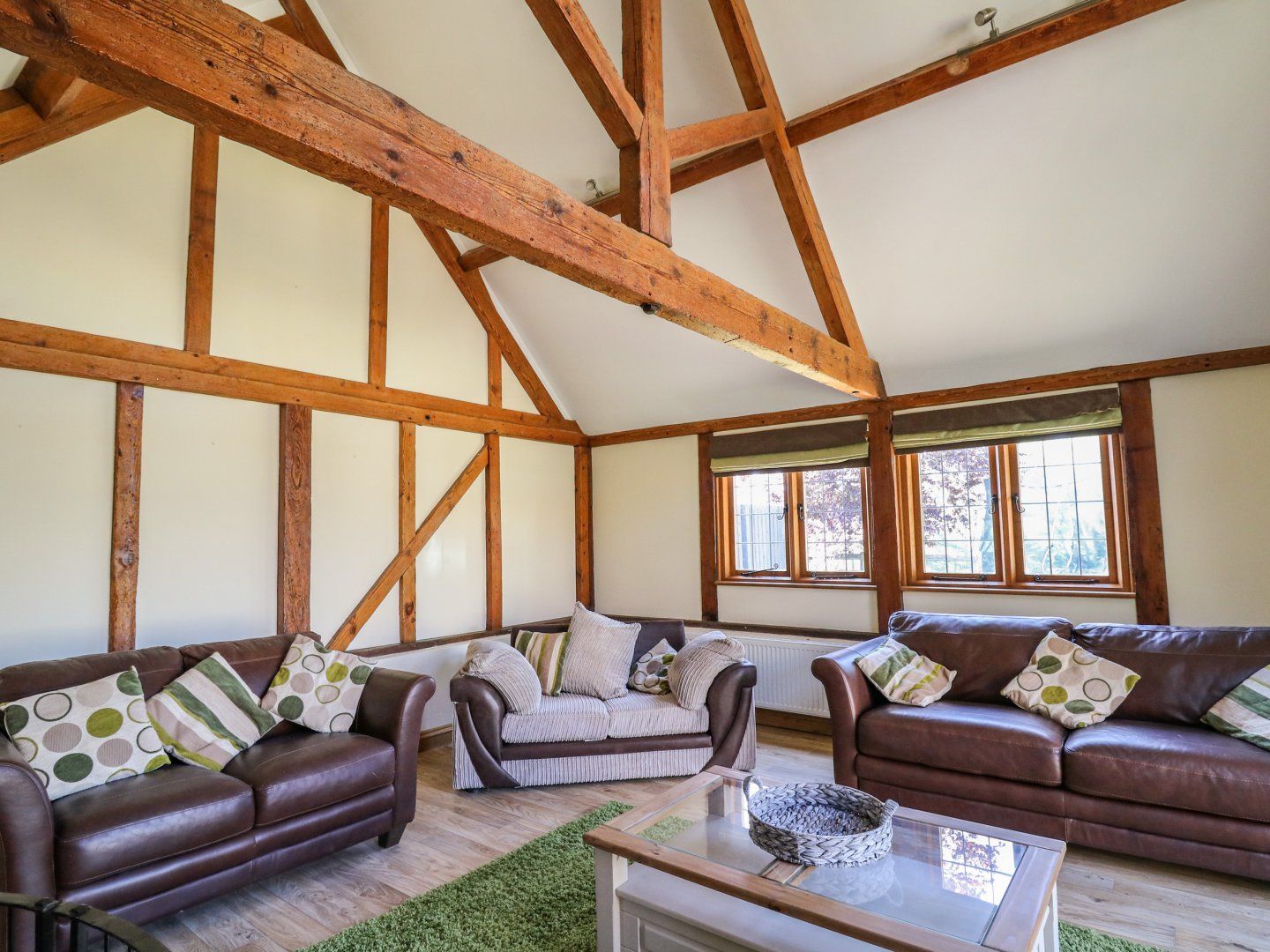 Accomodation Details Three bedrooms: 1 x ground-floor super-king-size (zip/link, can be twin on request), 1 x ground-floor king-size with Smart TV and en-suite walk-in shower, basin, and WC, 1 x twin with play area and en-suite bathroom with bath, basin and WC. Ground-floor bathroom with bath, walk-in shower, basin, and WC. Kitchen/diner. Utility. Living/dining room with woodburning stove