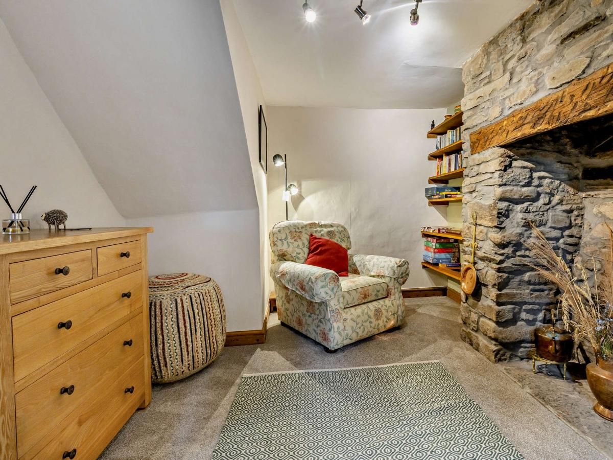 Reach the cottage via an illuminated path with uneven steps and enter via the garden room, a sunny space in which to relax or enjoy a meal.