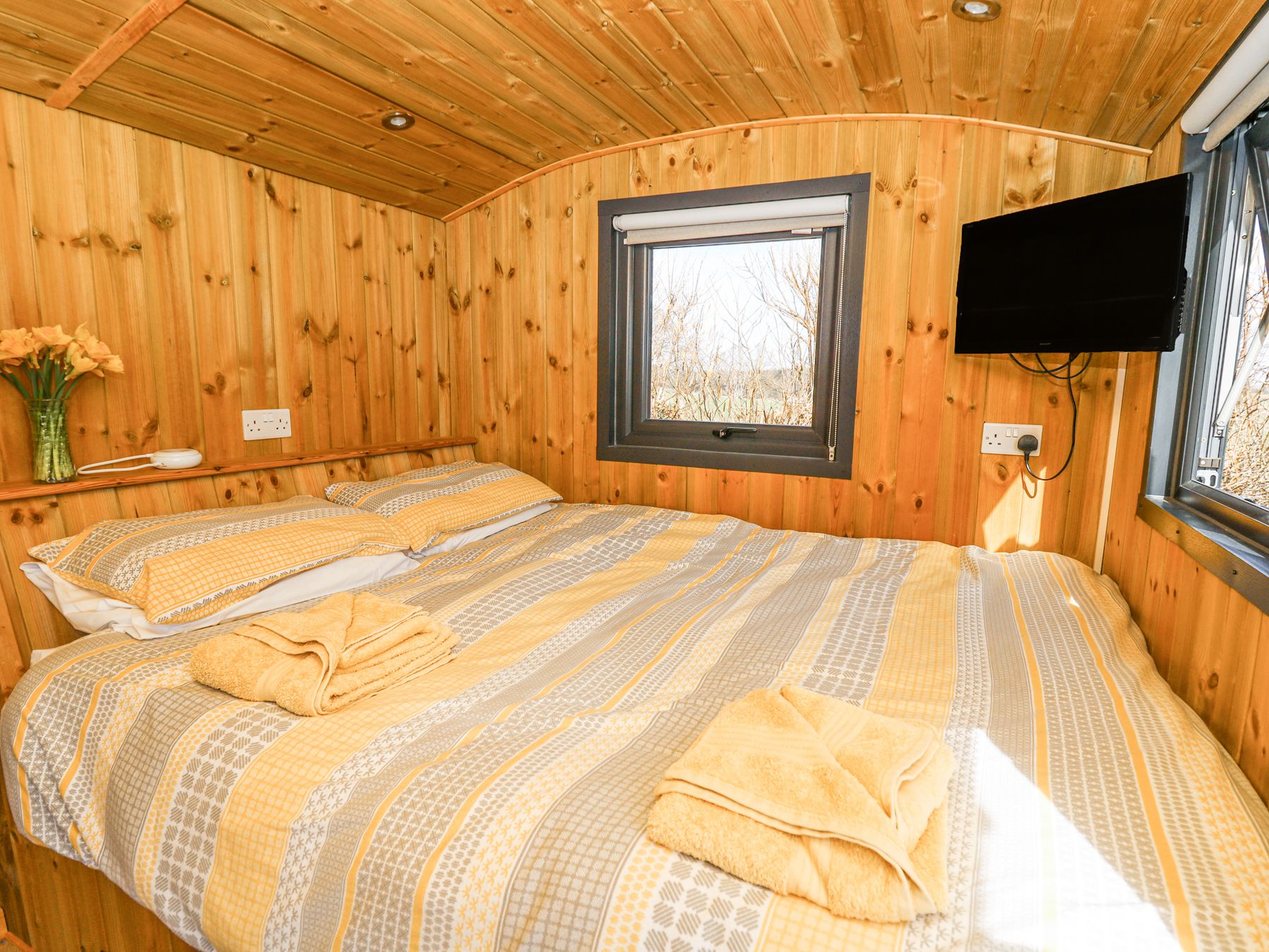 Central heating. Two ring hob, microwave, fridge. TV, WiFi. Fuel and power inc. in rent. Bed linen and towels inc. in rent. Off-road parking. Enclosed garden. One well-behaved dog welcome. Sorry, no smoking. Shop 1.5 miles, pub 5.1 miles. Note: There is a fence surrounding both huts, but there isn’t a fence separating them