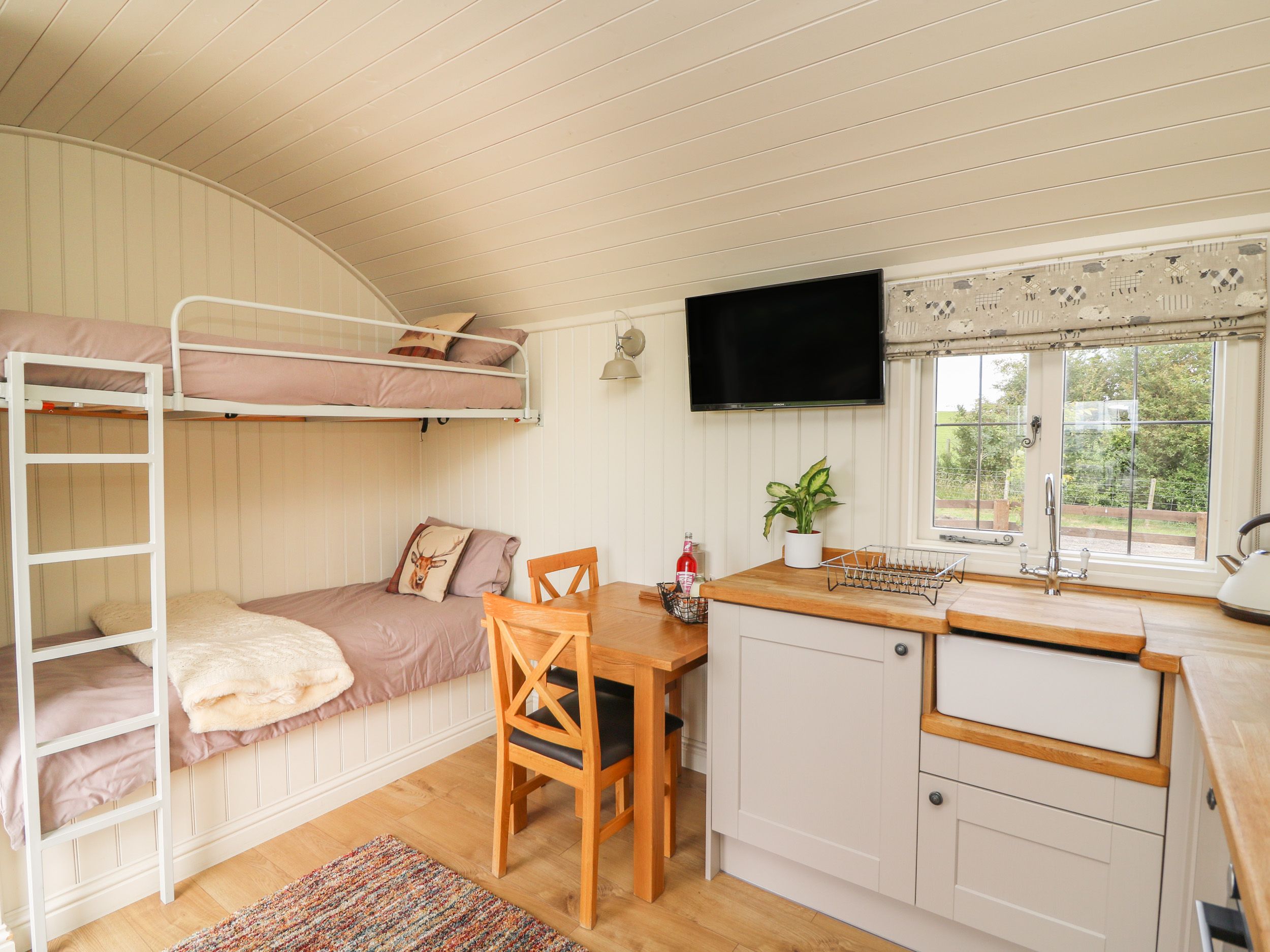 Accomodation Details All-ground-floor. One double bedroom. Open-plan lounge, kitchen with dining area with sofa bed converting into adult sized bunk beds. Shower room with shower, basin and WC.