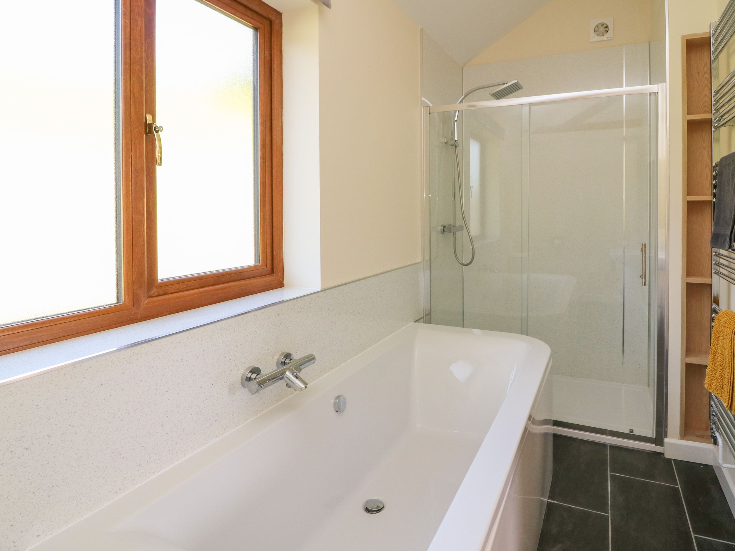 Accomodation Details All-ground-floor. Two bedrooms: 1 x king-size, 1 x twin (zip/link, can be super-king-size on request). Bathroom with bath, separate walk-in shower, basin and WC. Open-plan living space with kitchen, dining area and sitting area with woodburning stove. Utility
