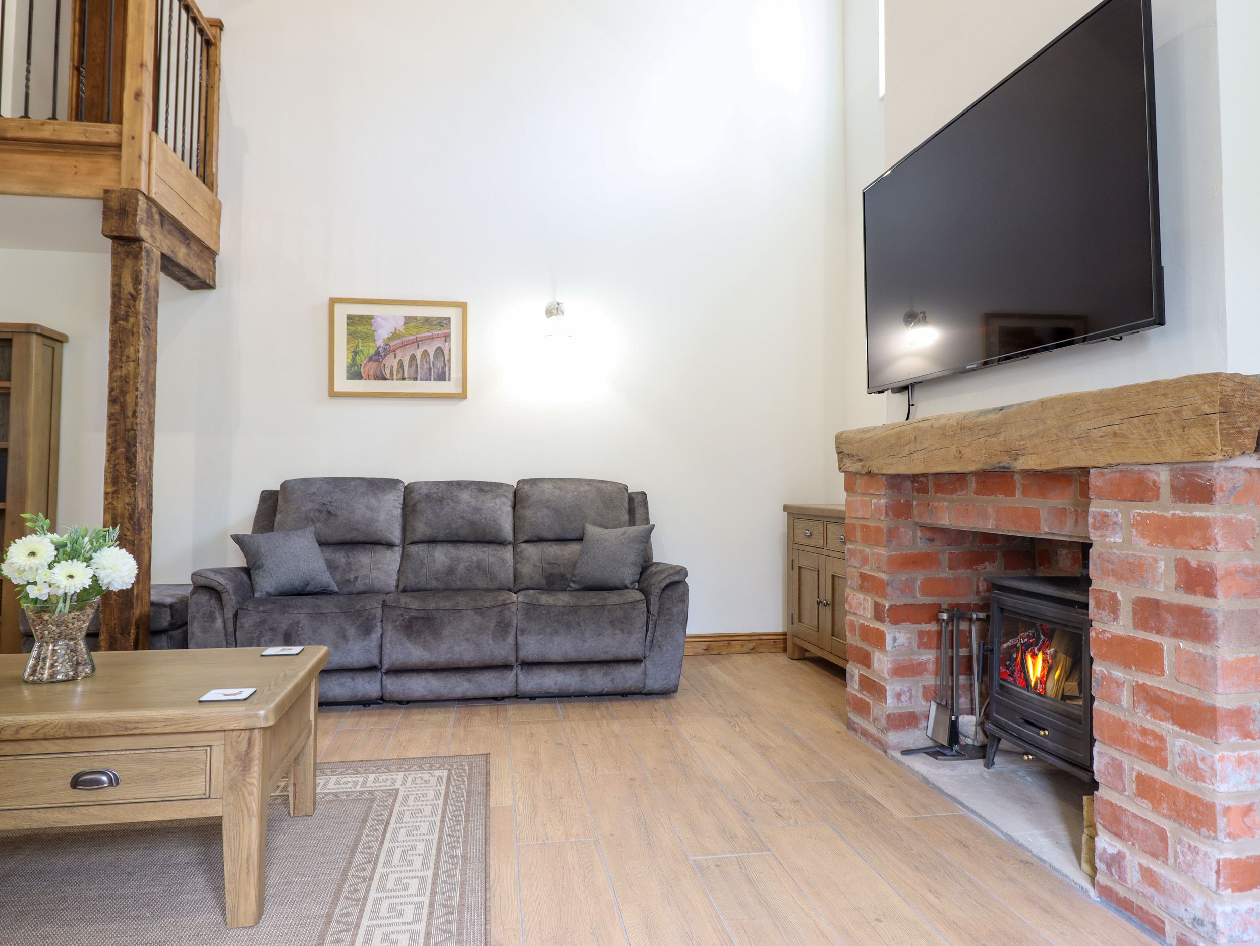 Amenities Oil central heating with underfloor heating on ground floor. Double electric oven and hob, airfryer, microwave, fridge/freezer, washer/dryer, dishwasher, kettle, toaster, coffee machine, wine chiller. 3 x Smart TV, DVD player, Bluetooth speaker, WiFi, selection of DVDs, books, and games. Fuel, power, starter pack for woodburning stove inc. in rent. Bed linen and towels inc. in rent. Highchair and travel cot available. Private driveway parking for 8 cars. Enclosed patio with furniture, hot tub and barbecue. Four well-behaved pets welcome. Sorry, no smoking. Shop 2.9 miles, pub 5.4 miles. Note: There is underfloor heating downstairs. Note: A selection of games are available at the property.