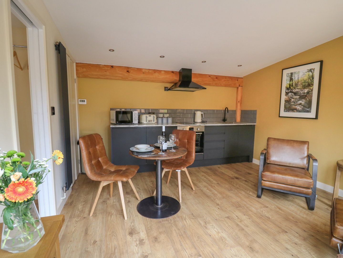Holiday home The living areas in this single-storey property consist of an open-plan living space with kitchen equipped with electric oven and 2-ring hob, microwave, fridge, a dining area with seating for two guests and a sitting area with Smart TV. There is one double bedroom with en-suite shower rooms. Outside there is a private front gravelled area with furniture and fire pit, and ample off-road parking is available. Within 0.1 miles you will find a shop and pub and within 0.4 miles, a river, and please note that one well-behaved dog is welcome but sorry, no smoking. WiFi, fuel, power, bed linen and towels are all included in the price. Escape to Mid Wales with a stay at Rhosyn.