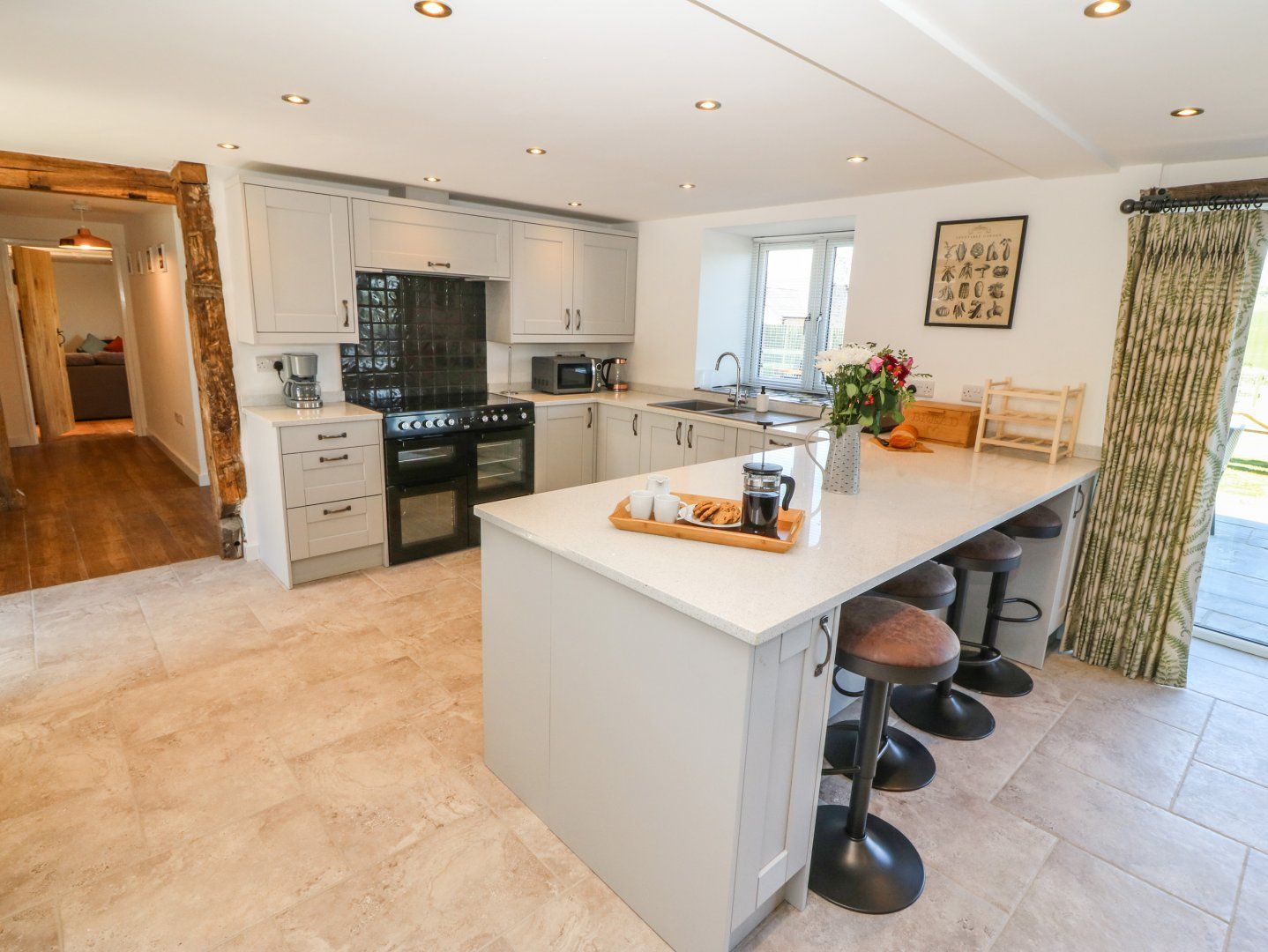 Accomodation Details Over two floors. Five bedrooms: 1 x family bedroom with super-king-size bed (zip/link bed, can be twin on request) and single day bed with en-suite walk-in shower, basin and WC, 1 x super-king-size (zip/link bed, can be twin on request) with en-suite bathroom with bath, walk-in shower, double basin and WC, 2 x super-king-size (1 can be zip/link and twin on request) with en-suite walk-in shower, basin and WC, 1 x ground-floor super-king-size (zip/link bed, can be twin on request) with en-suite wet room with walk-in shower, basin and WC. Kitchen/diner. Utility/cloakroom with basin and WC. Sitting room with woodburning stove