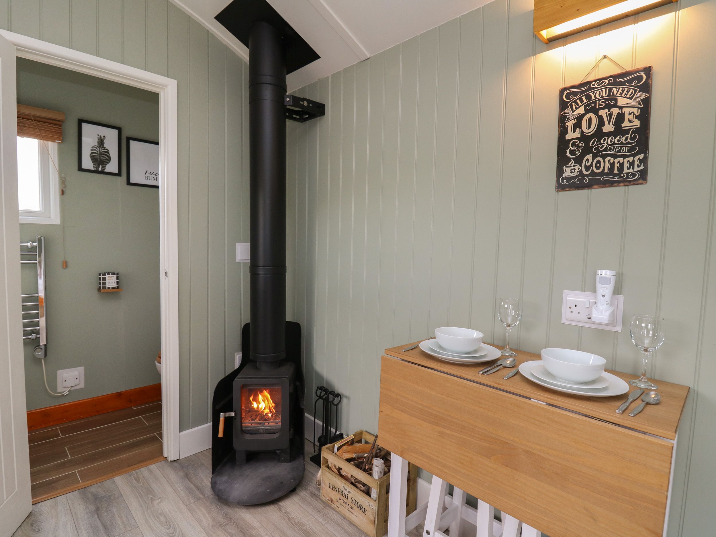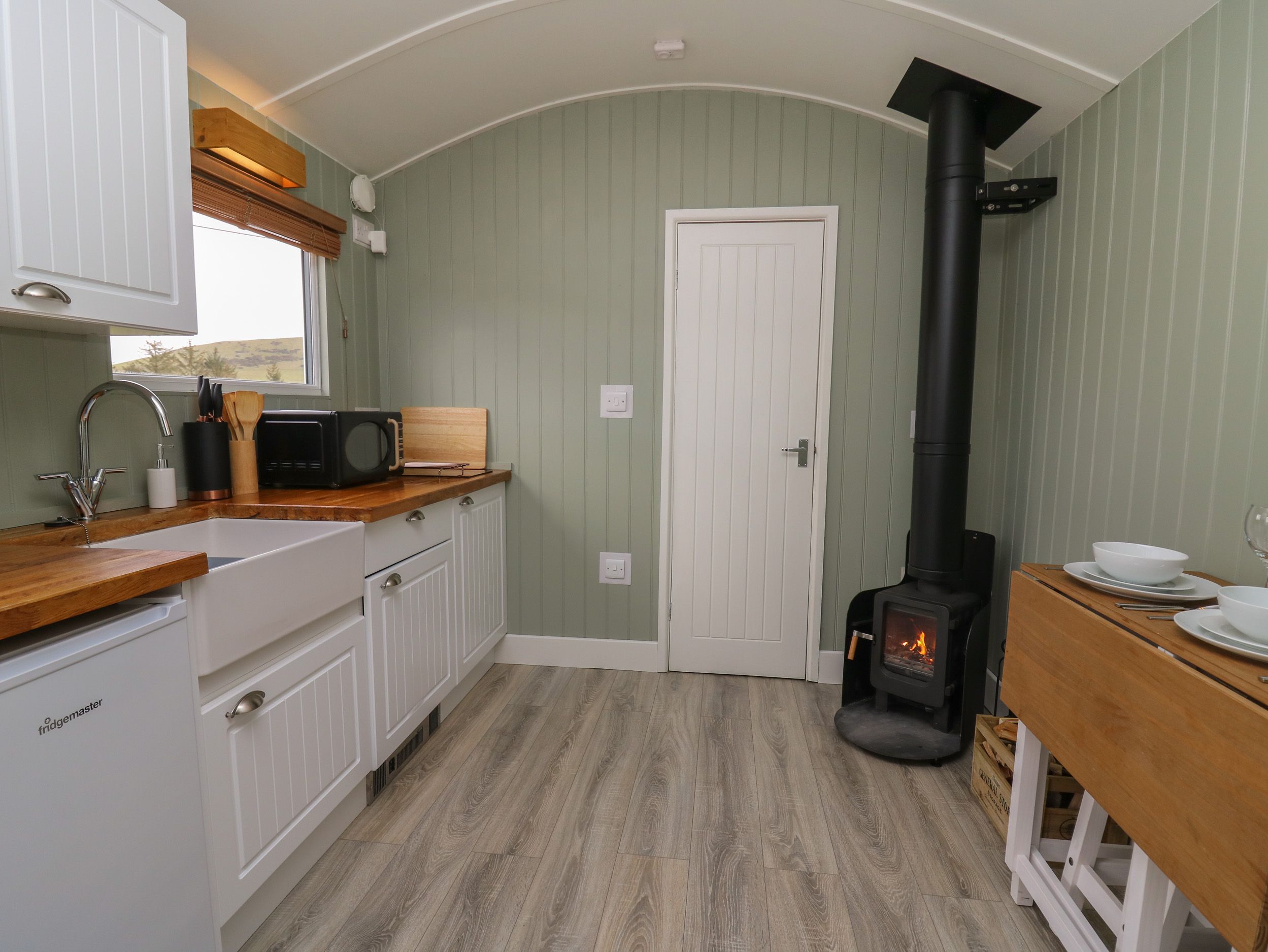 Accomodation Details Single-storey. Studio-style layout with king-size bed, kitchen, and dining area with woodburning stove. Shower room with walk-in shower, basin, heated towel rail and WC