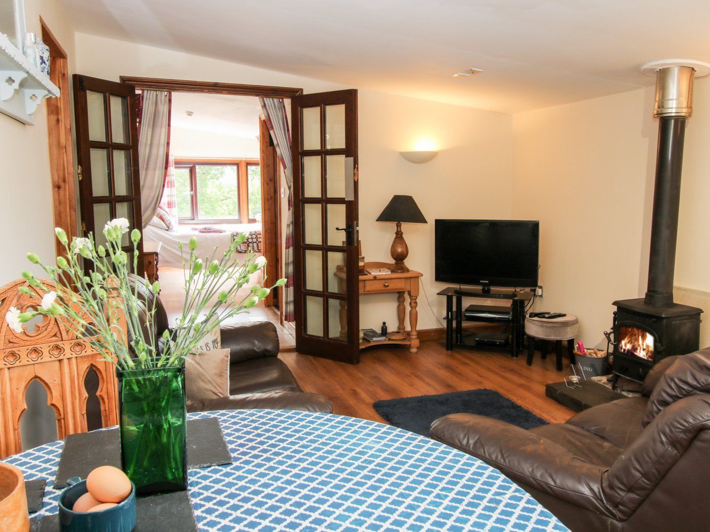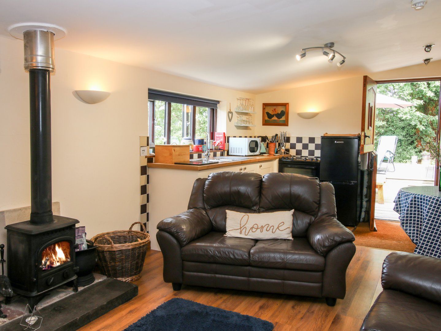 Single storey. One double bedroom with en-suite walk-in shower, basin and WC. Open-plan living space with kitchen, dining and sitting area with woodburning stove. Cinema room