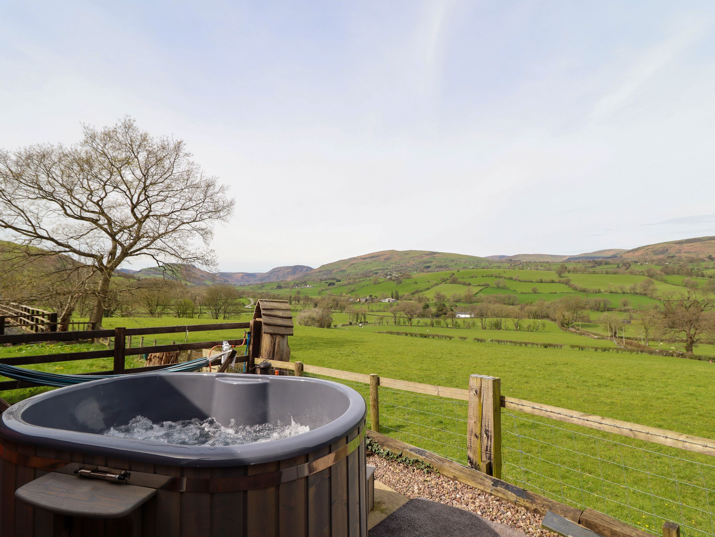 The open-plan living space includes a kitchen with electric oven and hob, microwave, fridge, freezer, dining seating and a sitting area with woodburning stove and TV with Sky. There is a double bedroom with en-suite shower, basin and WC and air con unit/heater. To the outside is off-road parking for one car and a decking and patio with furniture and barbecue. WiFi, fuel, power, bed linen and towels are included in rent. One well-behaved small dog allowed. Sorry, no smoking. Within 1.7 miles there is a shop and pub. The Retreat enjoys a peaceful setting in Wales. Please note there is limited headroom in some parts. Please note: wood fired Hot Tub with jets and lighting will be available at the property from 2024 onward.