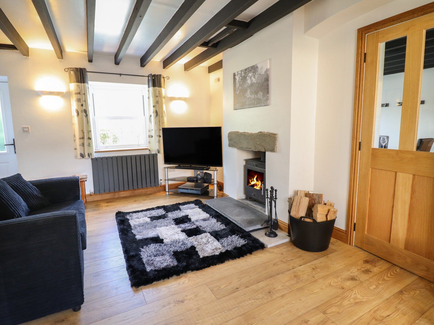 Amenities Central heating with woodburning stove. Electric oven and hob, microwave, fridge, freezer, washing machine, dishwasher. Smart TV, WiFi, selection of books and games. Fuel, power and starter pack for woodburning stove inc. in rent. Bed linen and towels inc. in rent. Off-road parking for 3 cars. One small/medium well-behaved dog welcome. Front garden with gravel and seating, rear enclosed multi-level garden with lawn, gravel, patio and furniture. Bike storage available. Sorry, no smoking. Shop 2.2 miles, pub 1.3 miles