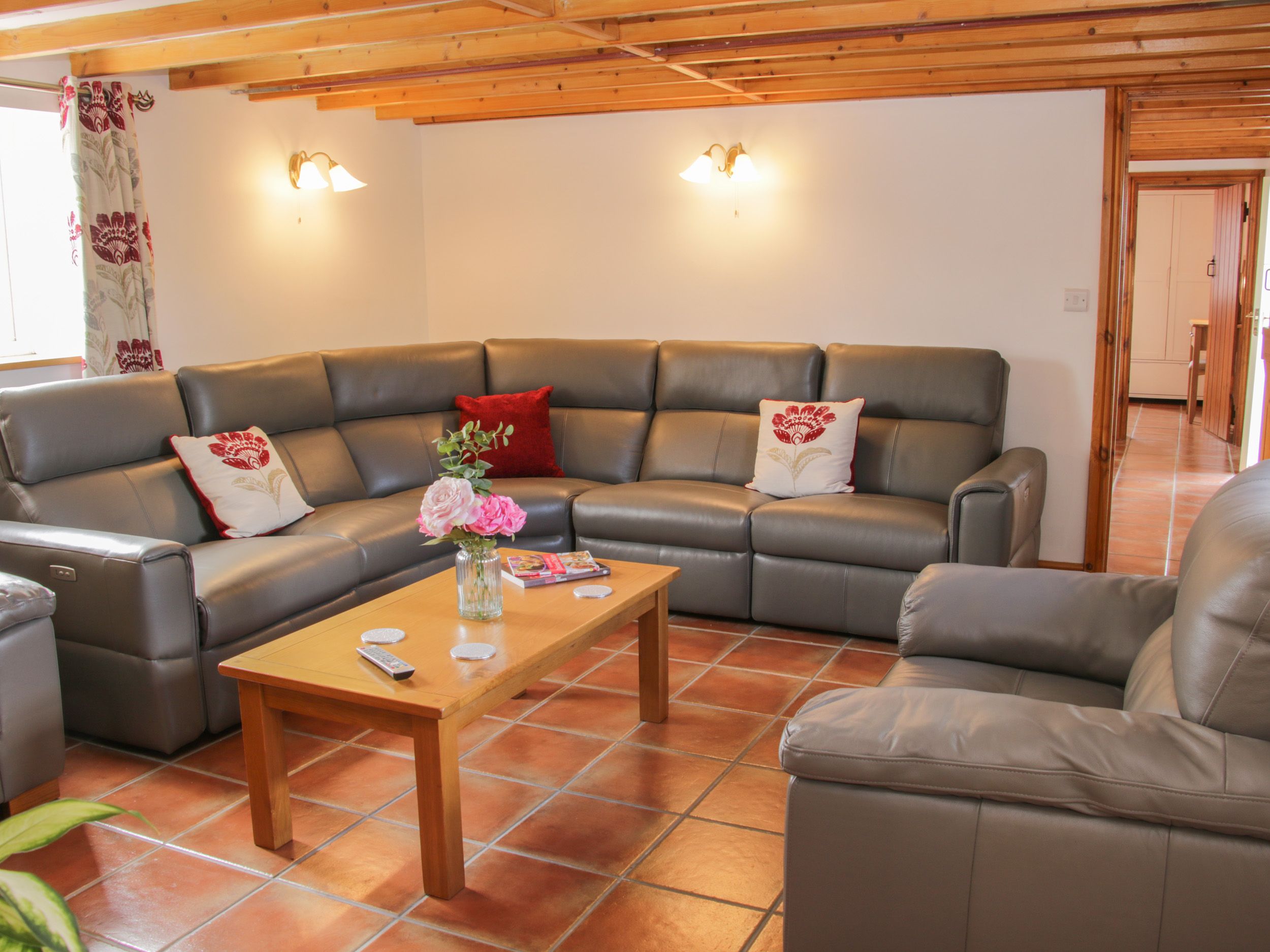 Four bedrooms: 1 x ground-floor king-size double, 2 x king-size double, 1 x twin. 1 x bathroom with bath, walk-in shower, basin, heated towel rail and WC,1 x ground-floor shower room with walk-in shower, basin and WC, 1 x shower room with walk-in shower, basin and WC. Kitchen/diner. Utility. Sitting room with woodburning stove