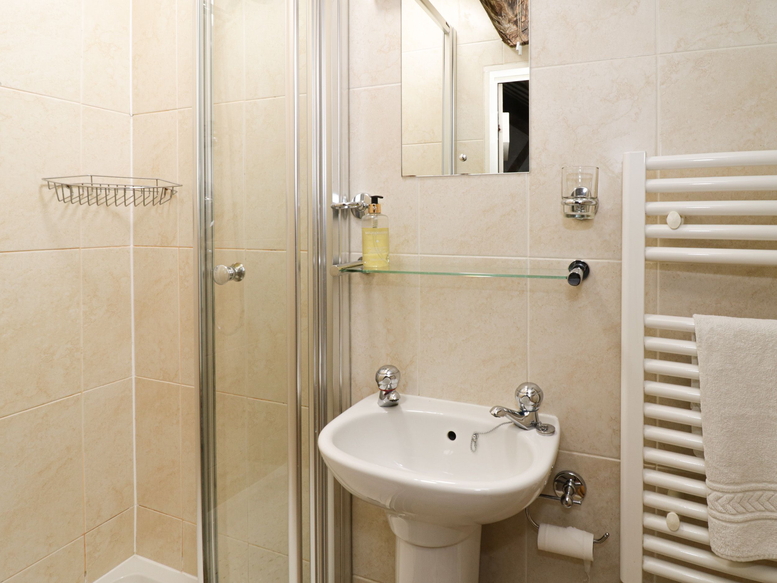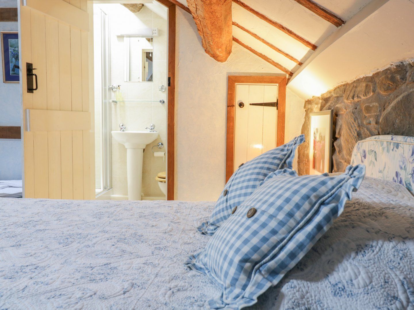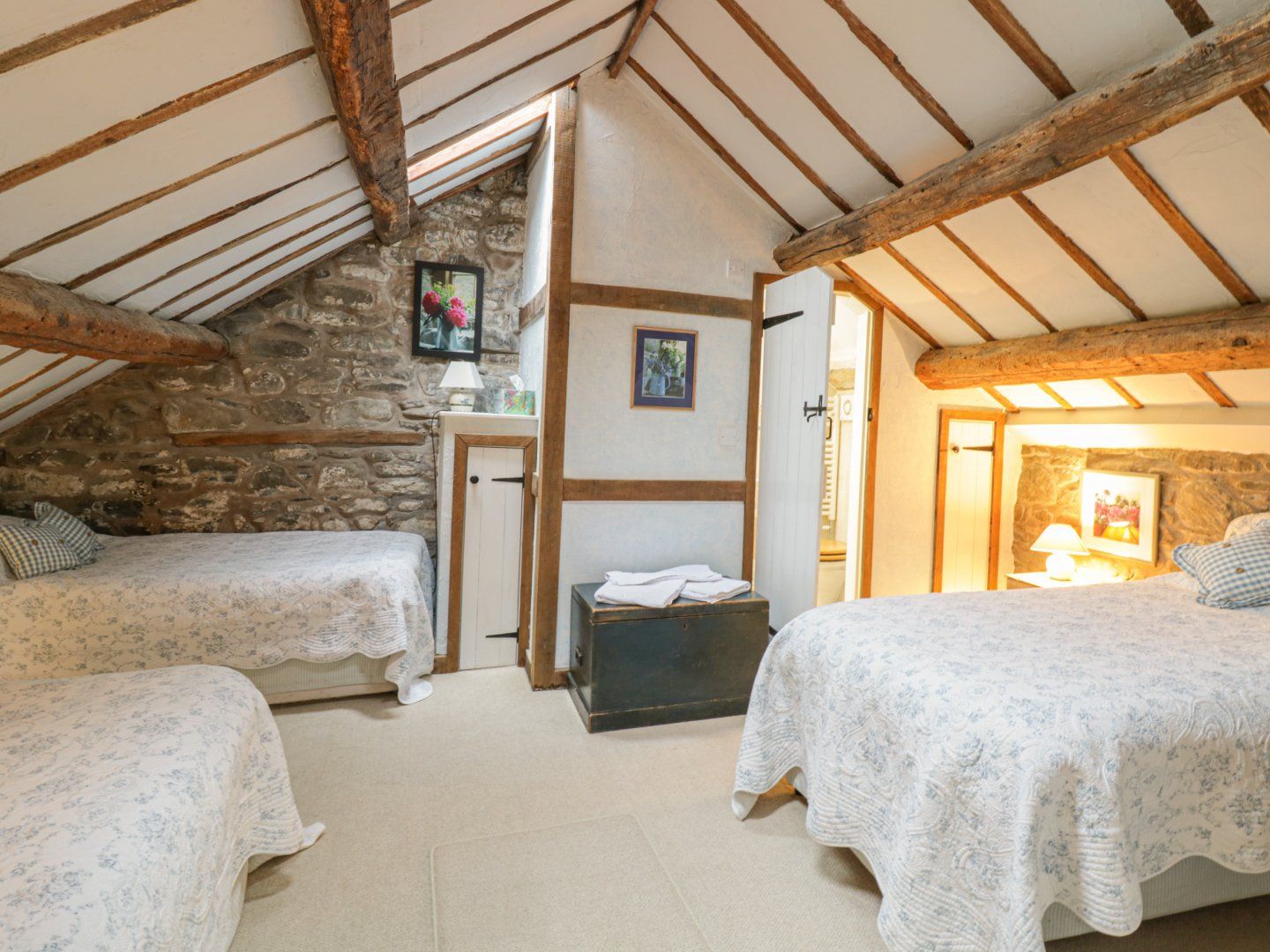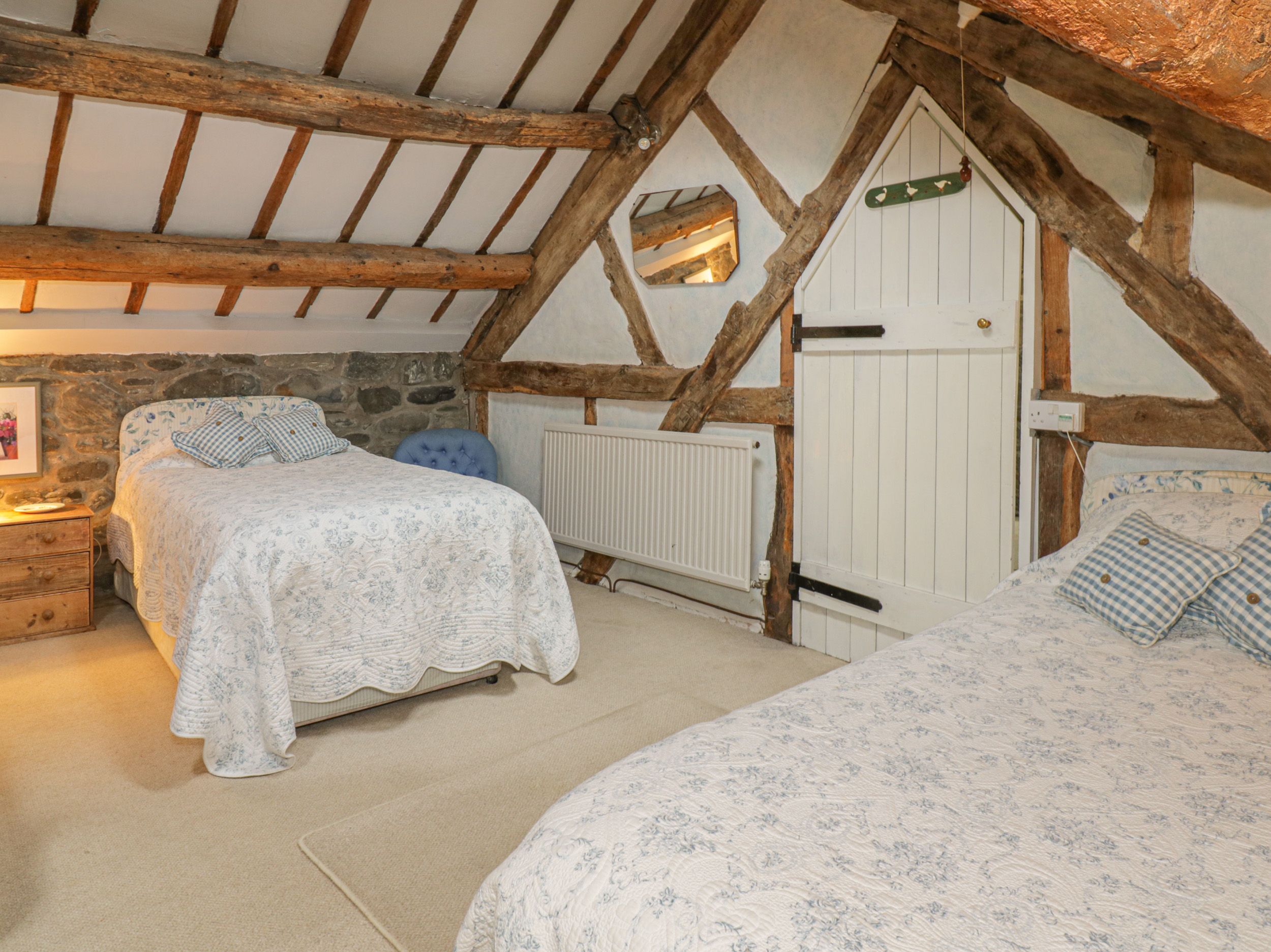 Accomodation Details Over two floors. Two bedrooms: 1 x 4’6” double, 1 x triple room with three 3’ singles and en-suite shower, basin and WC, 1 x 4’ double on landing bedroom. Ground-floor bathroom with bath, shower over, basin and WC. Kitchen/diner. Sitting room with Inglenook fireplace