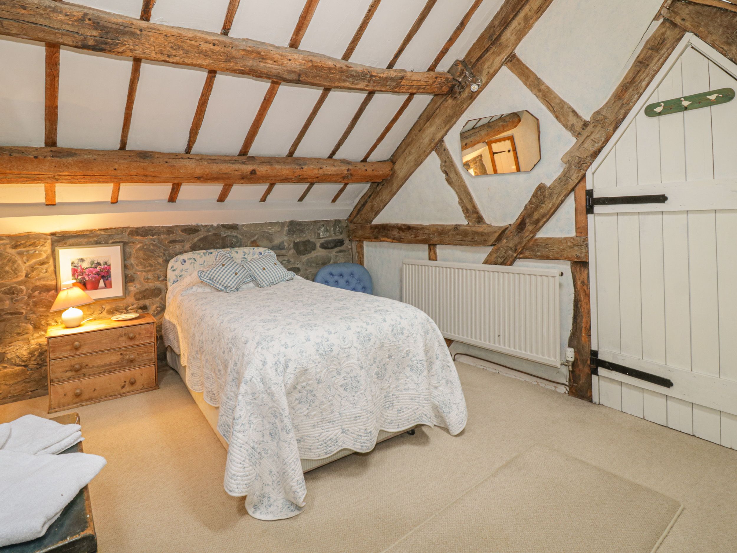 Amenities Calor gas central heating with Inglenook fireplace. Electric oven and hob, fridge/freezer, washing machine, microwave, dishwasher. TV and DVD player, WiFi. Fuel, power and starter pack for Inglenook inc. in rent. Bed linen and towels inc. in rent. Cot available. Off road parking for 4 cars. Large private outdoor seating area with garden furniture and barbecue. Two well-behaved pets welcome. Sorry, no smoking. Shop within 5.9 miles, pub within 1.8 miles. Note: There are slopes in the grounds and a small, shallow stream in the garden, children must be supervised. Note: The double bedroom with 4-foot double is on the landing space, please consider this when booking. Note: Property may not be suitable for guests with mobility issues, elderly or infirm as it has quite a steep entrance. Note: One basket of logs is free, on the other side any wood used is chargeable by the owner. Note: This property has a £20 pet supplement. Note: There is a fire starter pack, after this has been used, extra wood would be £5 from the owner. Please note this property can only accept bookings for a minimum of 3 nights. Note: this property has a 7 night minimum over the Christmas and New Years period.