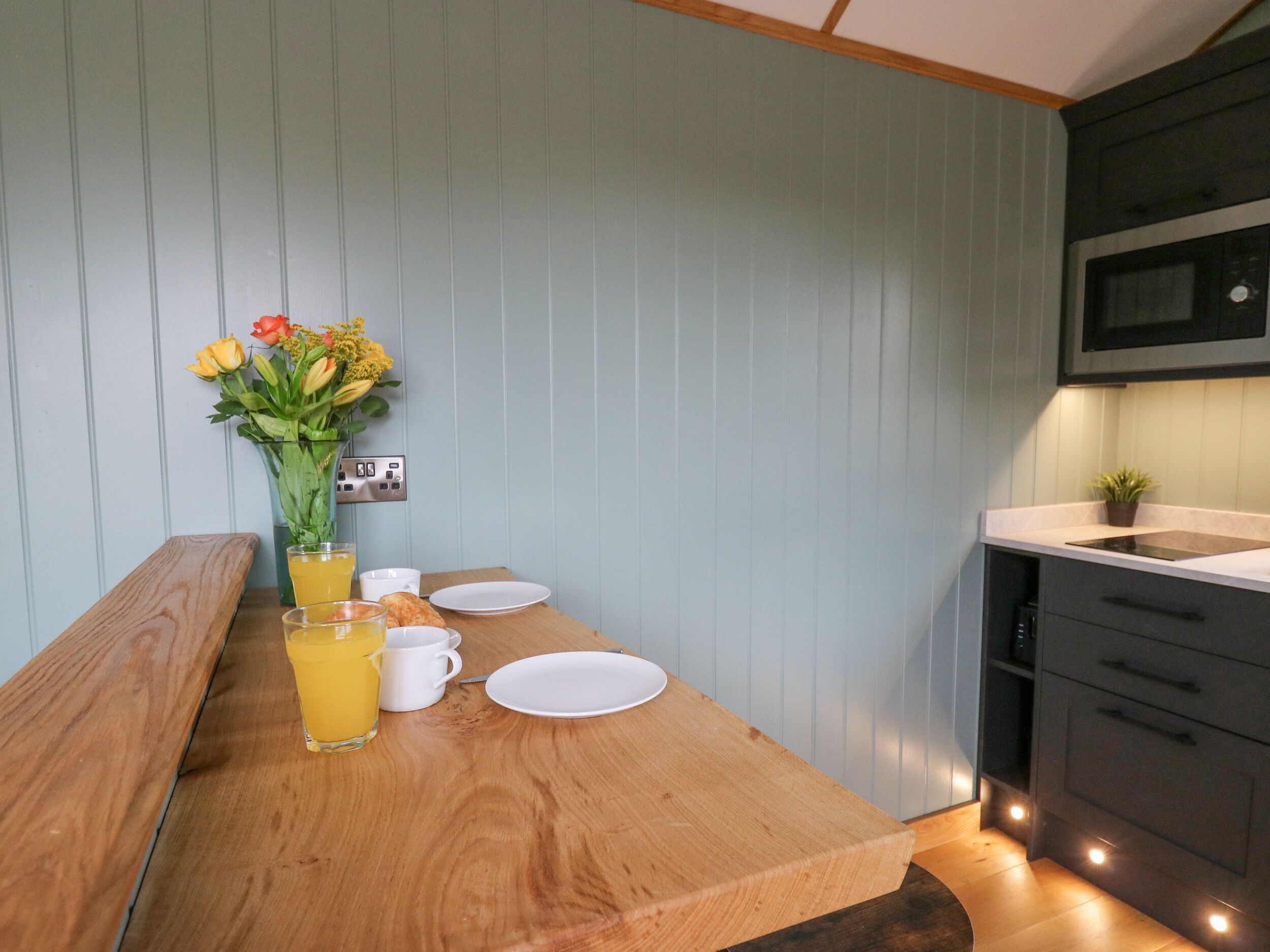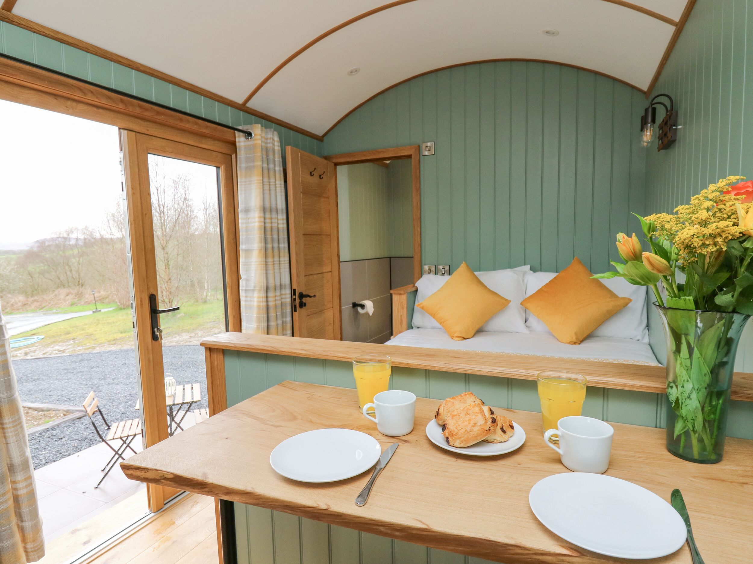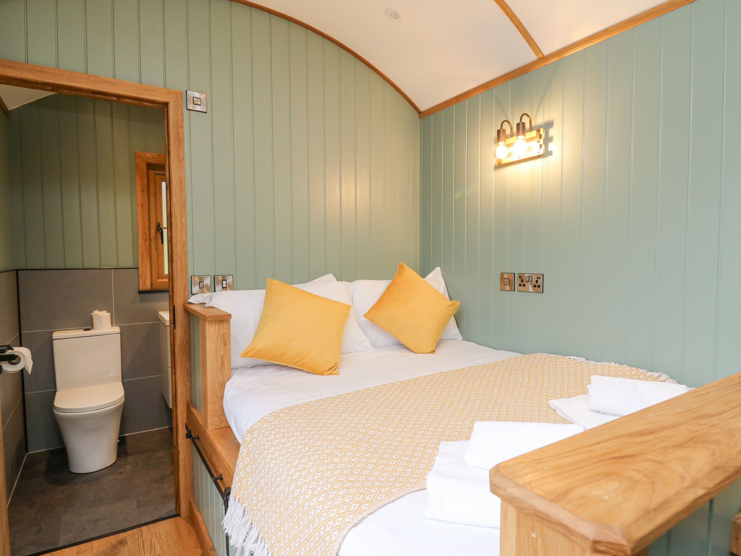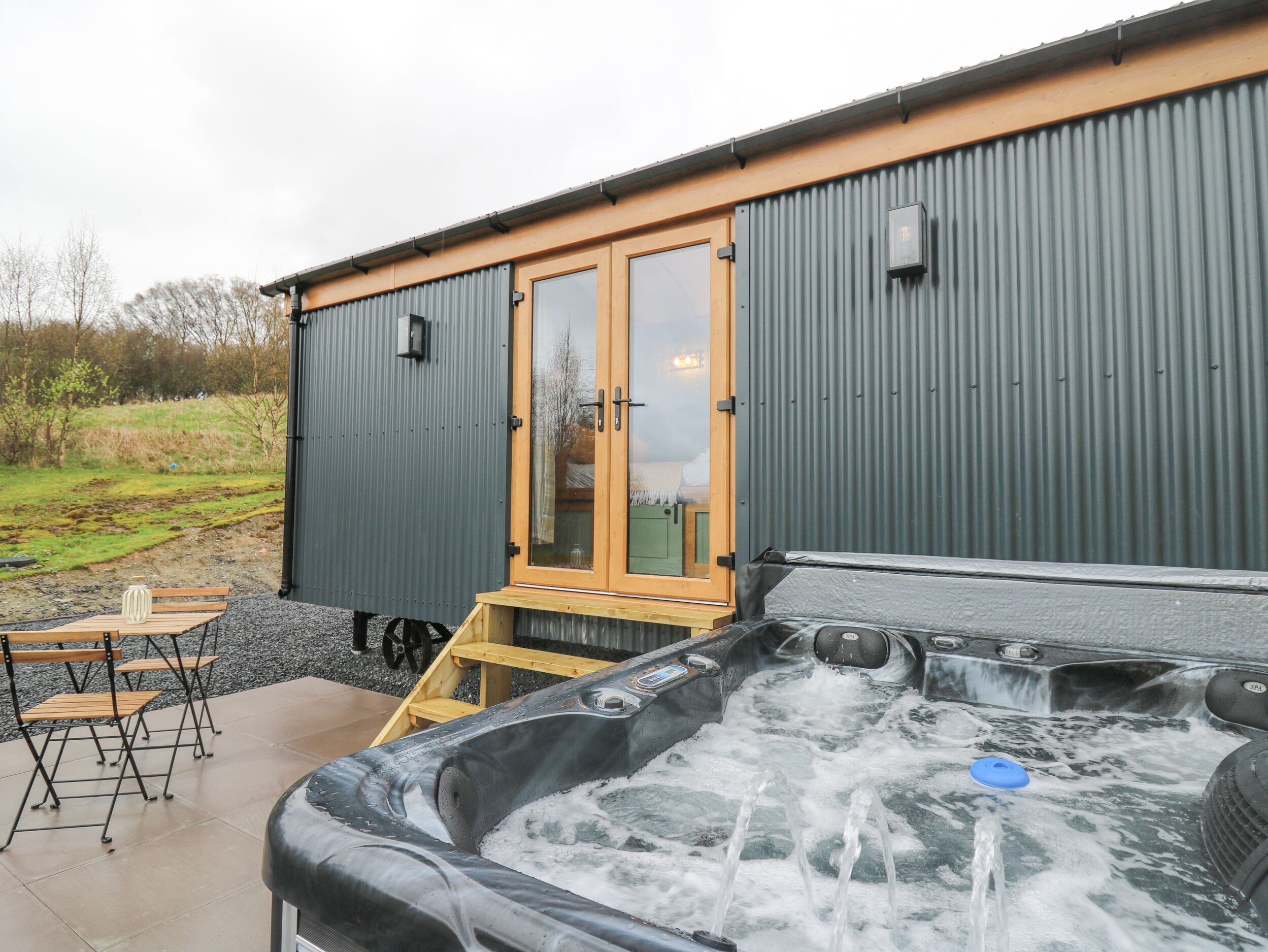 Holiday home Dam View Shepherds Hut has a studio-style layout with a double bed, kitchen equipped with 2-ring hob, microwave, air fryer, fridge with ice box, kettle and toaster and a dining area with electric flame-effect fire. There’s a shower room with walk-in shower, basin and WC. Electric central heating, WiFi, fuel and power, bed linen and towels are included in the rent. Outside there’s off-road parking for two cars and a non-enclosed front patio with furniture and hot tub. Sorry, no smoking. Shop 1.7 miles, pub 1.8 miles, river 1.8 miles. Come and enjoy at romantic escape at Dam View Shepherds Hut. Note: There are steps up to the hut.