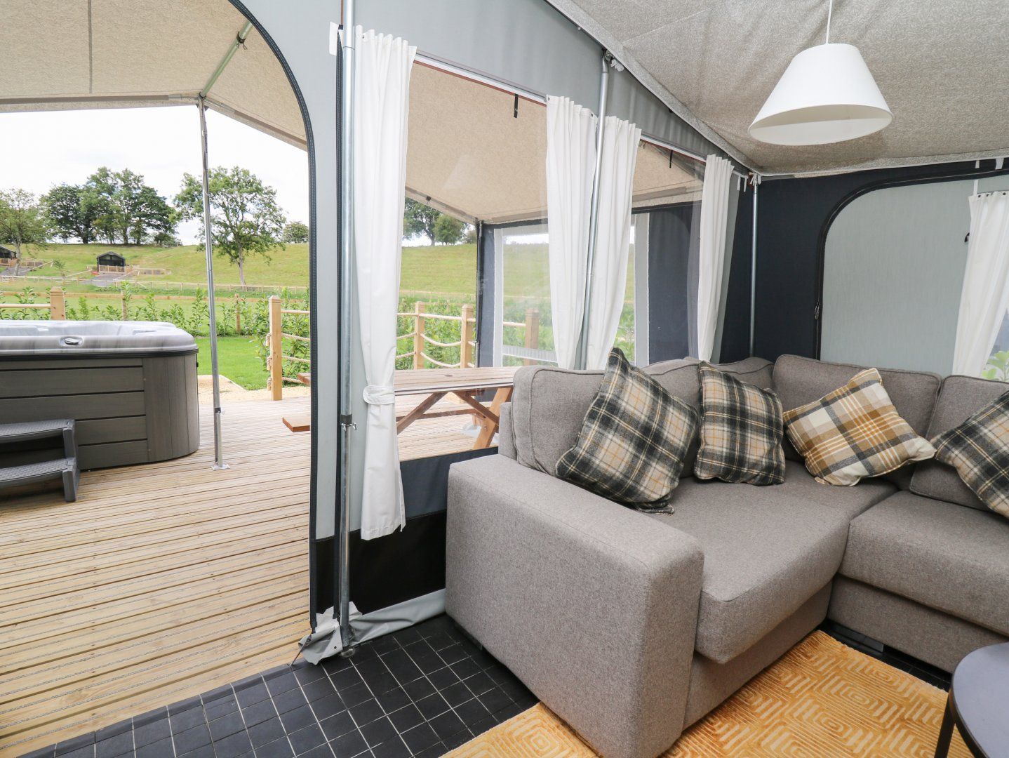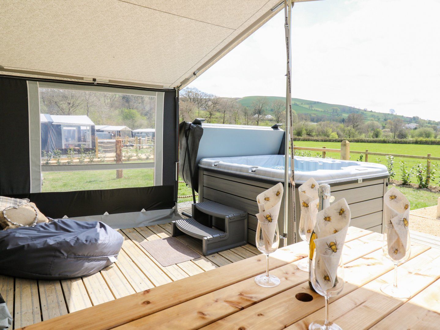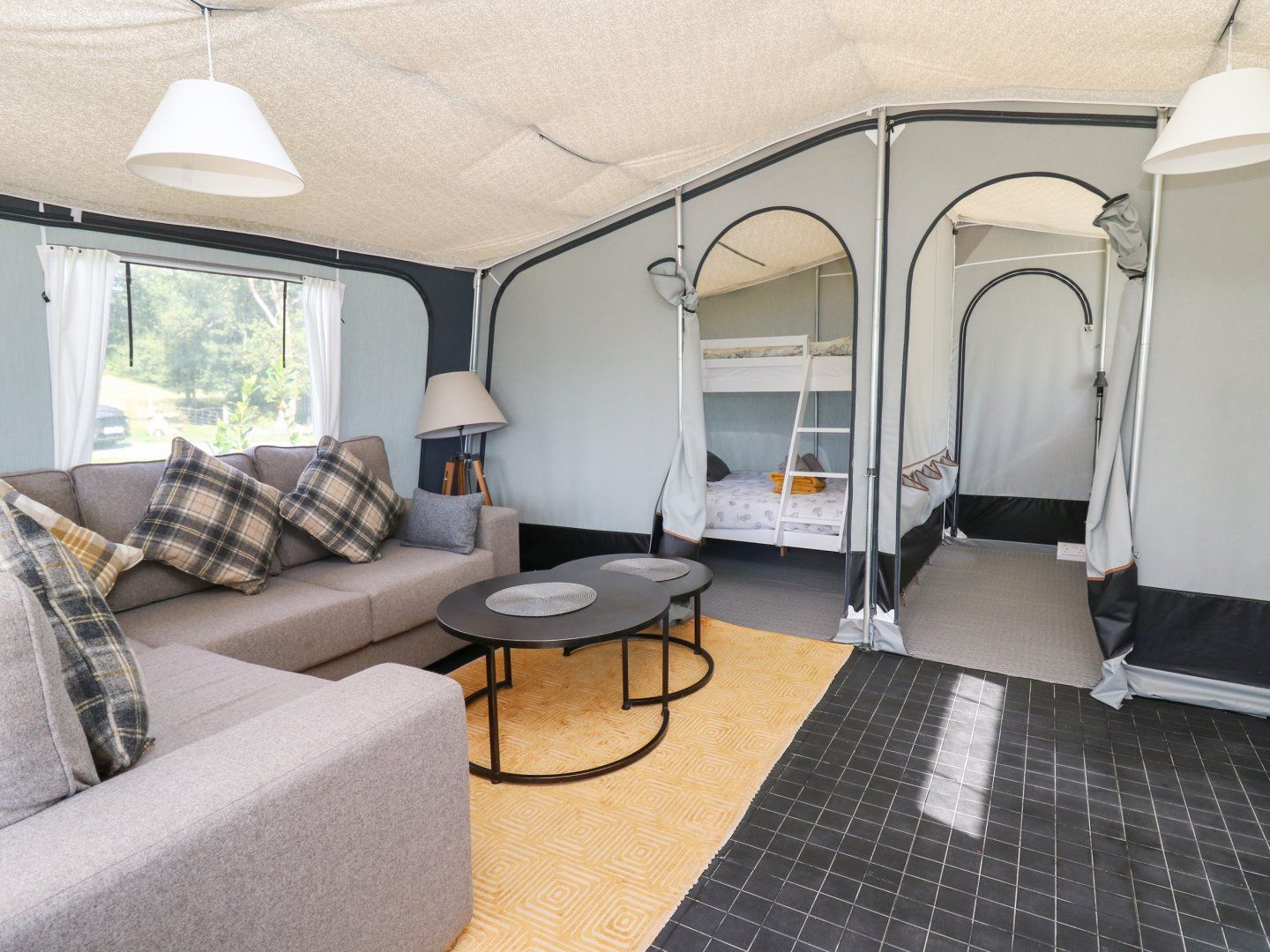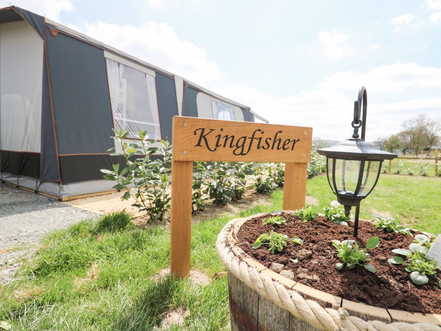 This glamping tent consists of a kitchen/living room with electric oven, two-ring hob, fridge with ice box and a sitting area with TV. The bedrooms consist of a double and a triple bunk and there are two shared, external shower rooms. Outside, there is a private garden area with a fire pit, furniture and hot tub, as well as off-road parking for one car. Fuel, power, bed linen and towels are all included in the price. Apologies, no pets and no smoking. Within 4.7 miles there is a shop and pub. The Kingfisher is a stylish glamping tent for both families and friends.