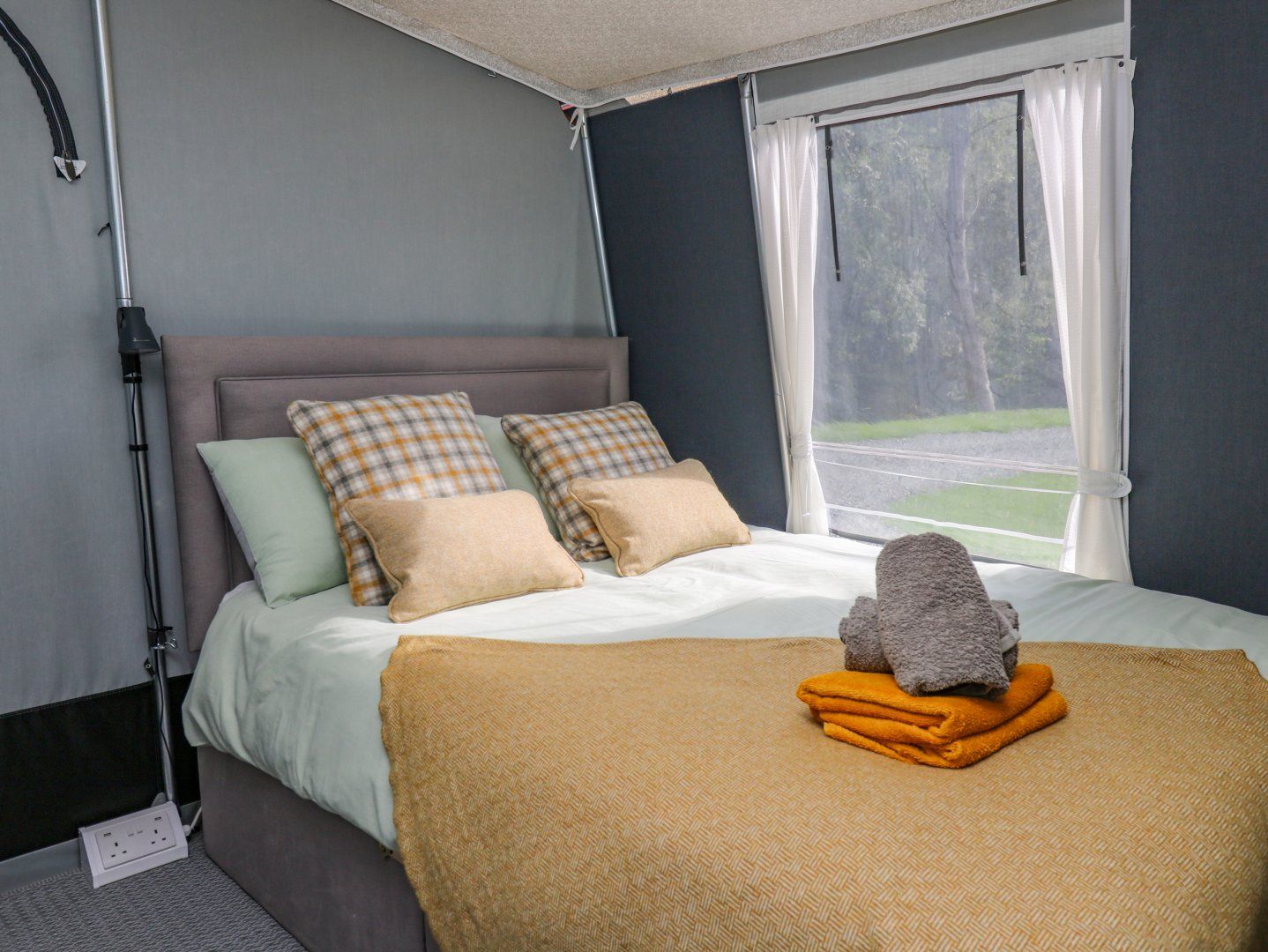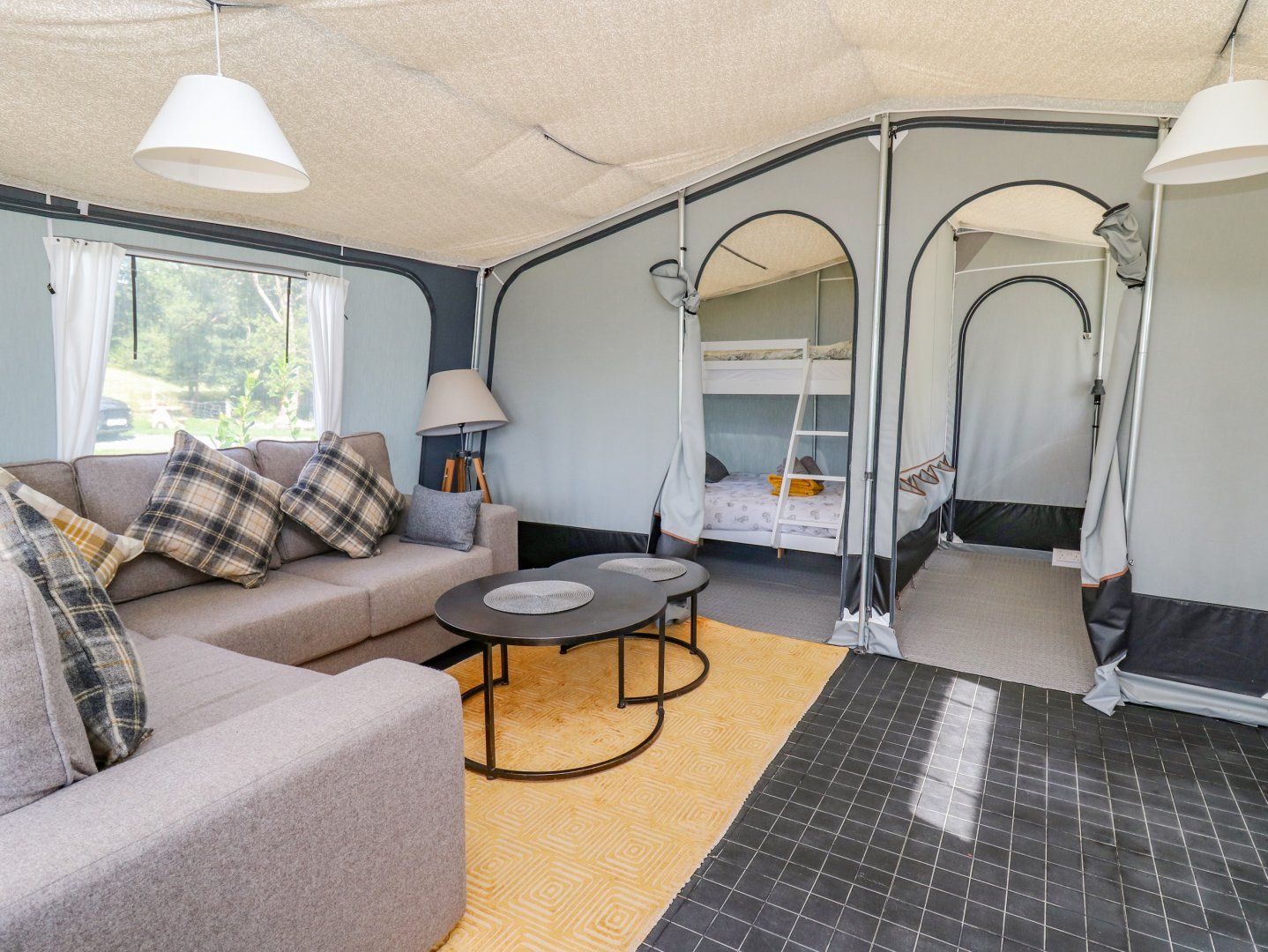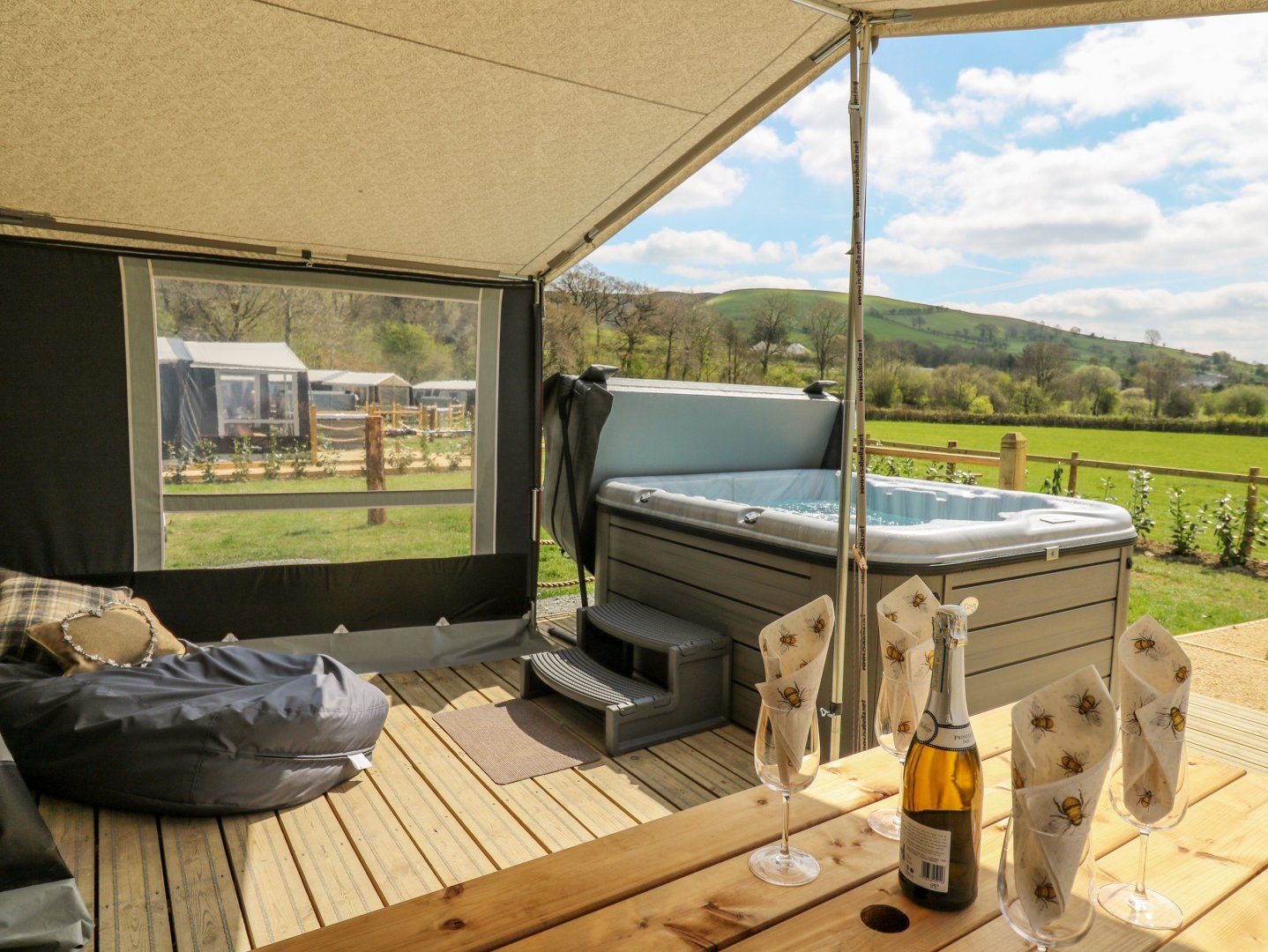Holiday home The living areas in this single-storey tent consist of a kitchen/living room with electric oven and two ring hob, fridge with ice-box and TV. The bedrooms consist of a double and a triple bunk both serviced by external showers with separate basin and WCs. Outside there is a covered, external dining area and decking with hot tub and firepit as well as off-road parking for one car. Within 4.2 miles there is a shop and pub. Sorry, no pets and no smoking. Fuel, power, bed linen and towels are all included in the price. The Salmon is a wonderful setting for a countryside retreat in Wales. Note: Bedrooms are accessed and separated by a zip door. Note: Shared shower and WC facilities.