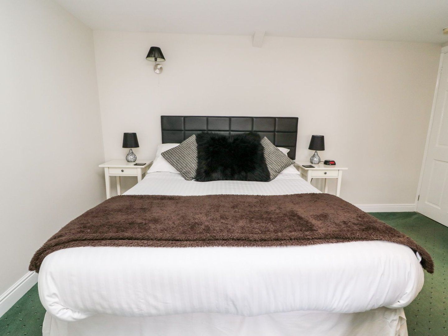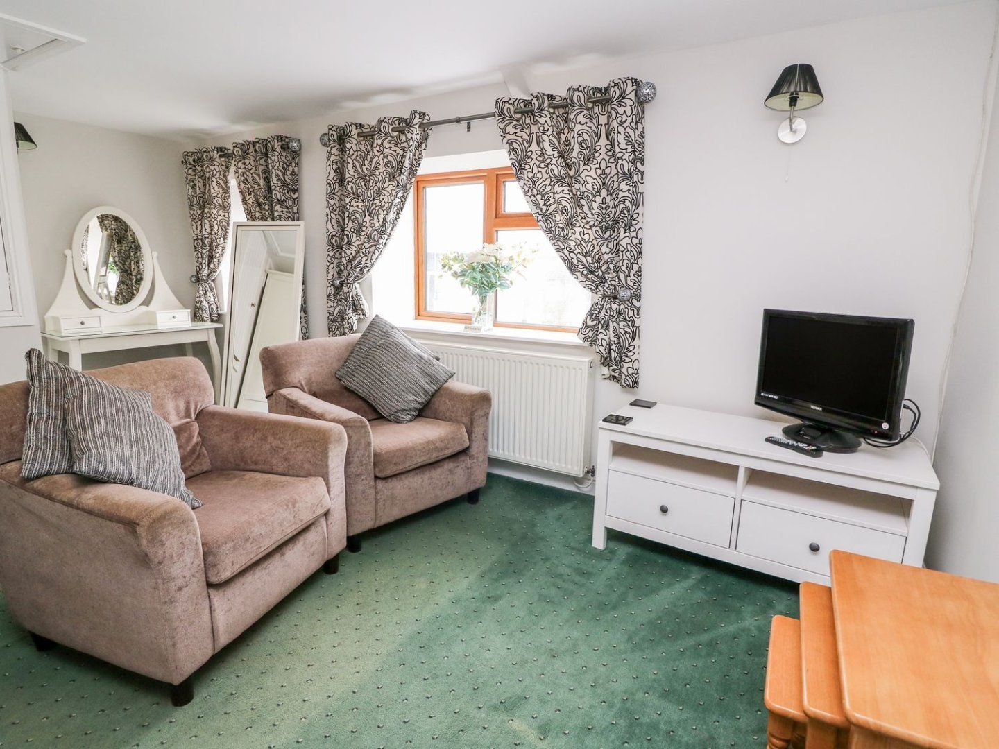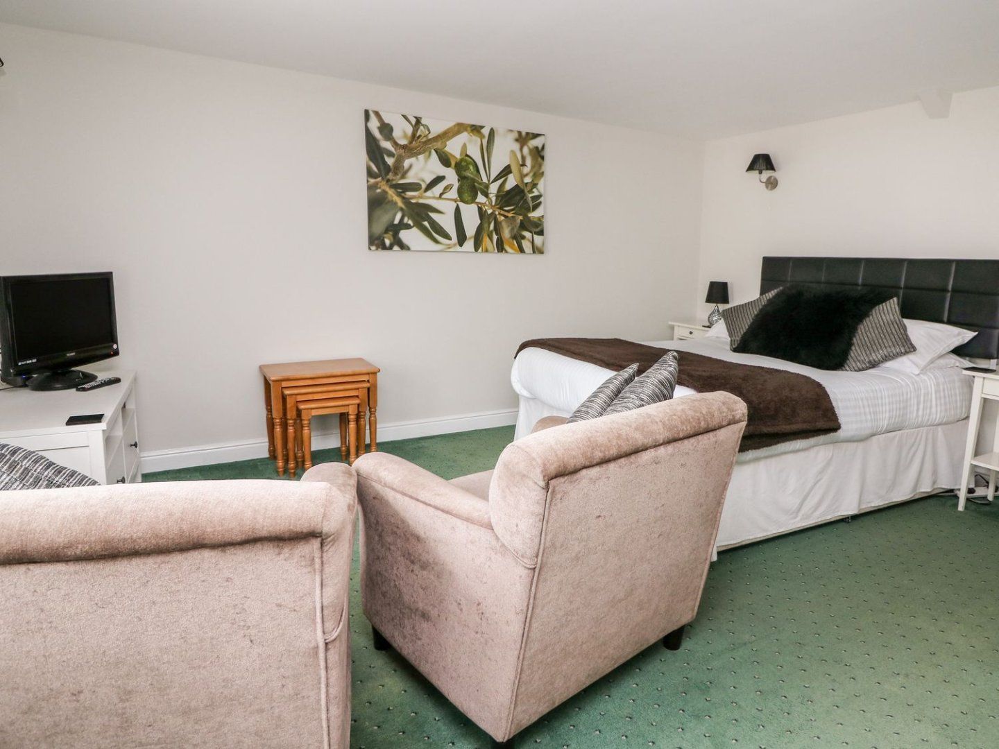 One king-size bedroom with sitting area and TV. Ground-floor shower room with shower, basin and WC. Kitchen/diner