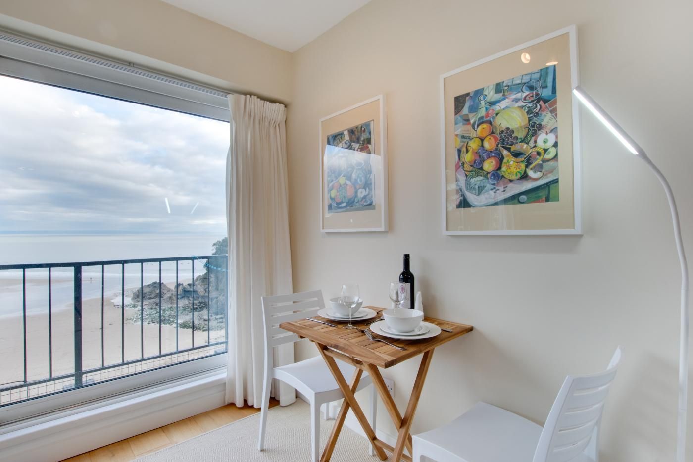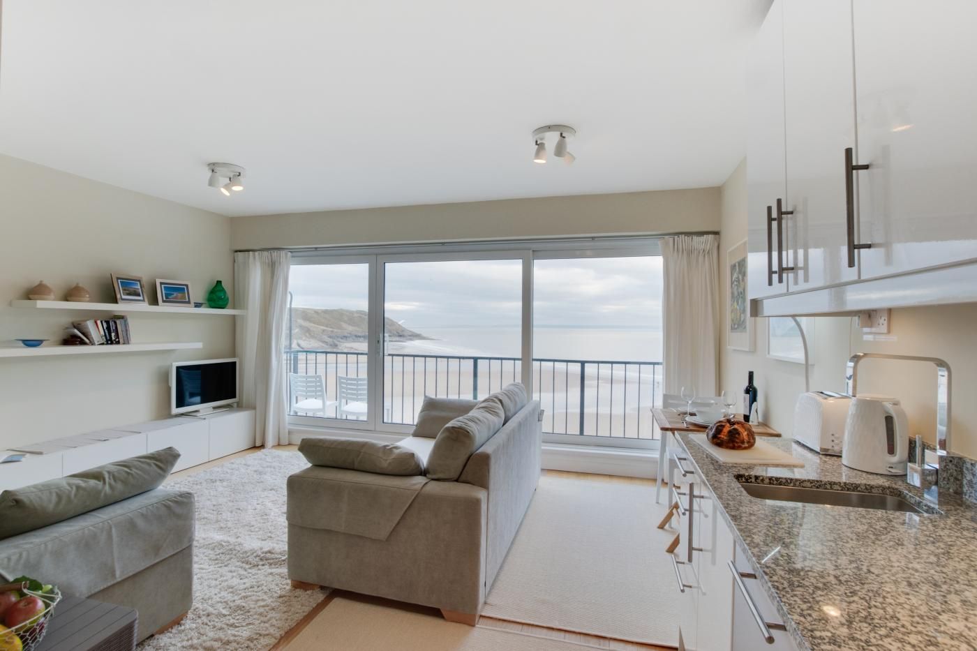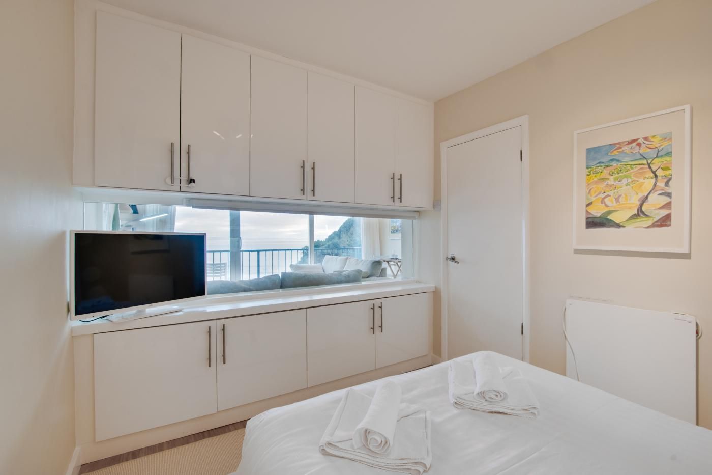 The large picture window in the bedroom means you can enjoy the uninterrupted sea views from almost every room as well as the full-width balcony. The open-plan layout and glossy kitchen cabinetry keep the living space bright and the wall-mounted cupboards in the bedroom means there is ample storage.