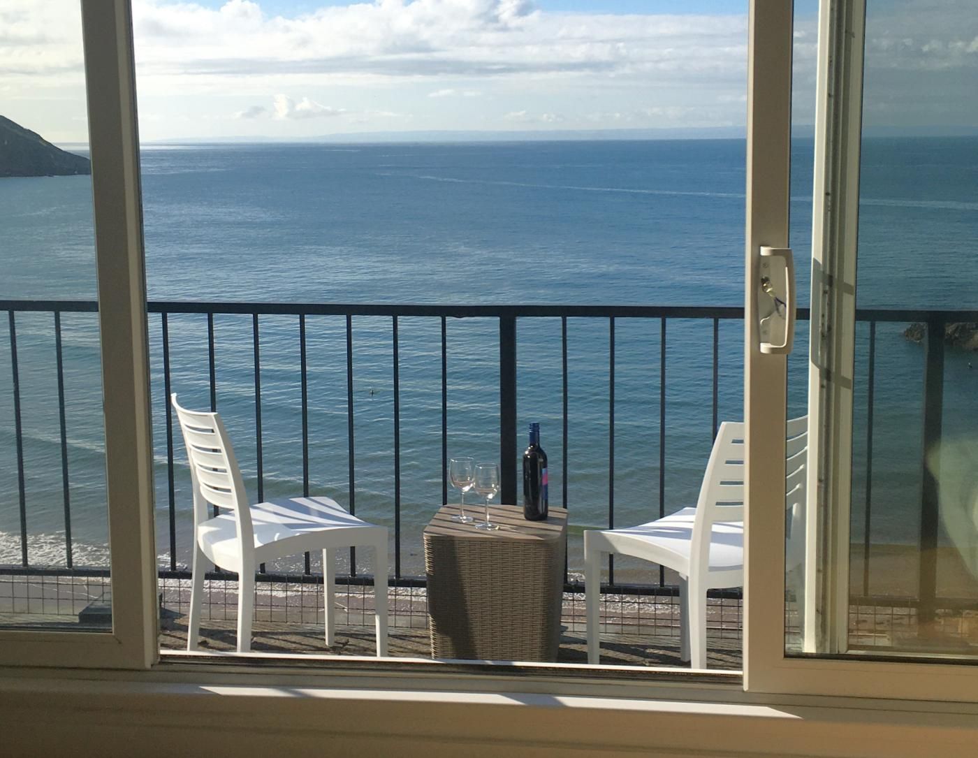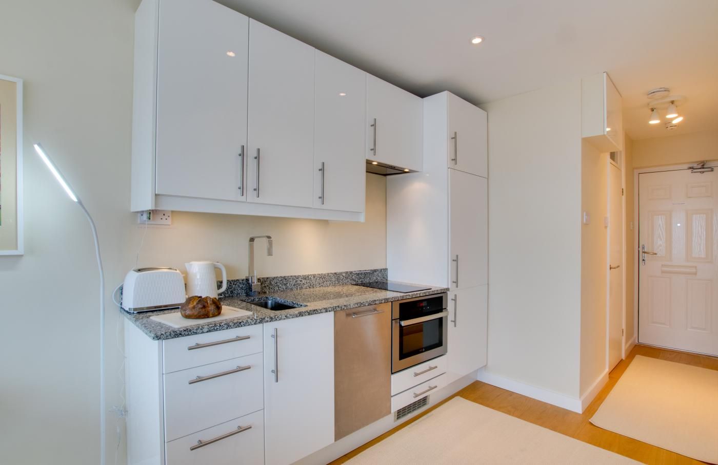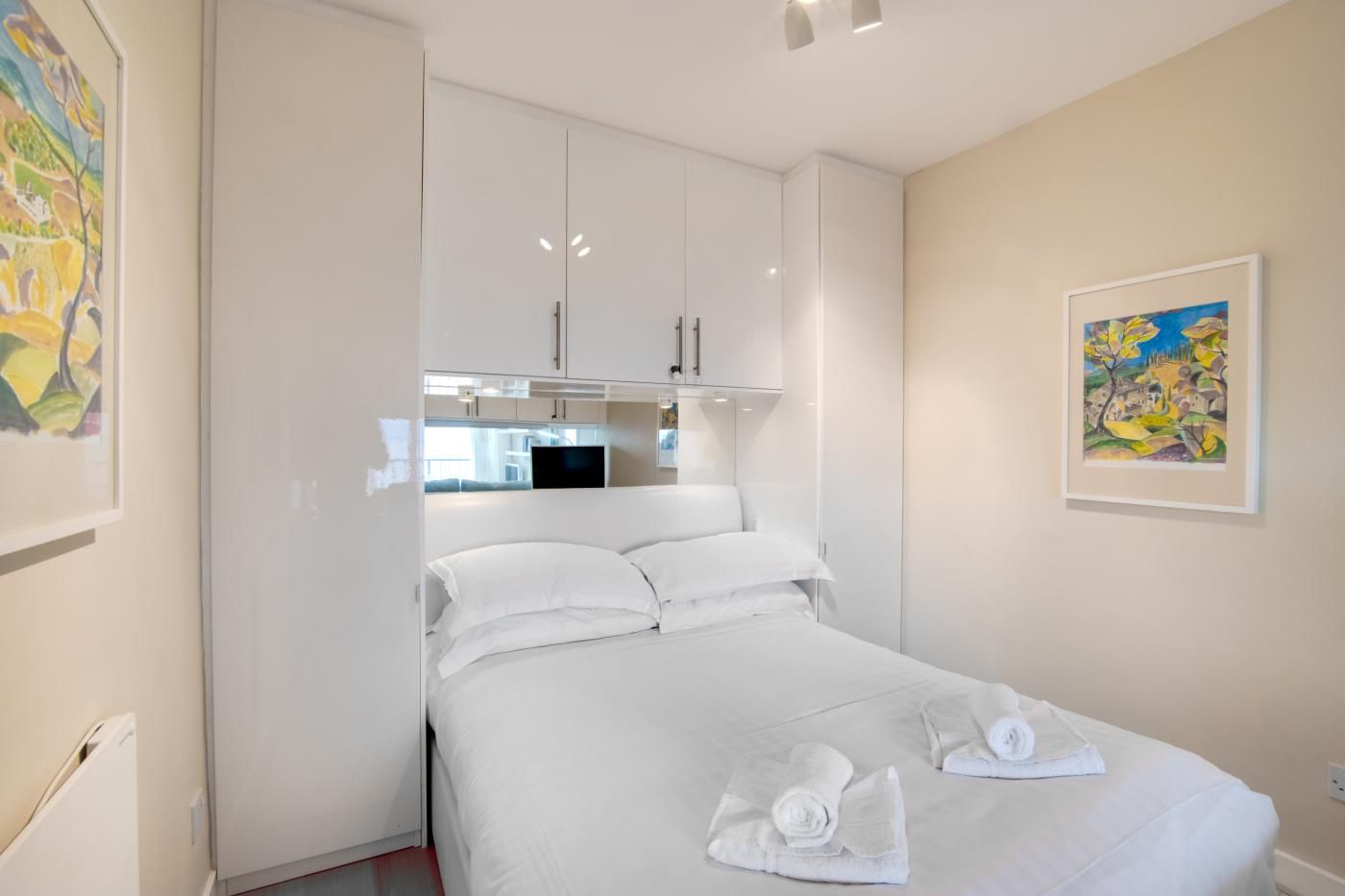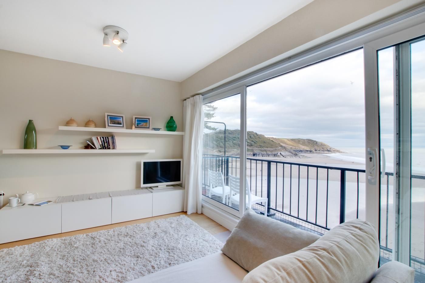 The large picture window in the bedroom means you can enjoy the uninterrupted sea views from almost every room as well as the full-width balcony. The open-plan layout and glossy kitchen cabinetry keep the living space bright and the wall-mounted cupboards in the bedroom means there is ample storage.