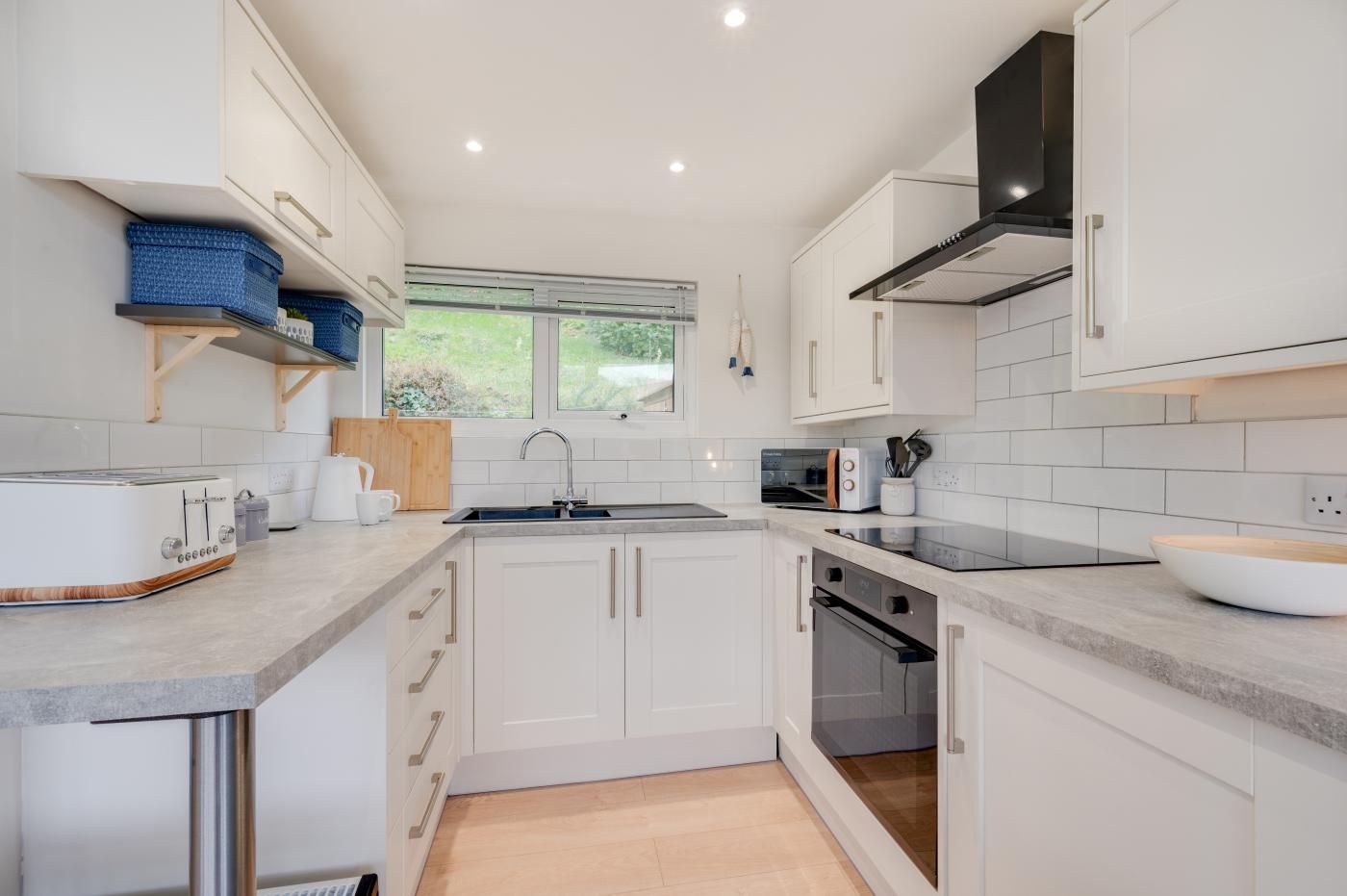 This holiday chalet features an open plan living, dining and kitchen area with wall-mounted TV, soft seating, stylish breakfast bar as well as dining table with chairs and a well-equipped kitchen. Two bedrooms provide comfortable accommodation for 4 people in a double bed and bunk bed.